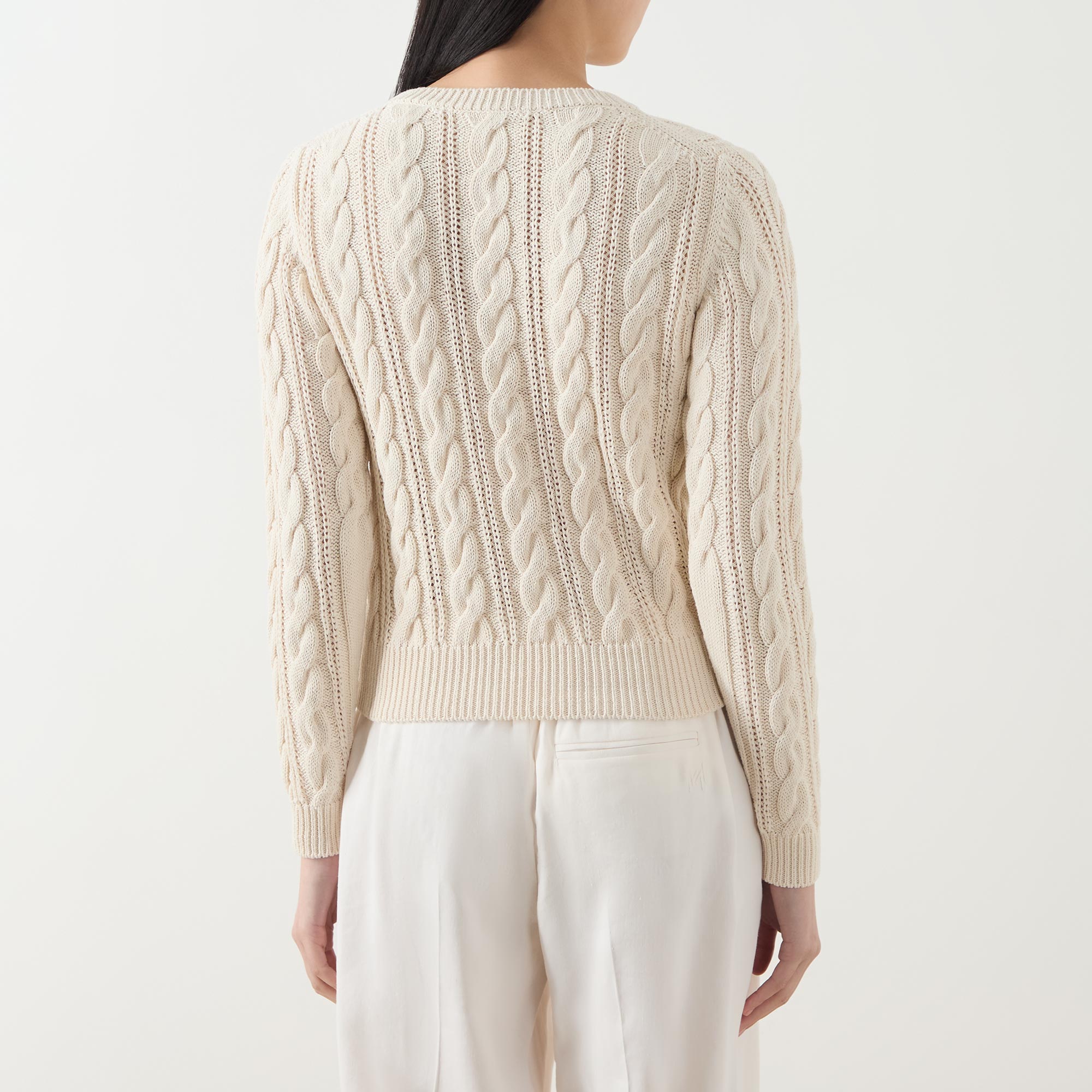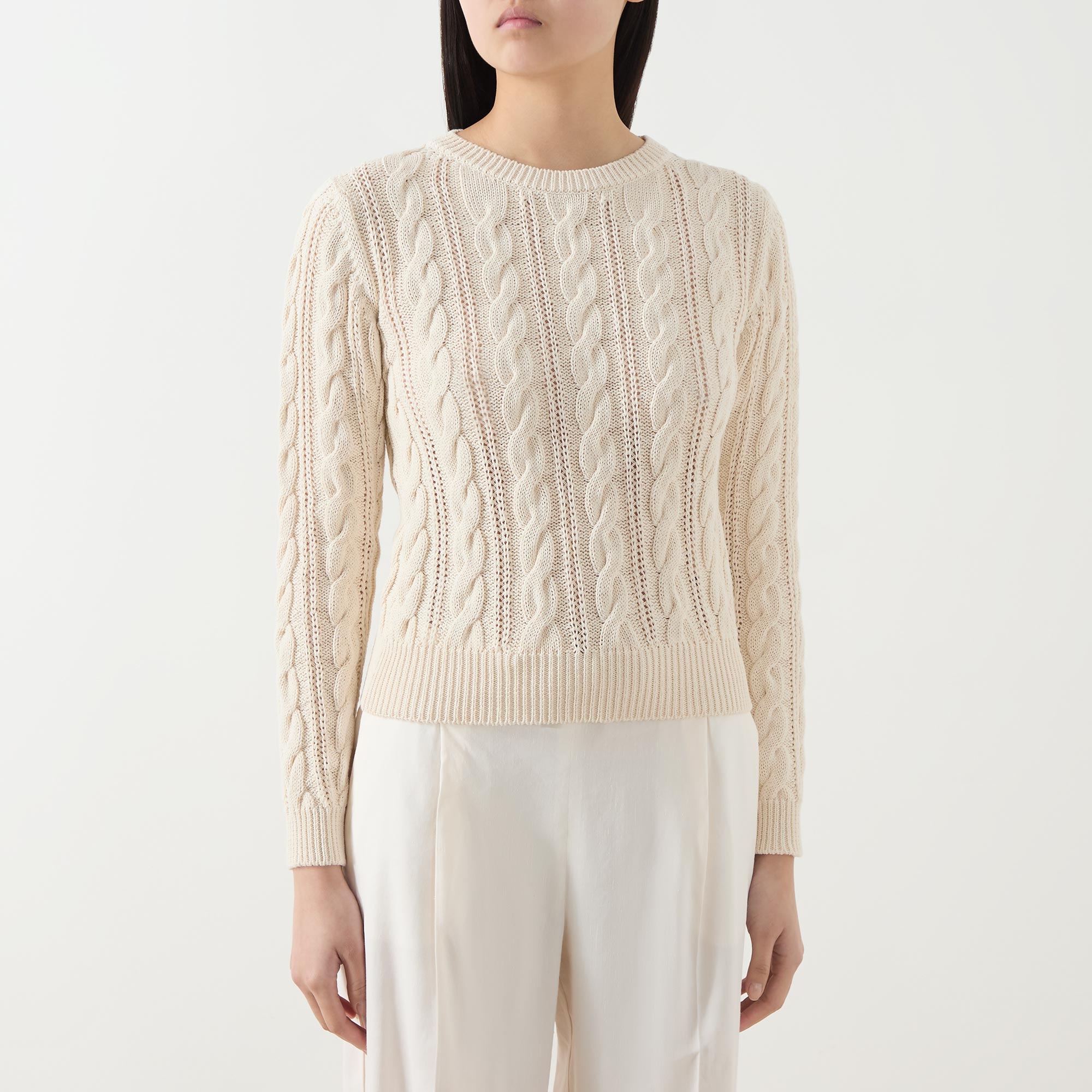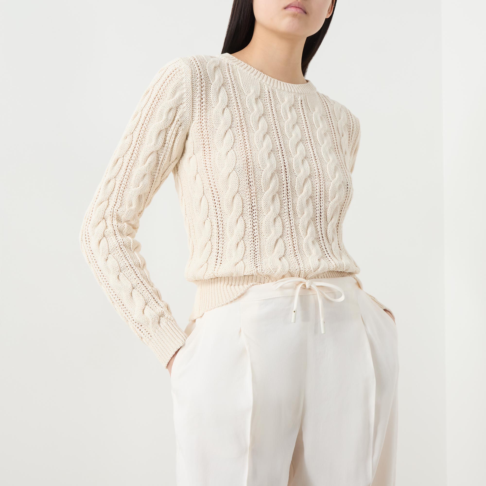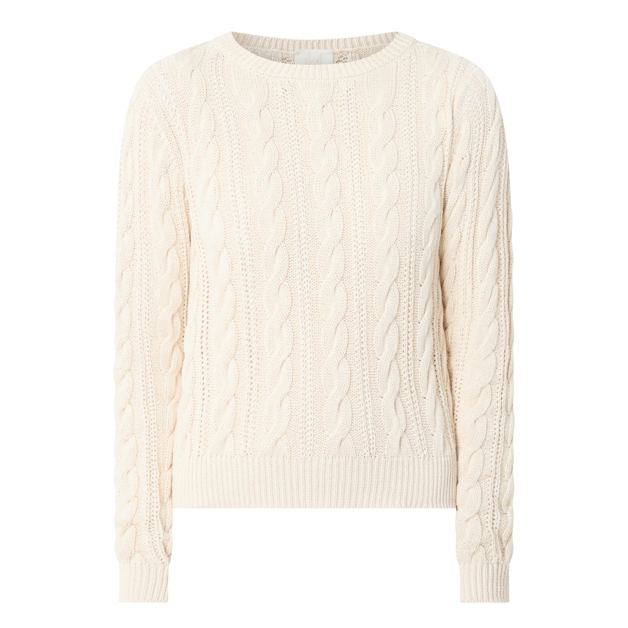 - Crew neck, long sleeves, straight hem, ribbed trims, cable-knit construction