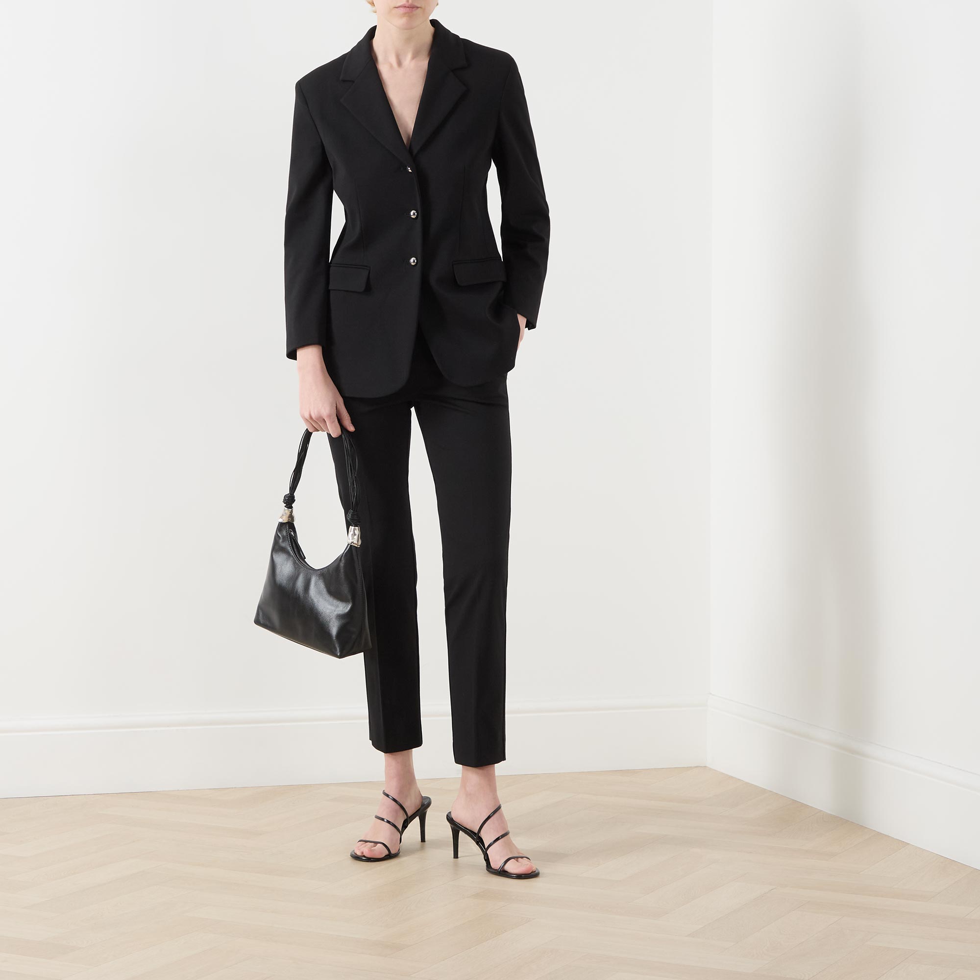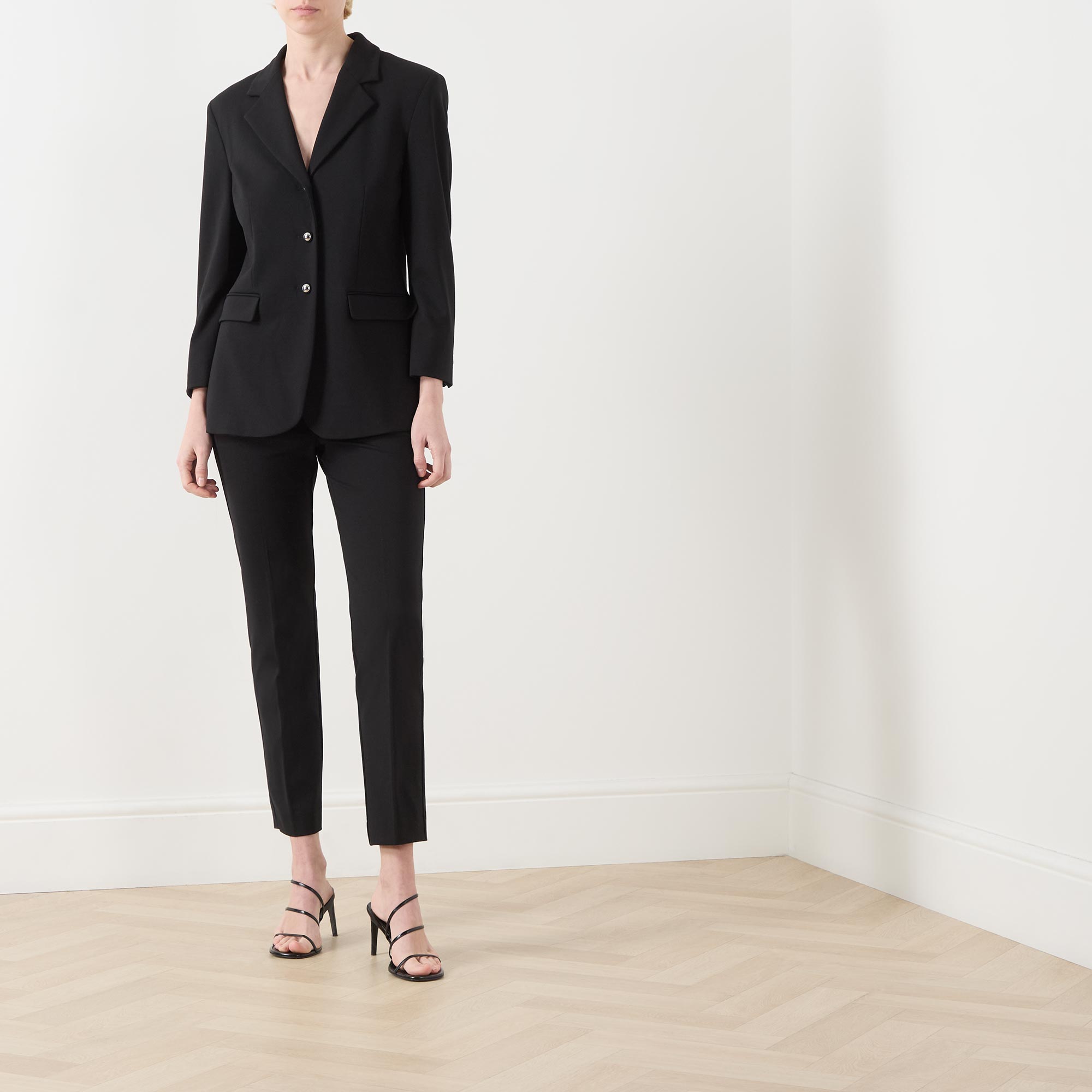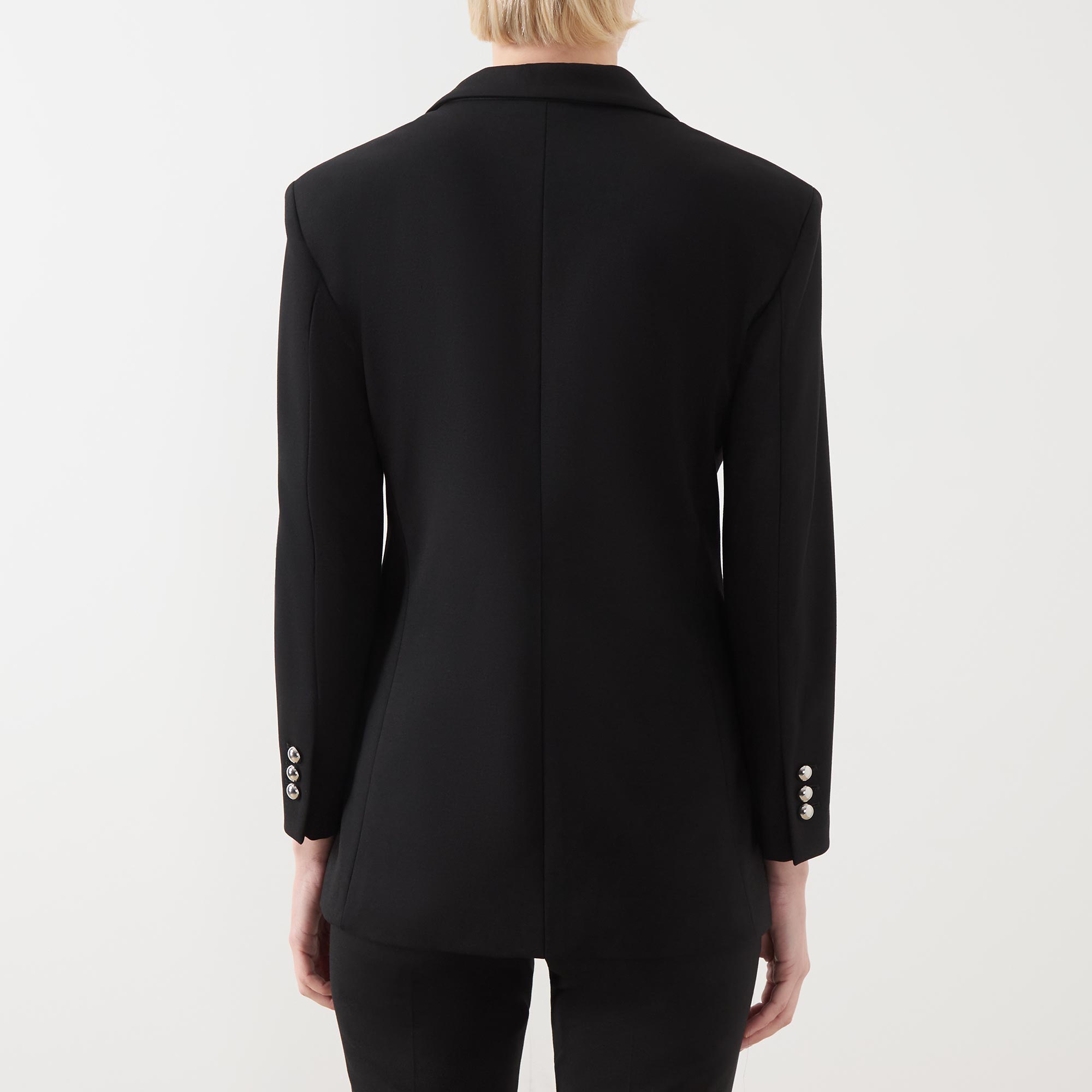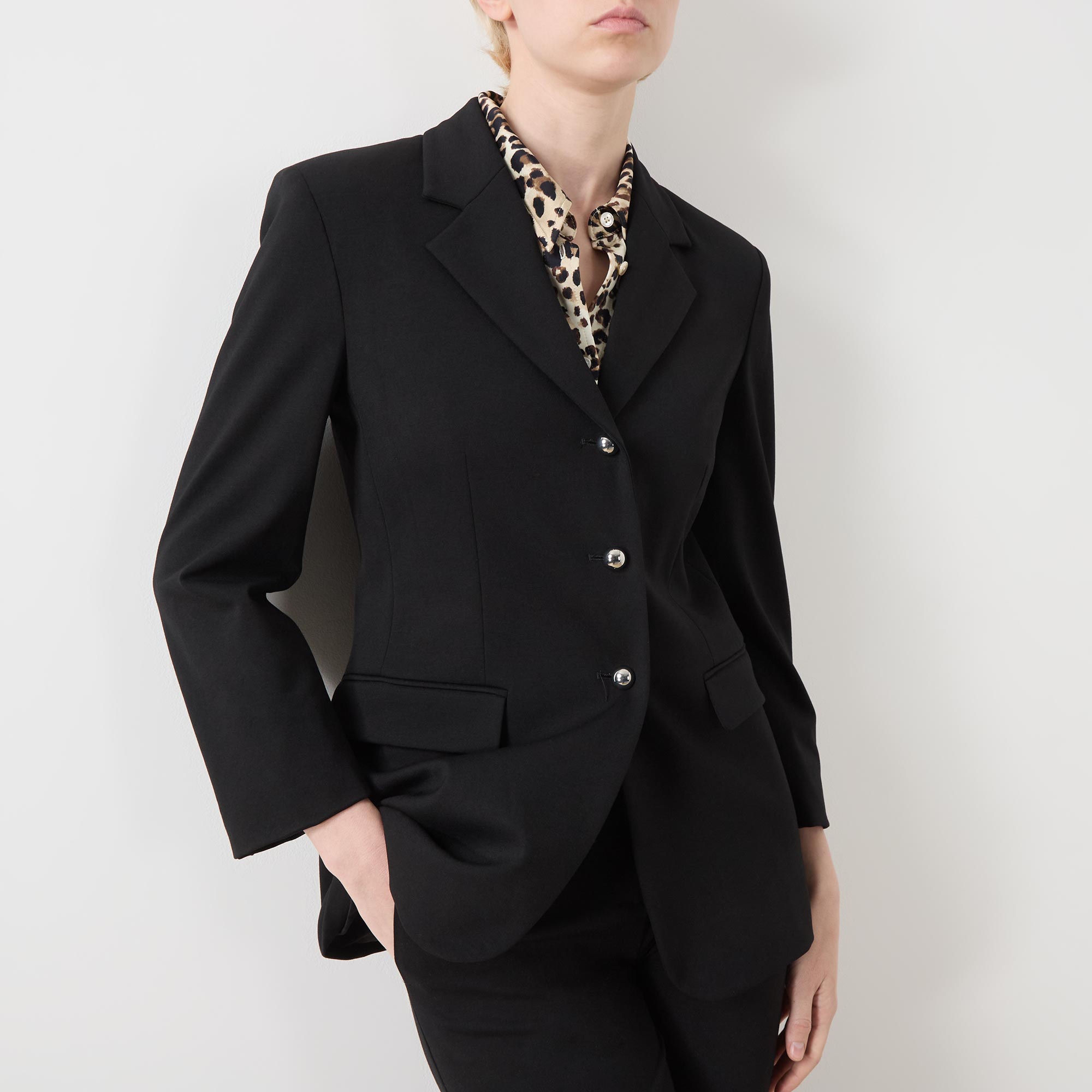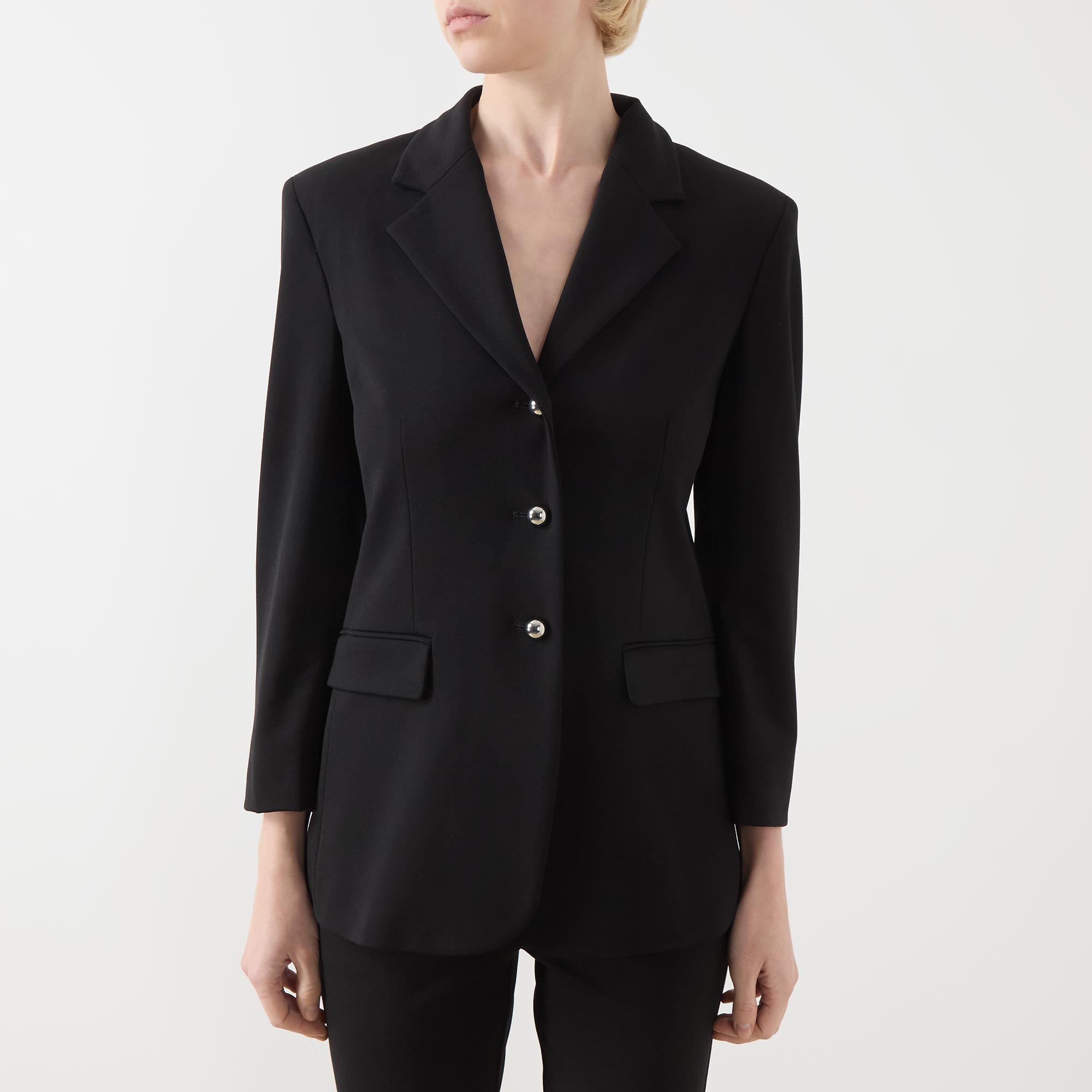 - Single-breasted front, long sleeves, notched-lapel collar, button fastenings, darted front, two side flap pockets, buttoned cuffs, smooth fabric