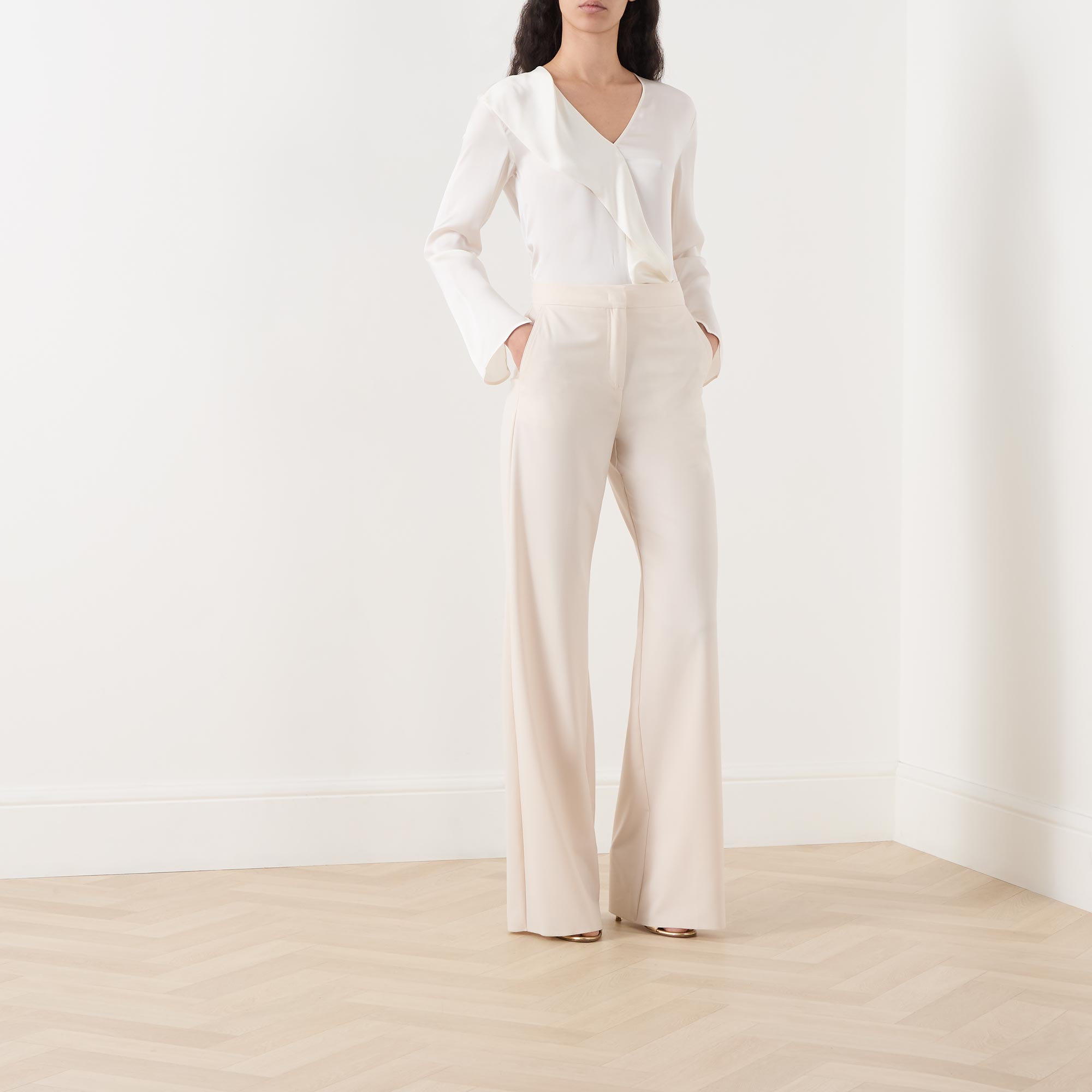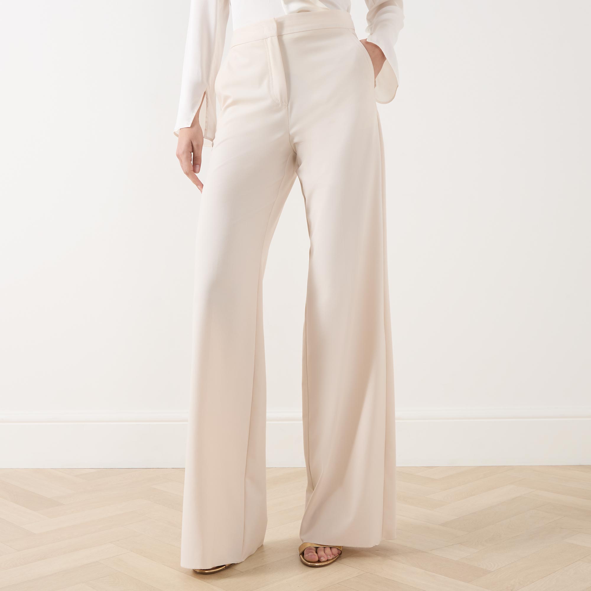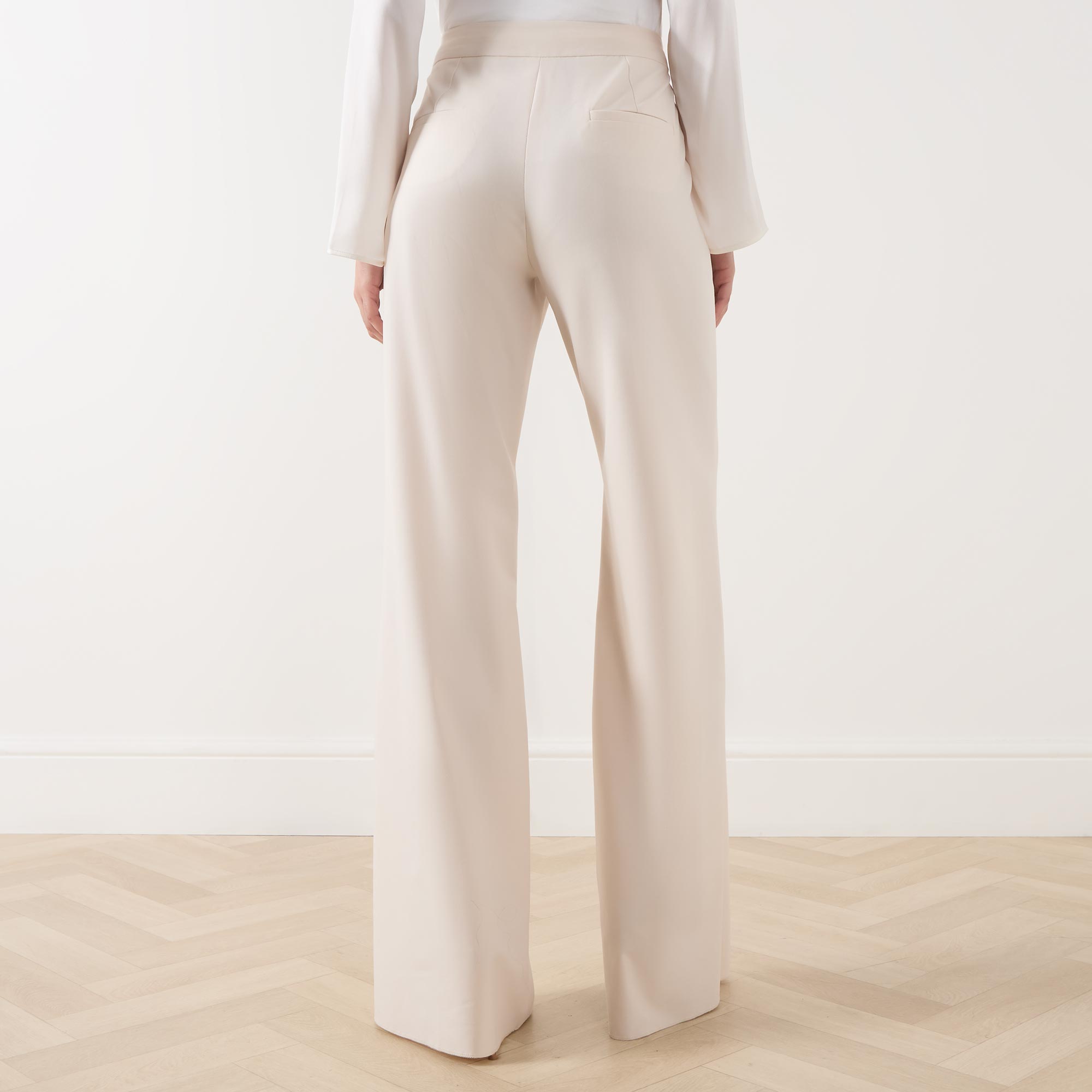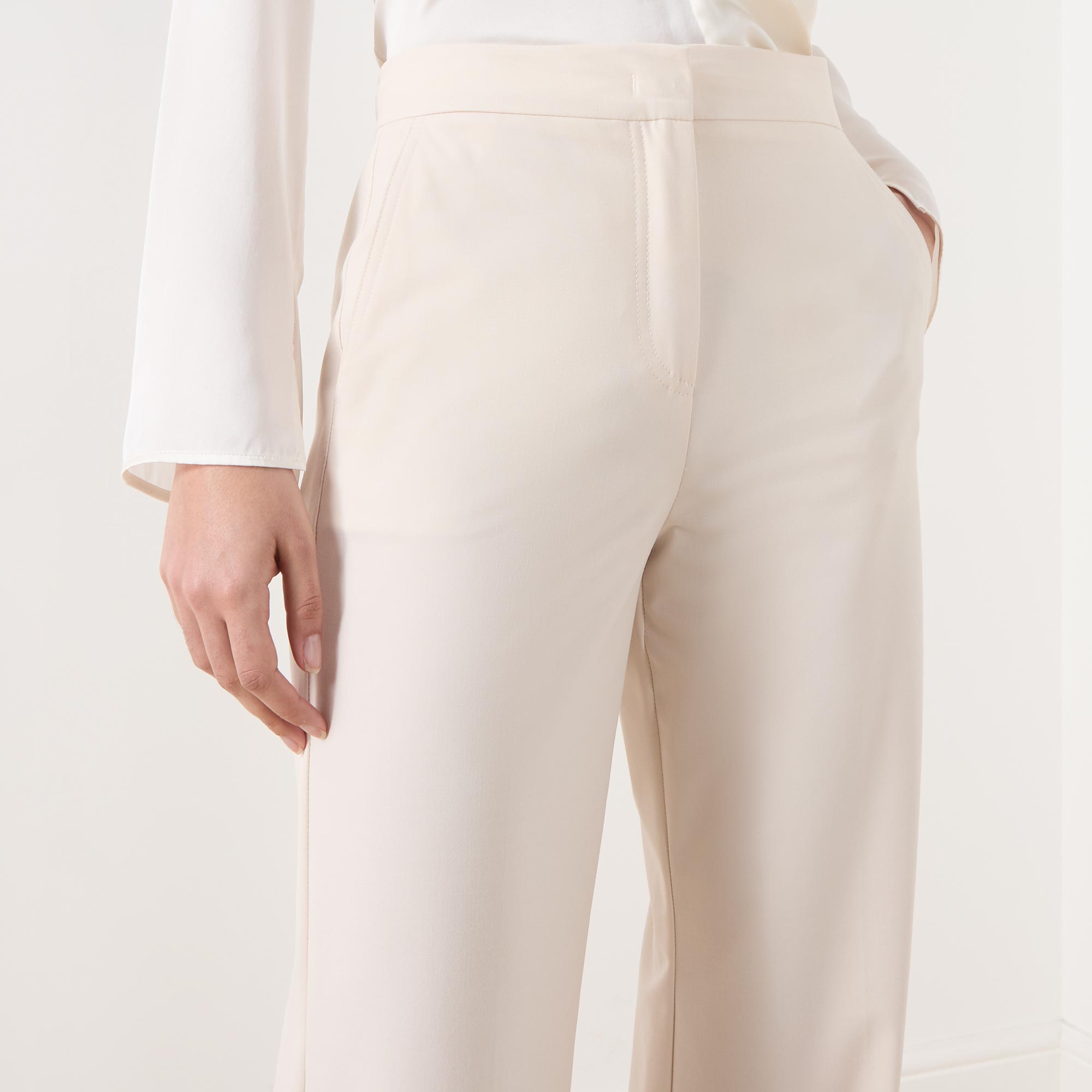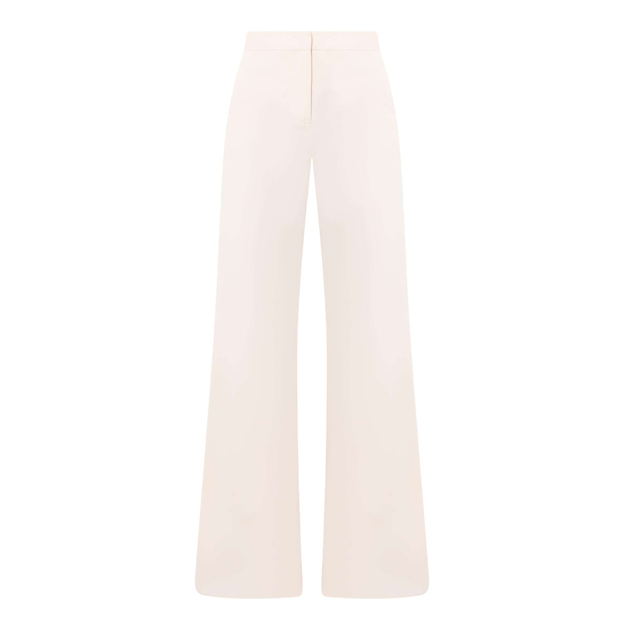 • Concealed zip-fly and hook-and-bar fastening, two side in-seam pockets, two rear welt pockets, high-rise, wide-cut leg, smooth fabric