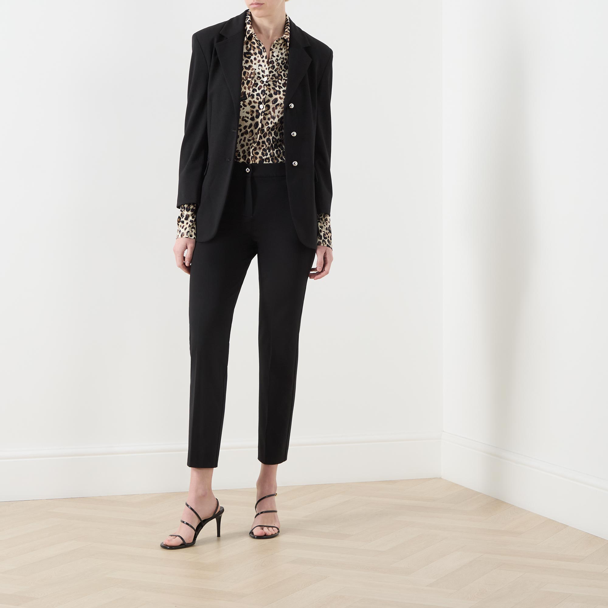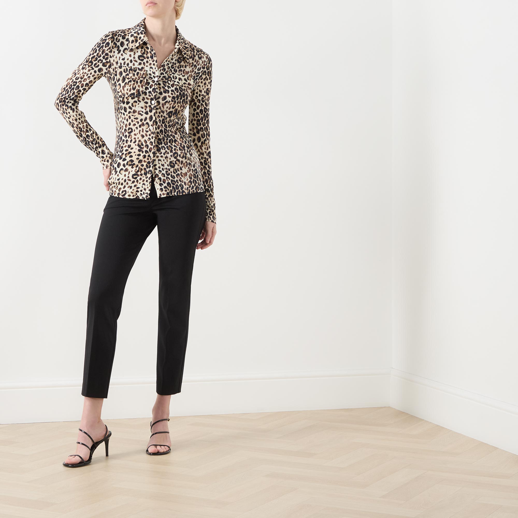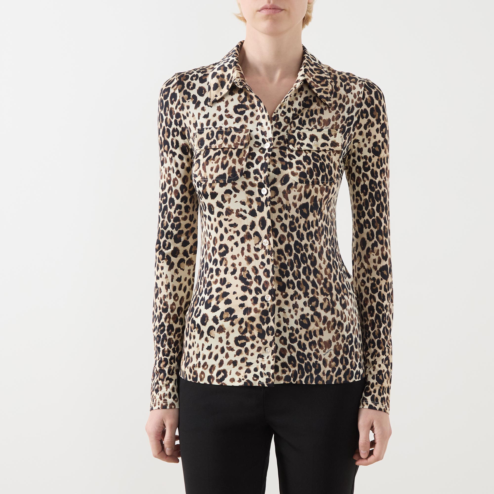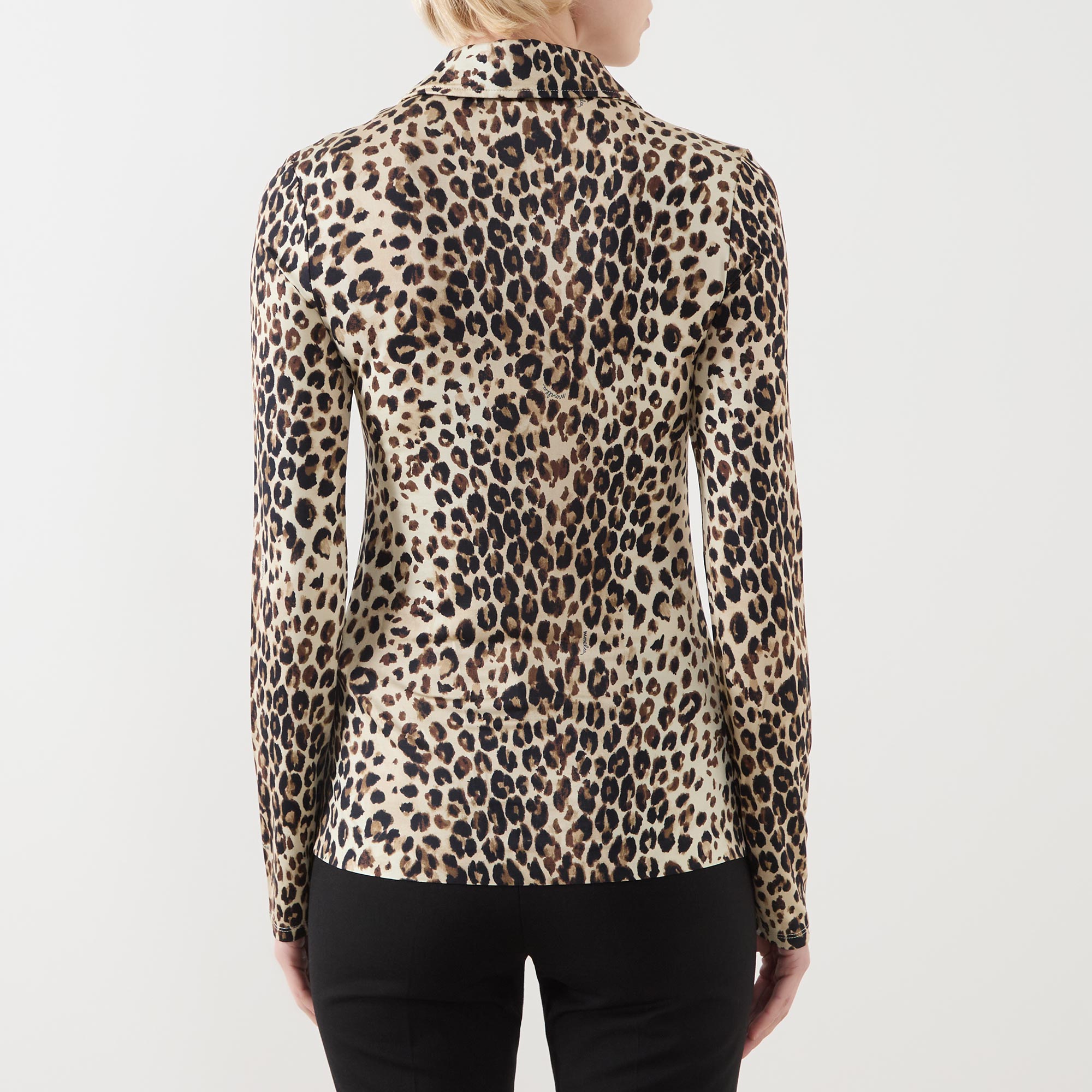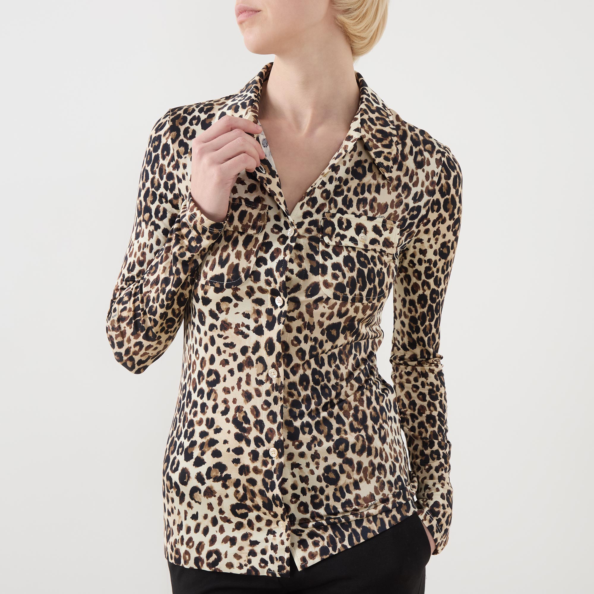 - Point collar, long sleeves, button fastening, two chest flap pockets, leopard print, smooth fabric