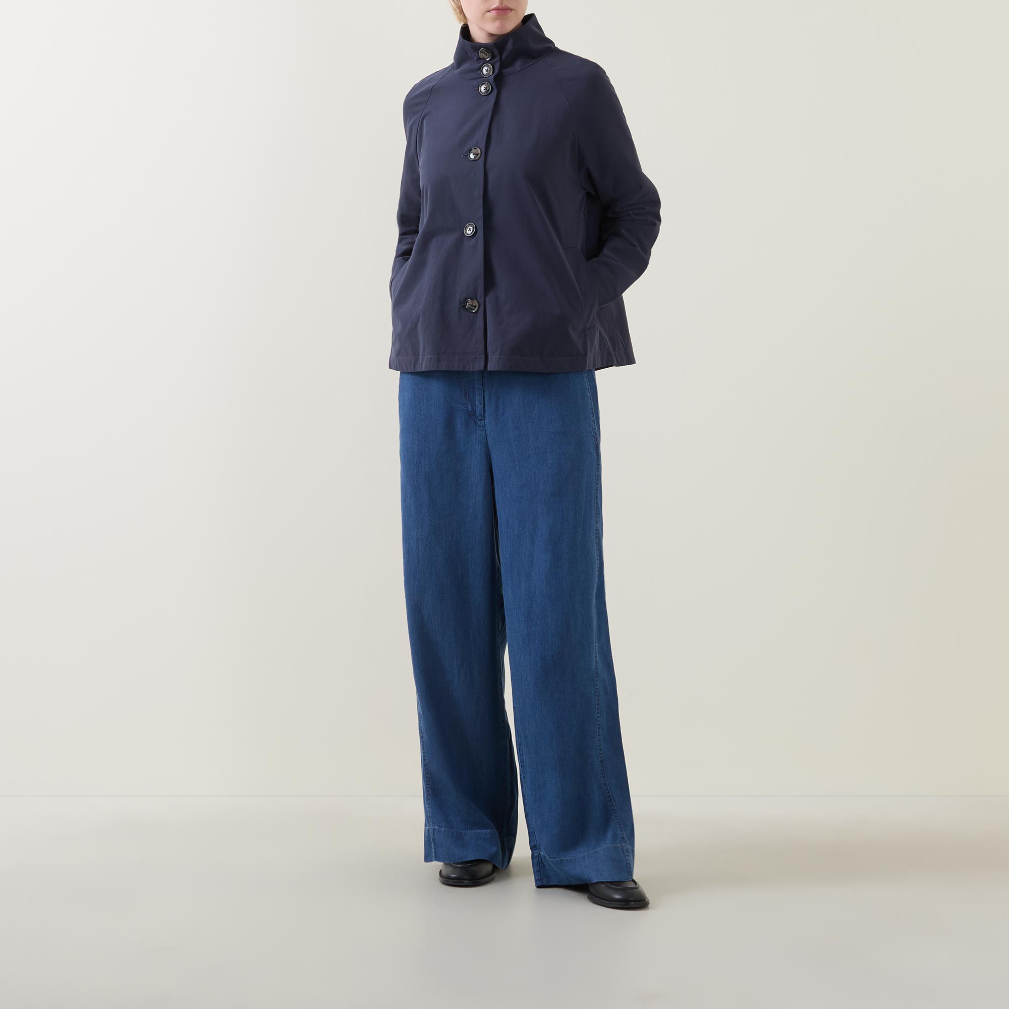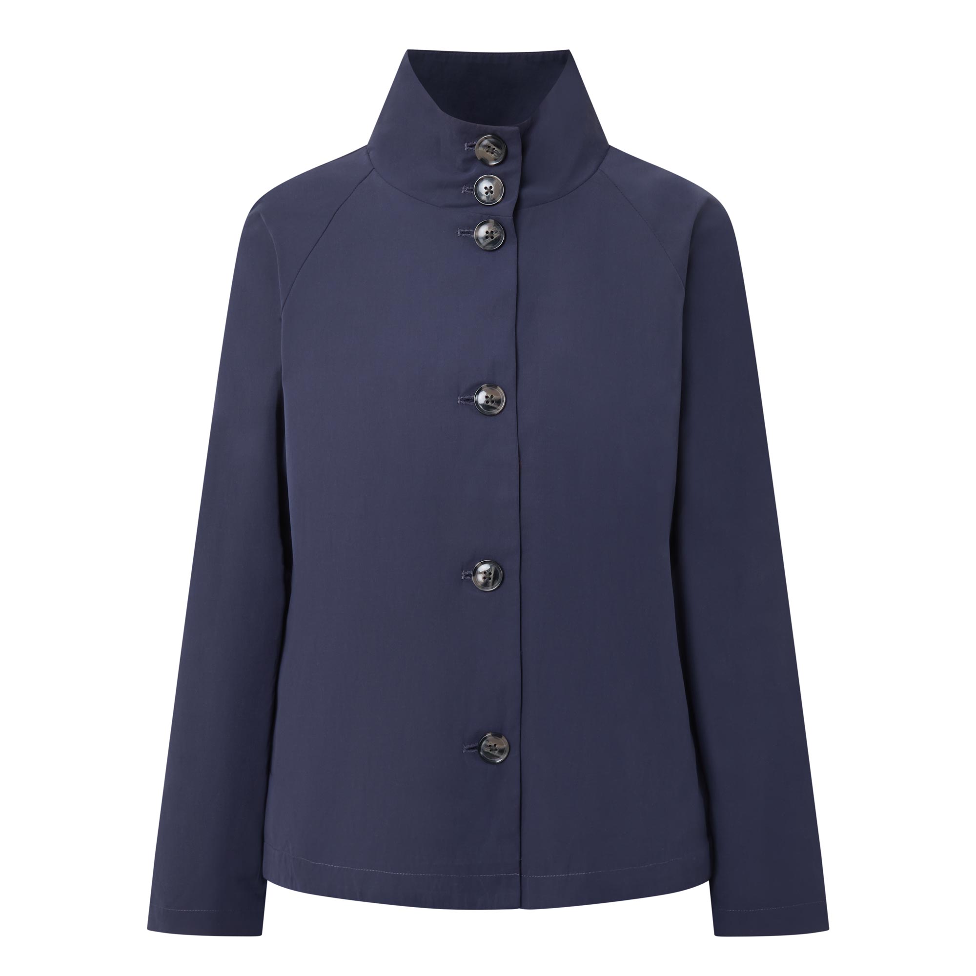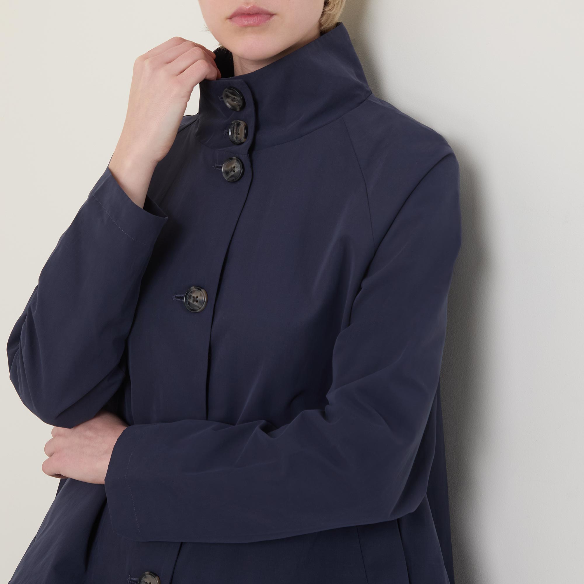 • Long sleeves, short length, stand collar, button fastenings, A-line shape, curved hem