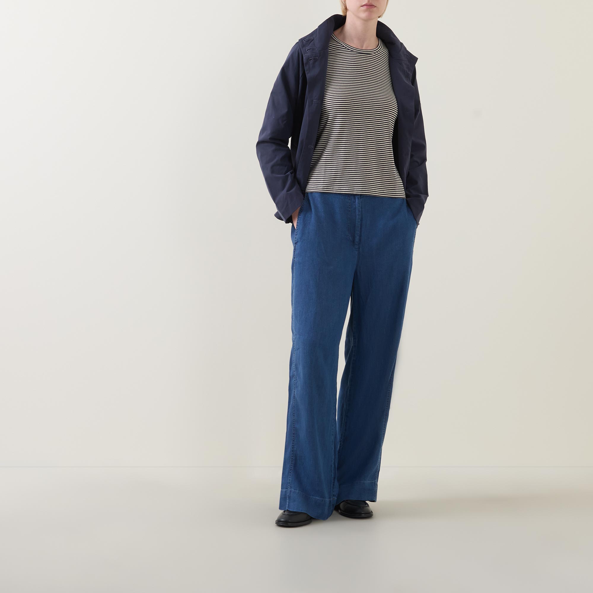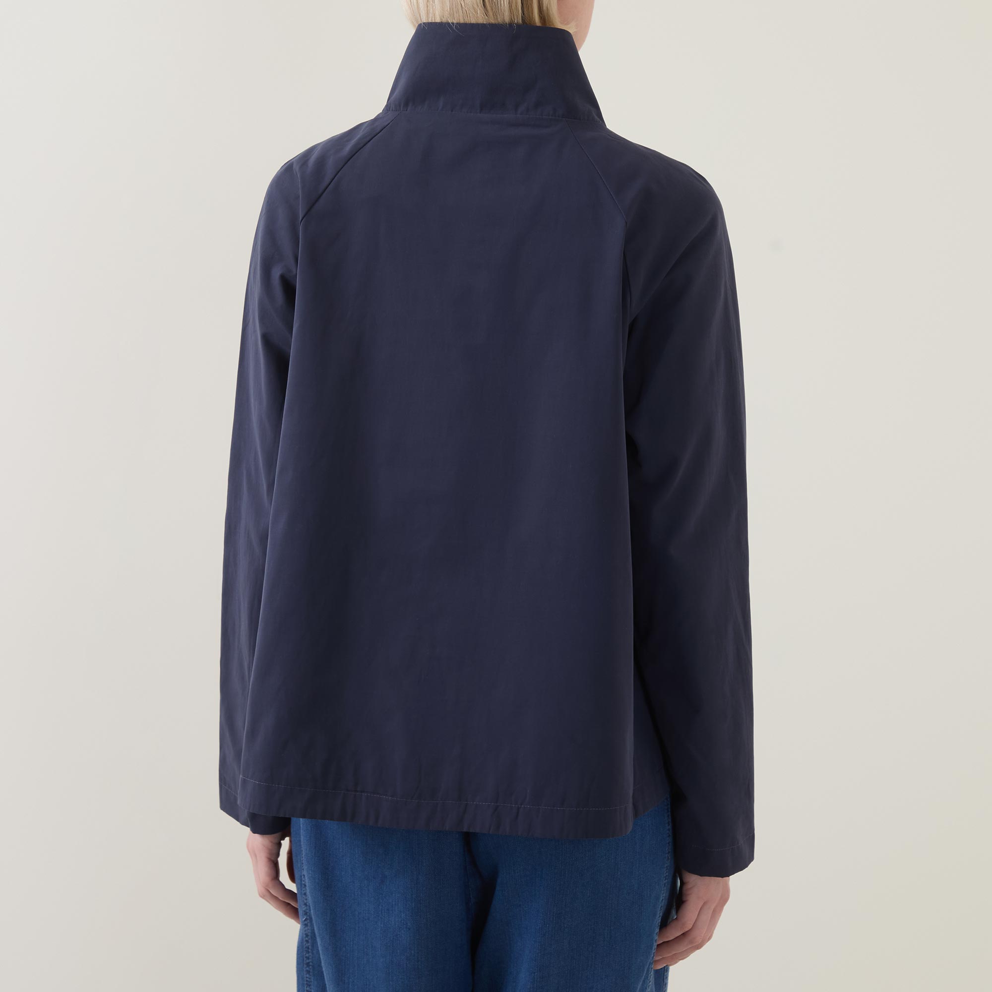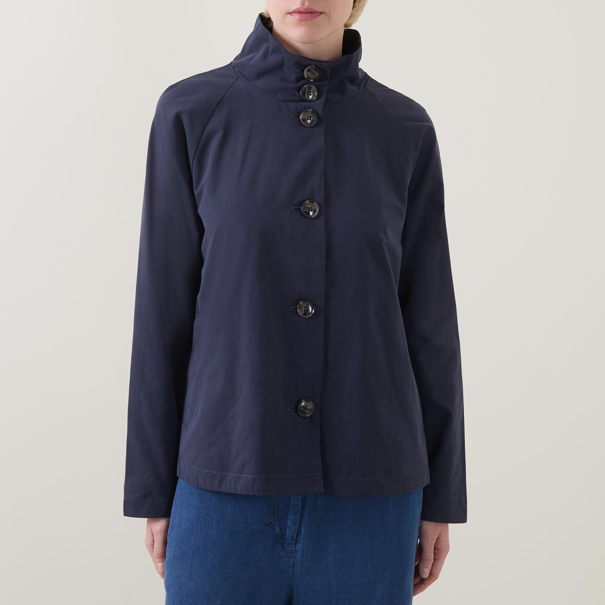 • Long sleeves, short length, stand collar, button fastenings, A-line shape, curved hem