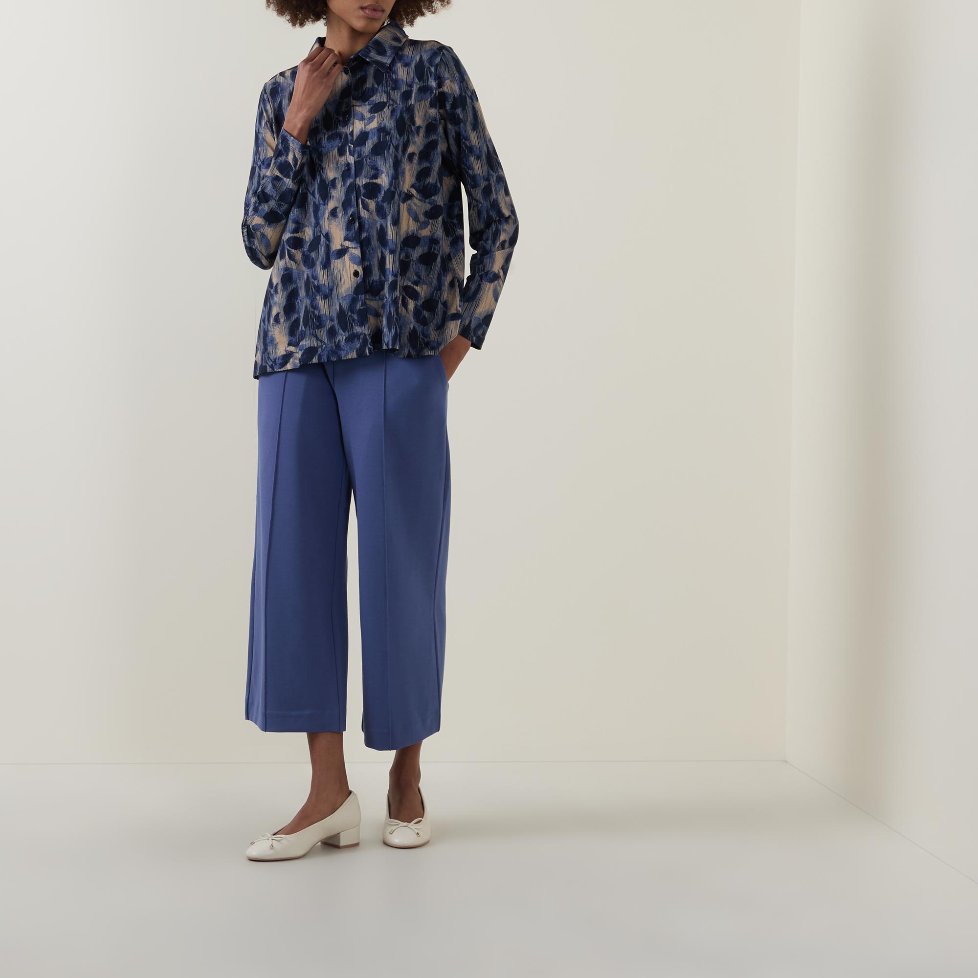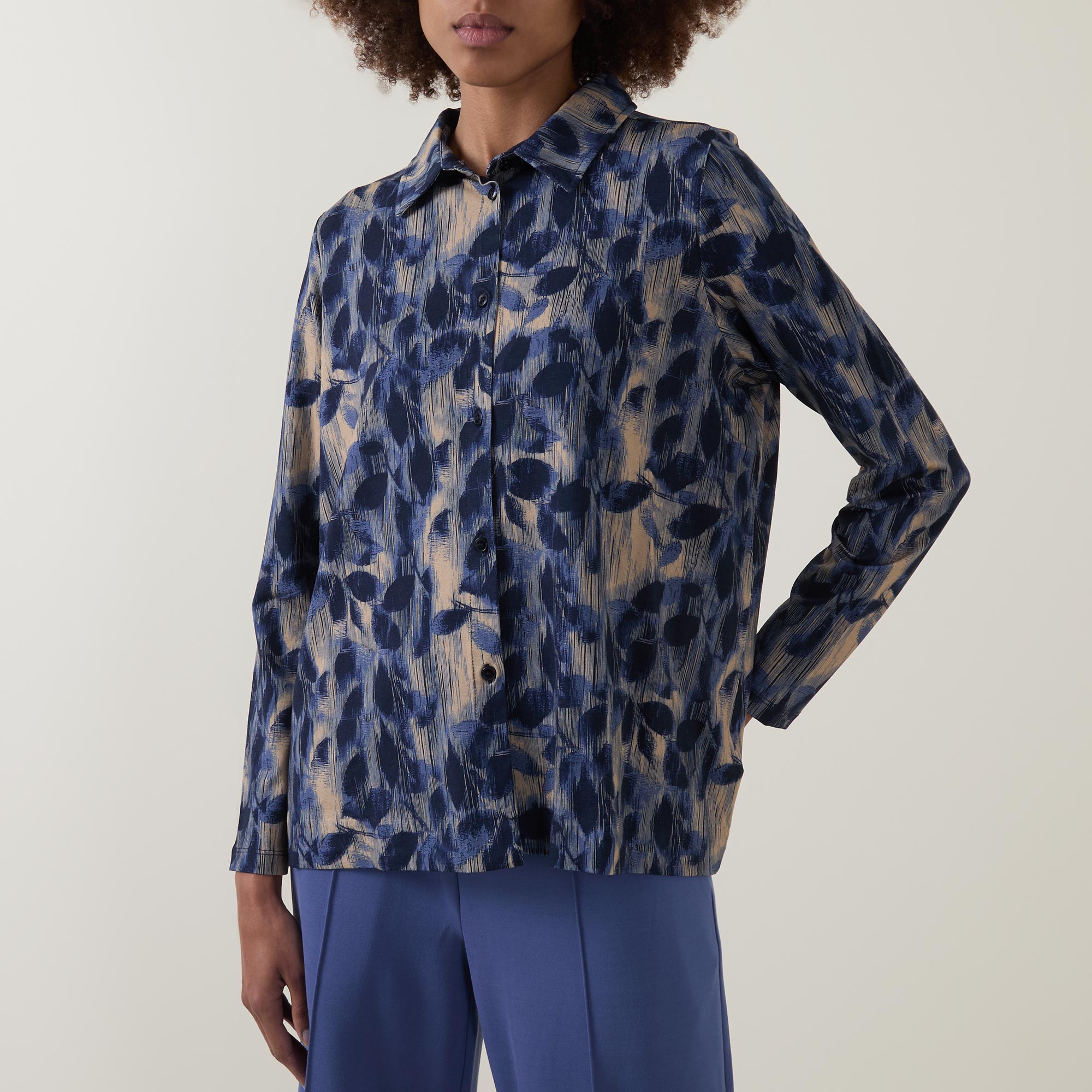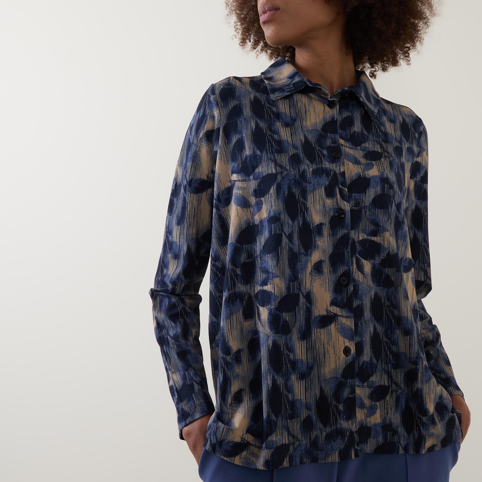 - Point collar, long sleeves, front button placket, leaf pattern, tonal stitching, straight hemline, smooth fabric