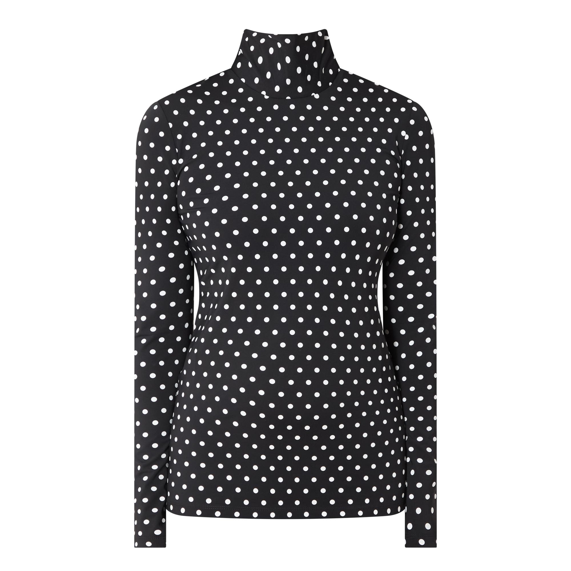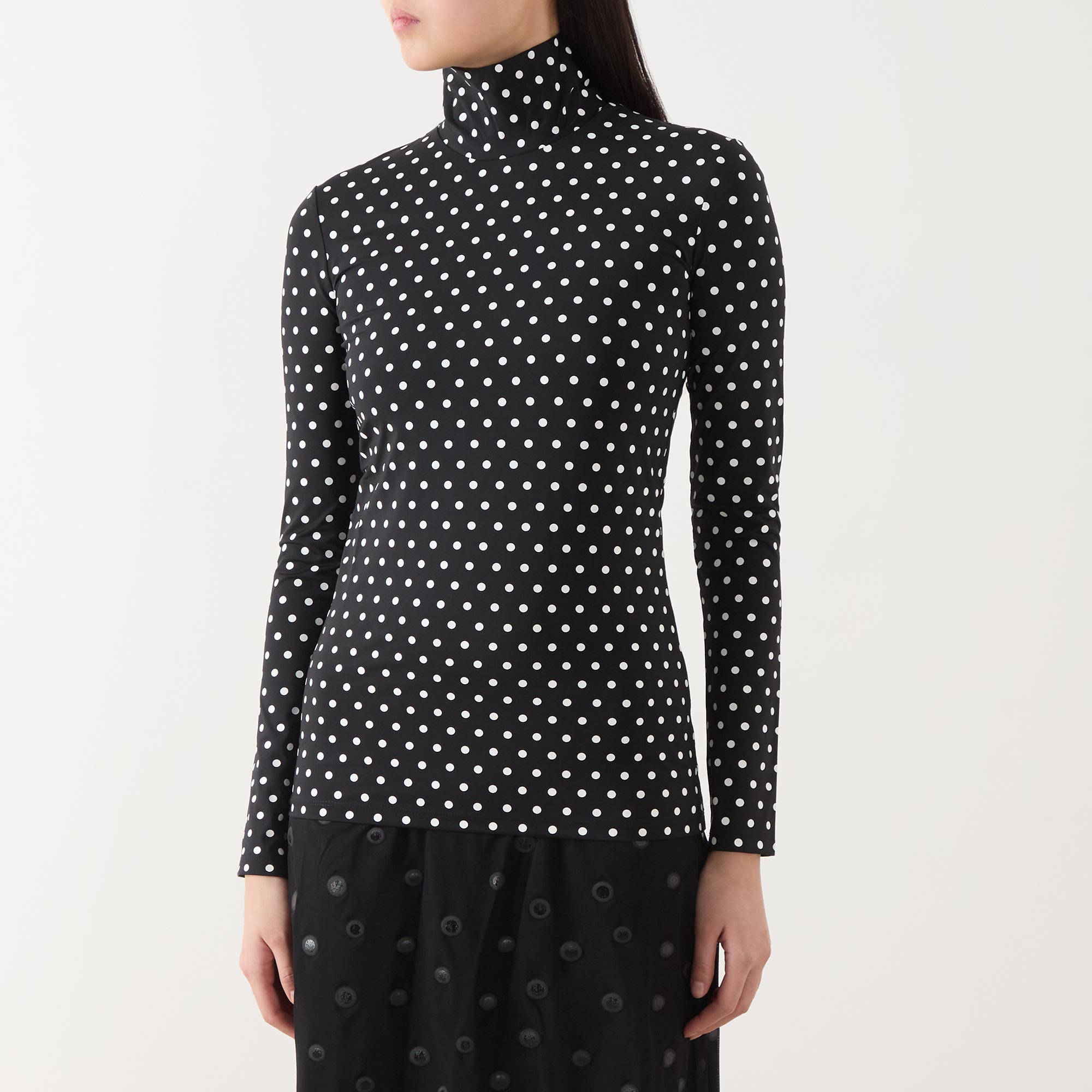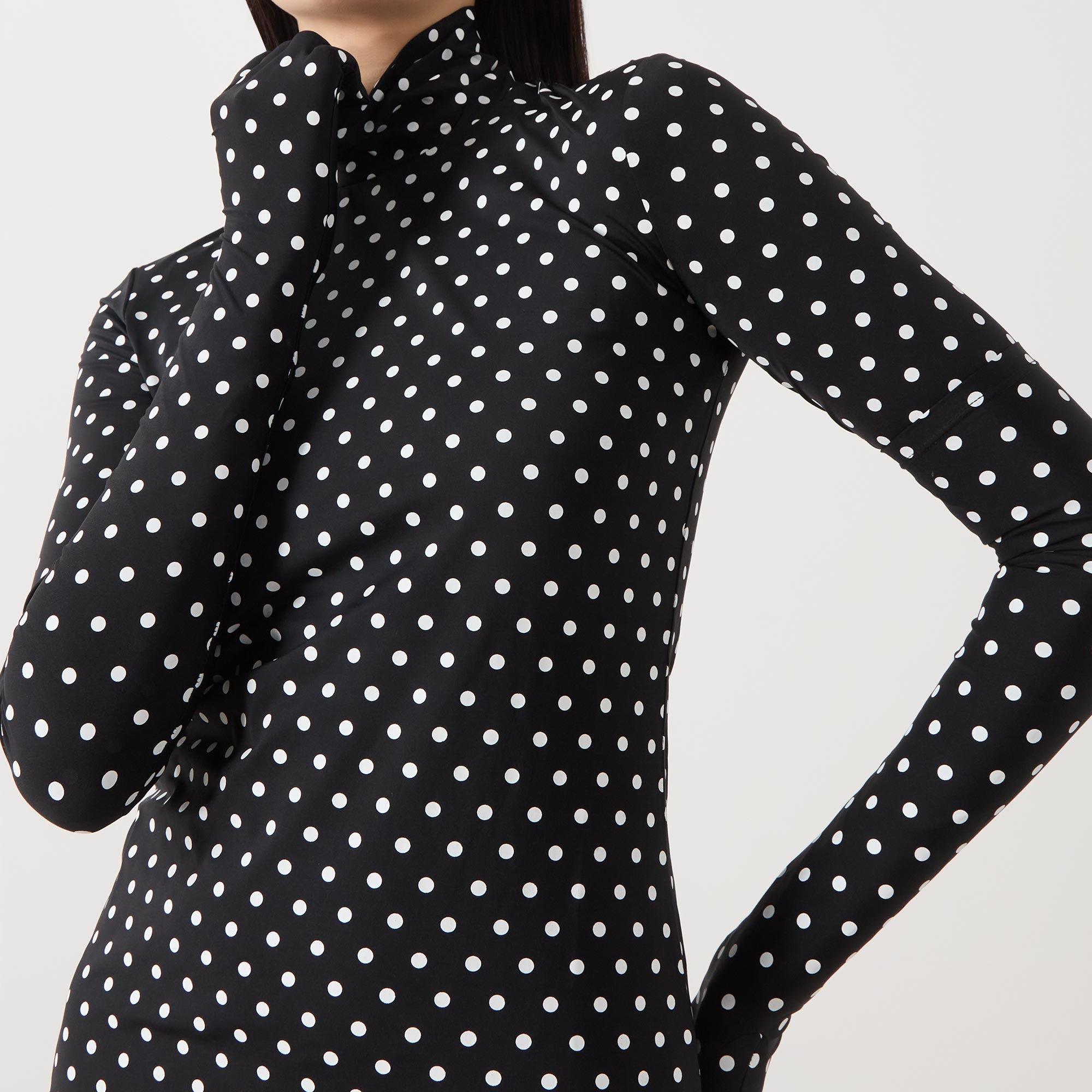 - Long sleeves, high neckline, polka-dot print, straight hemline