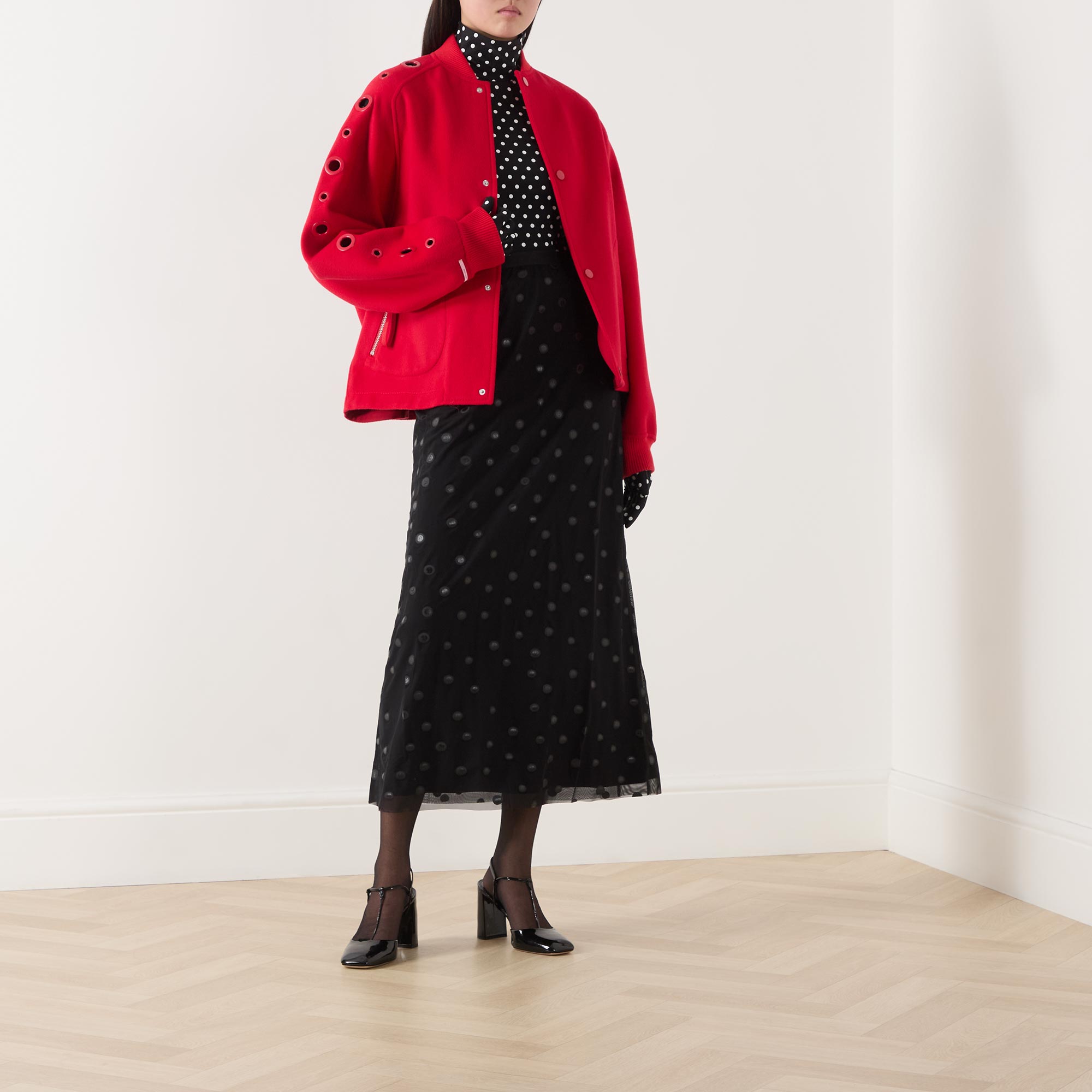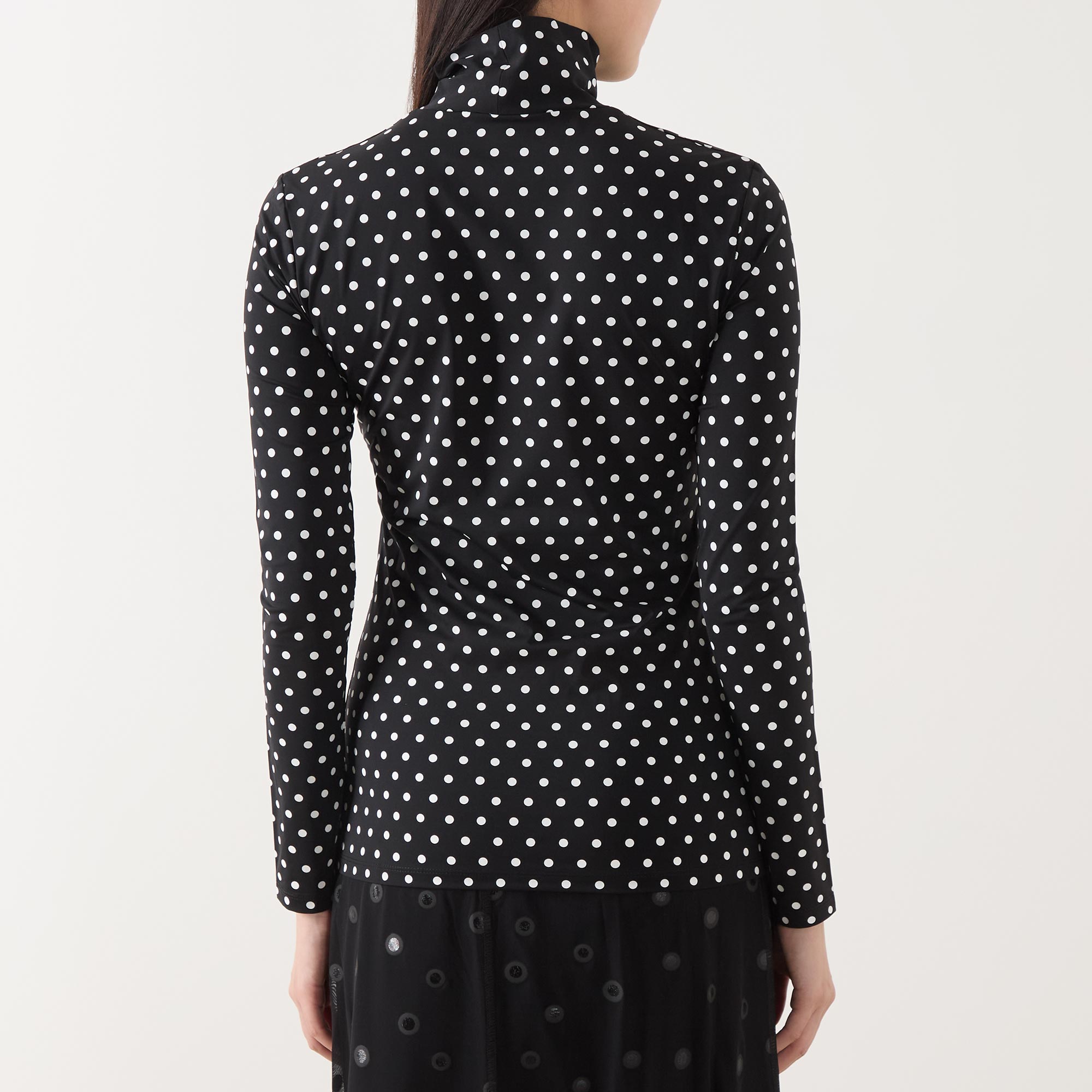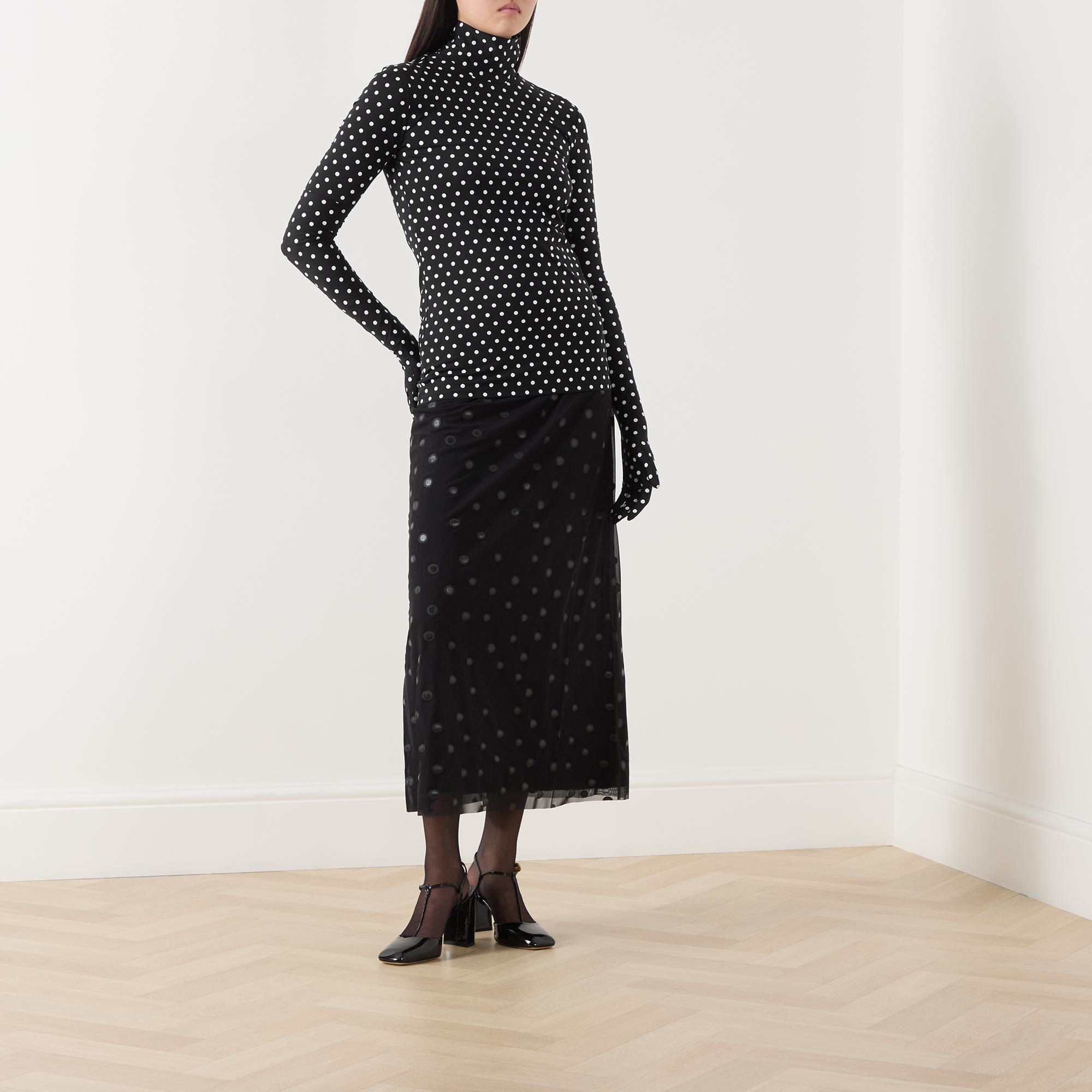 - Long sleeves, high neckline, polka-dot print, straight hemline