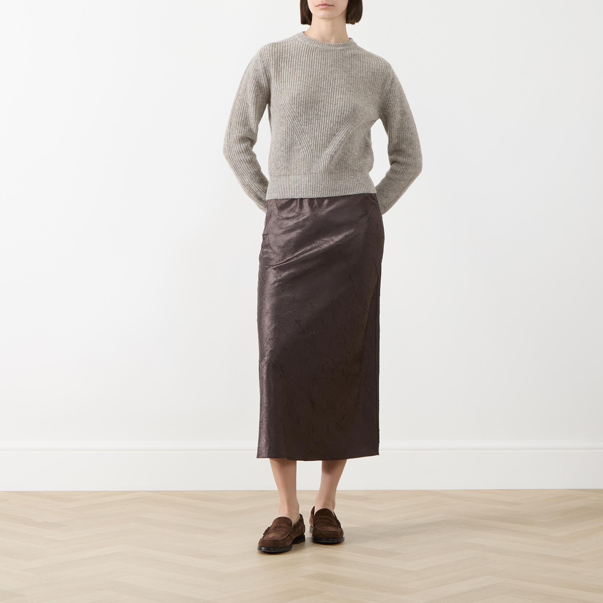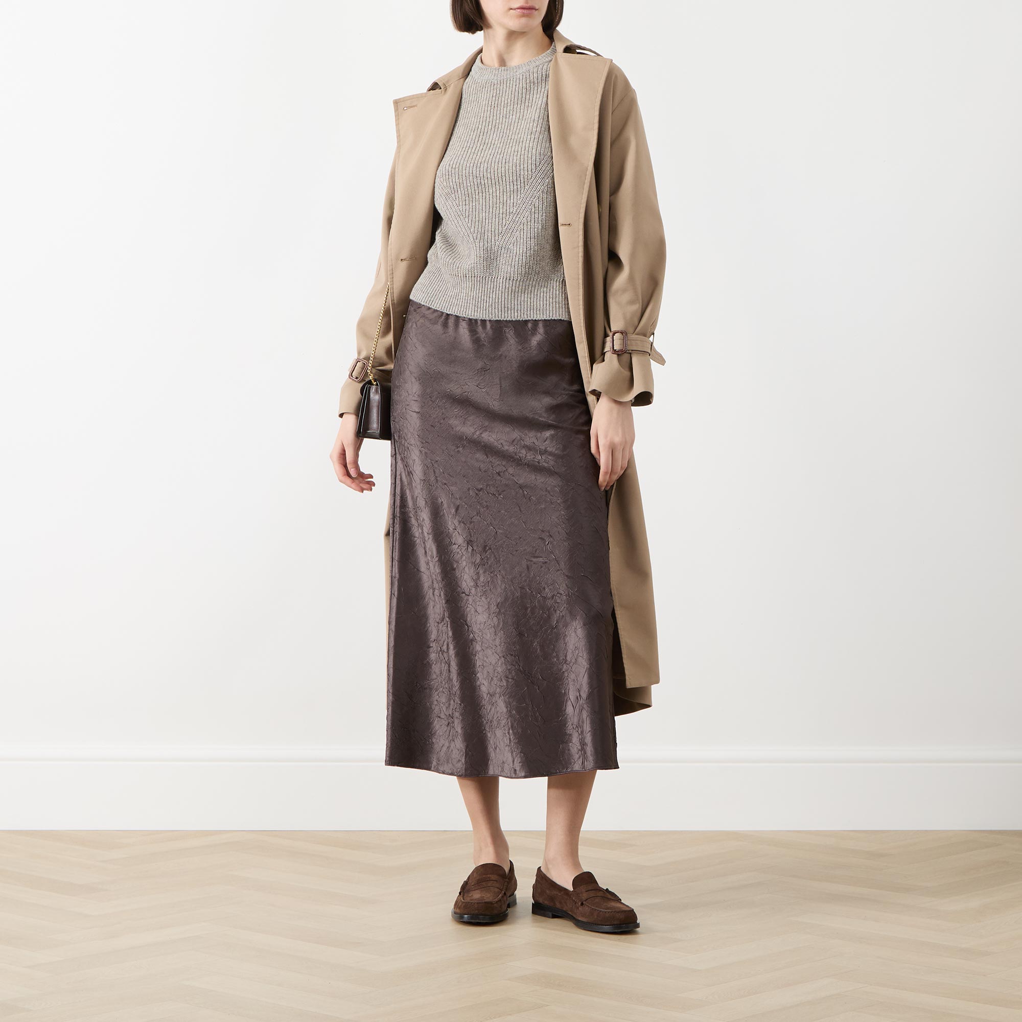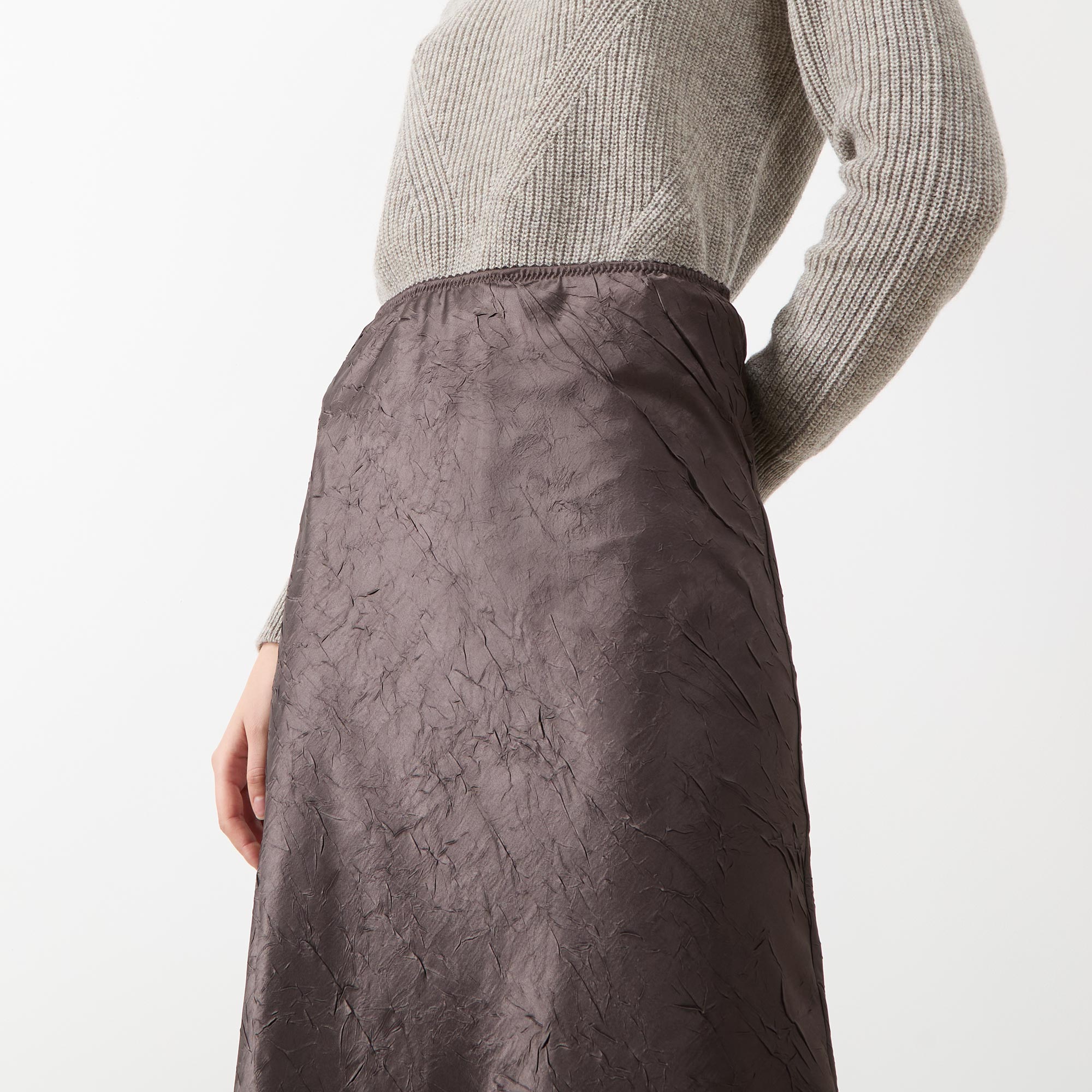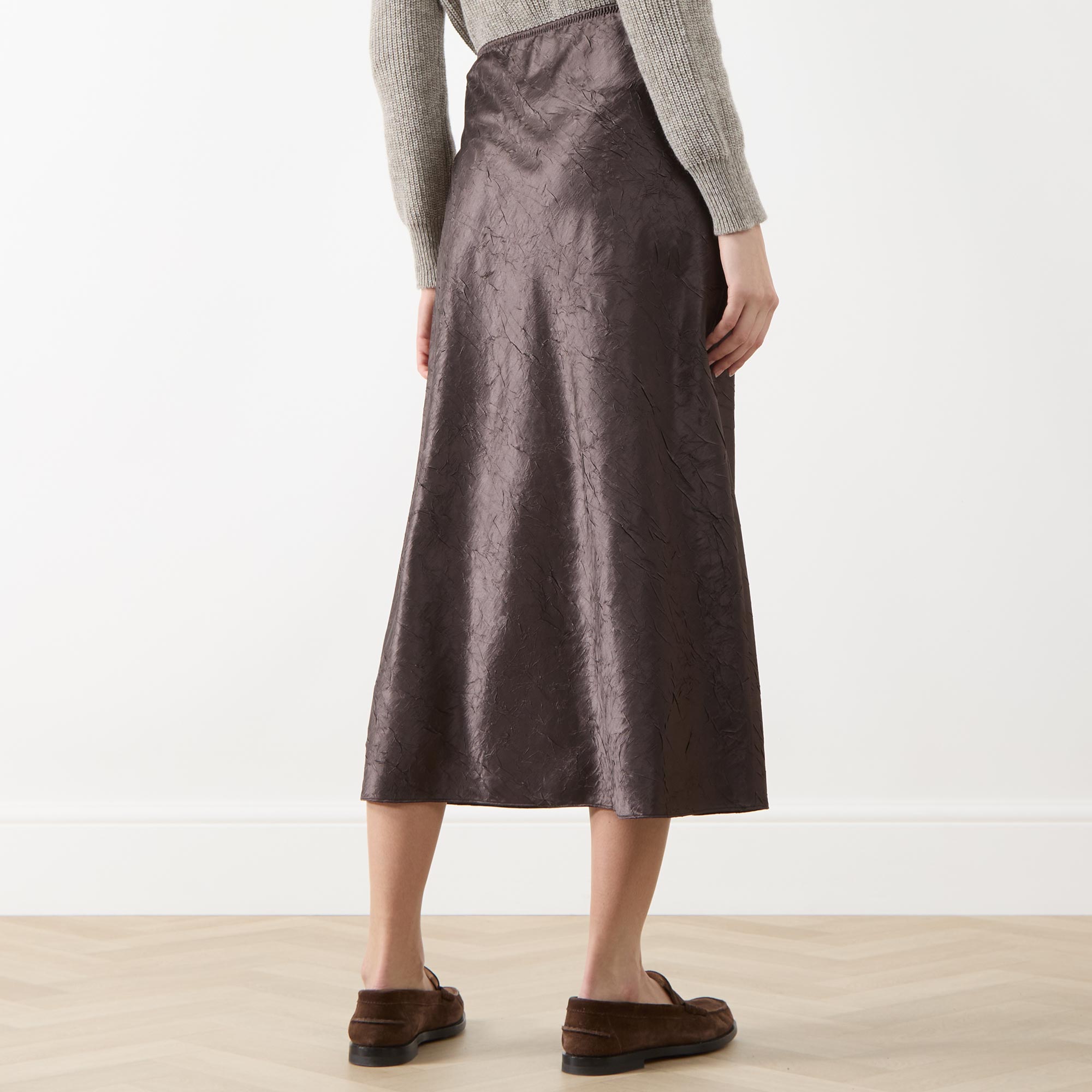 - Elasticated, flared silhouette, midi length, textured satin finish