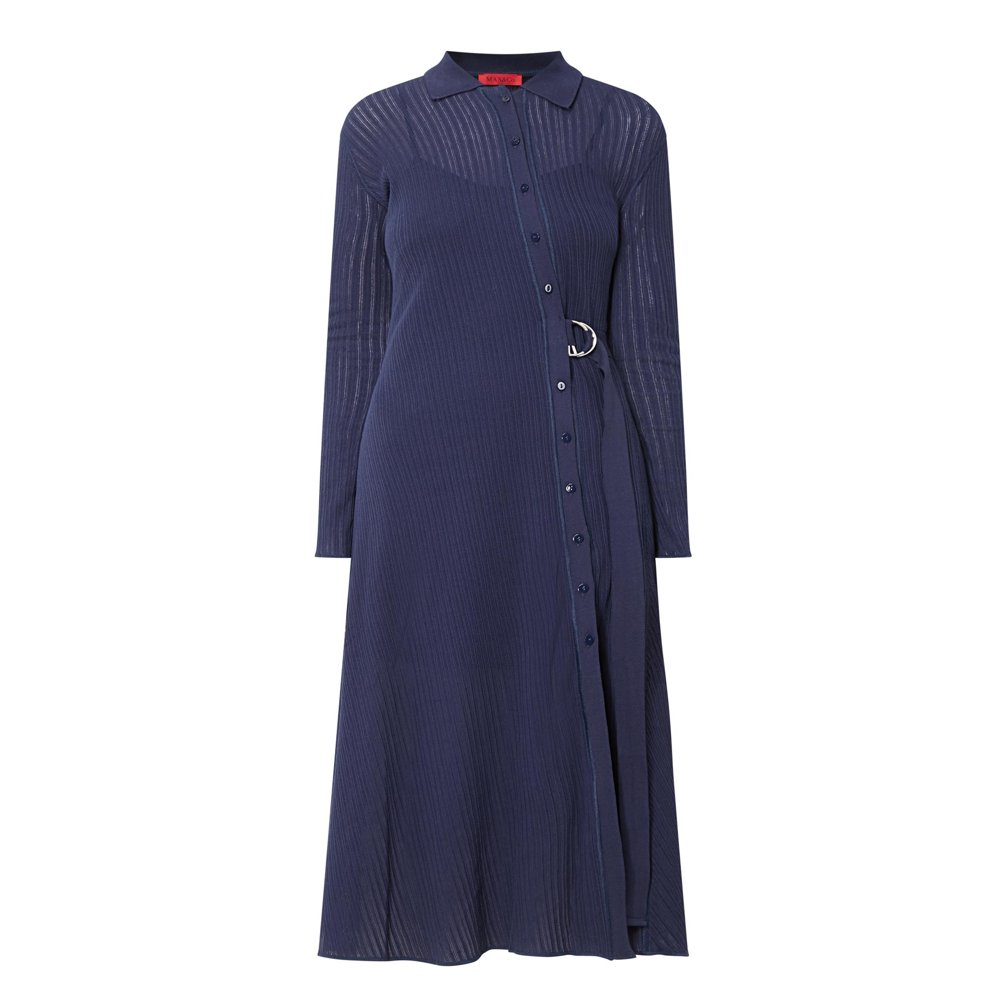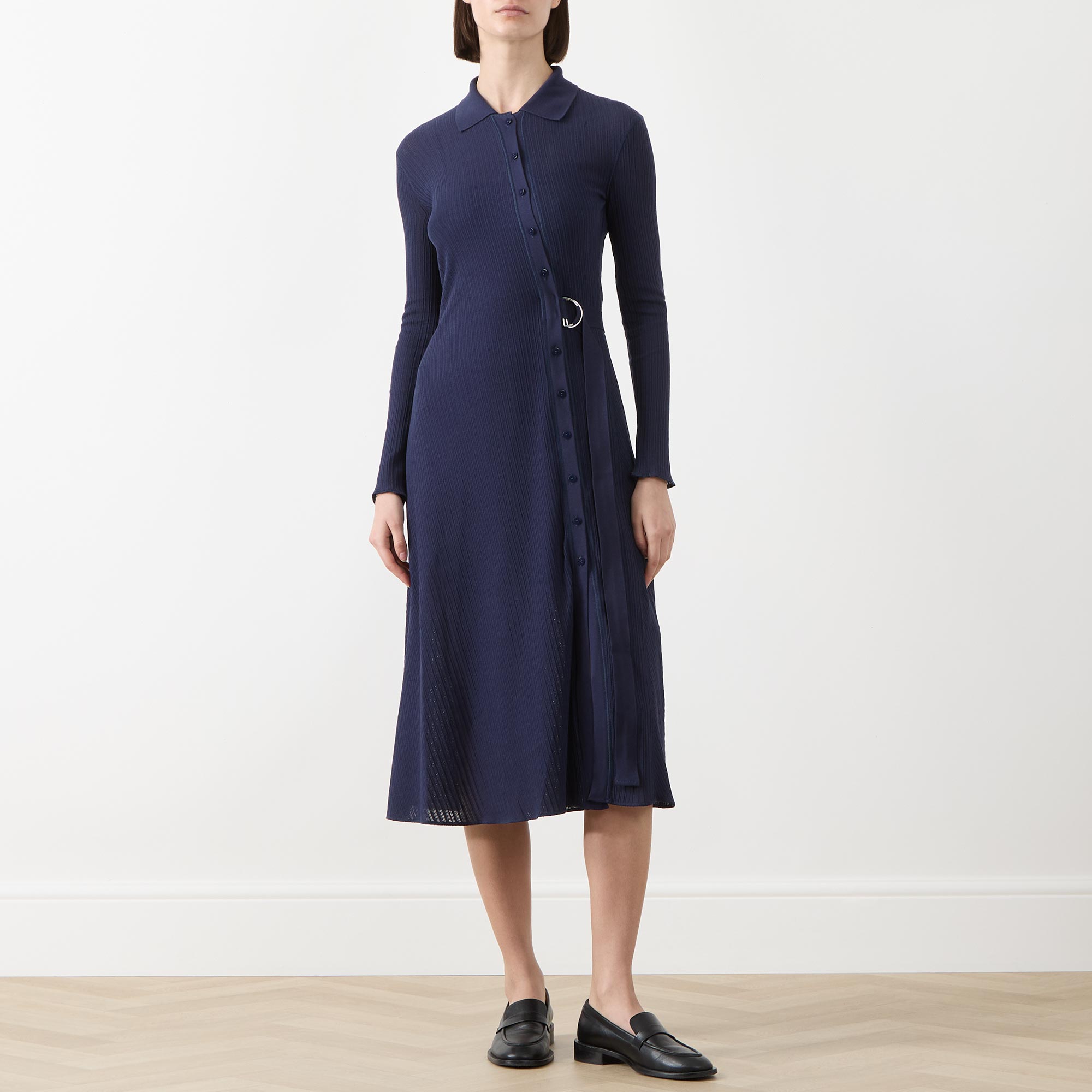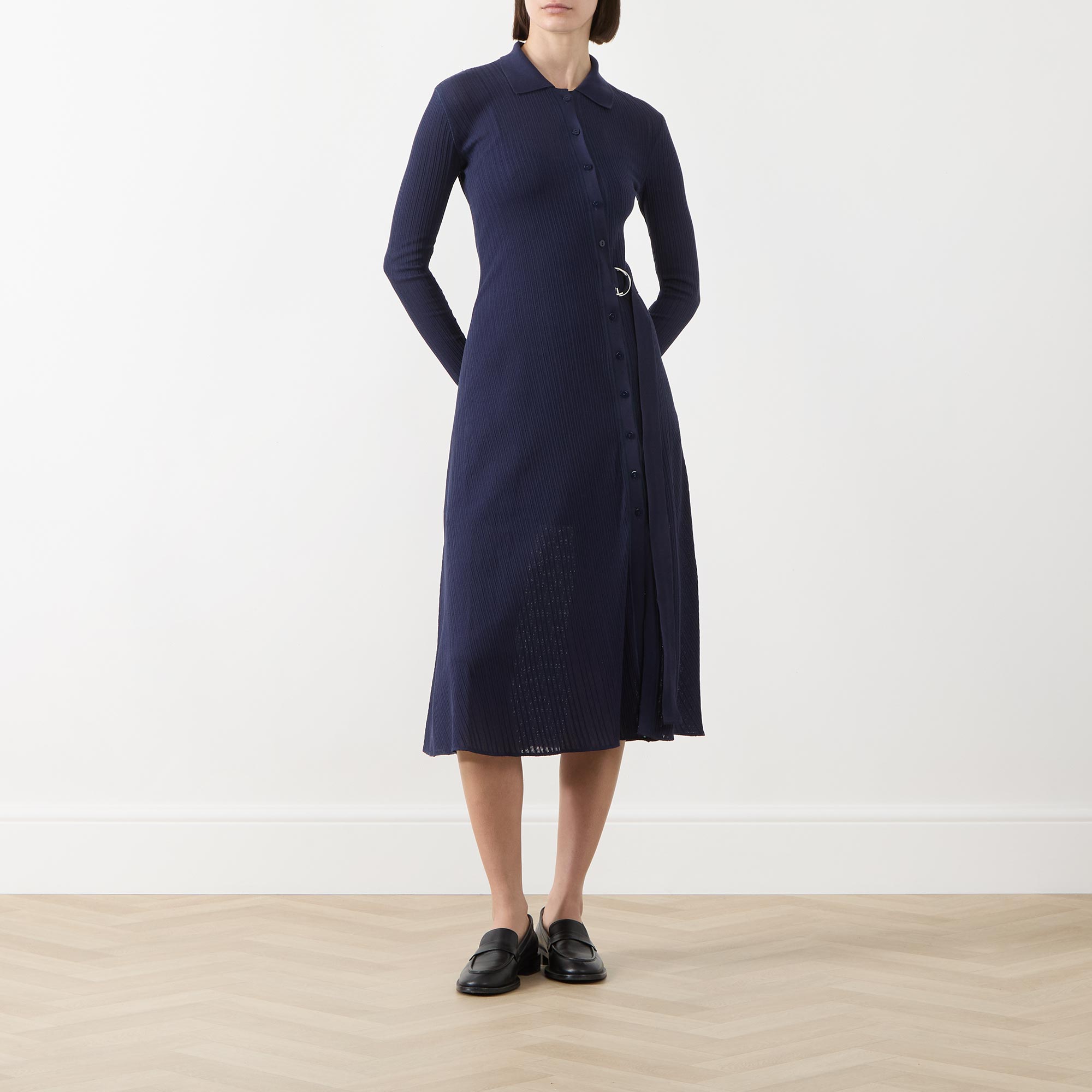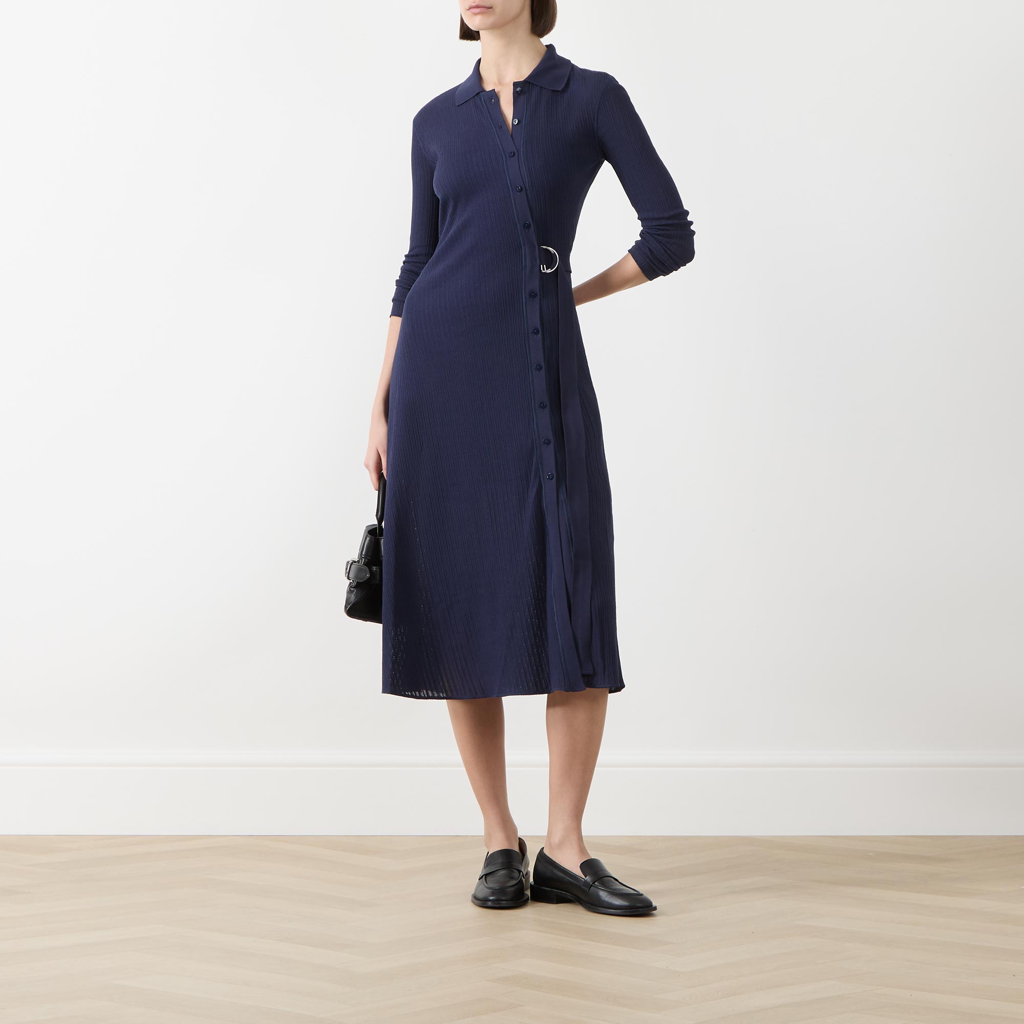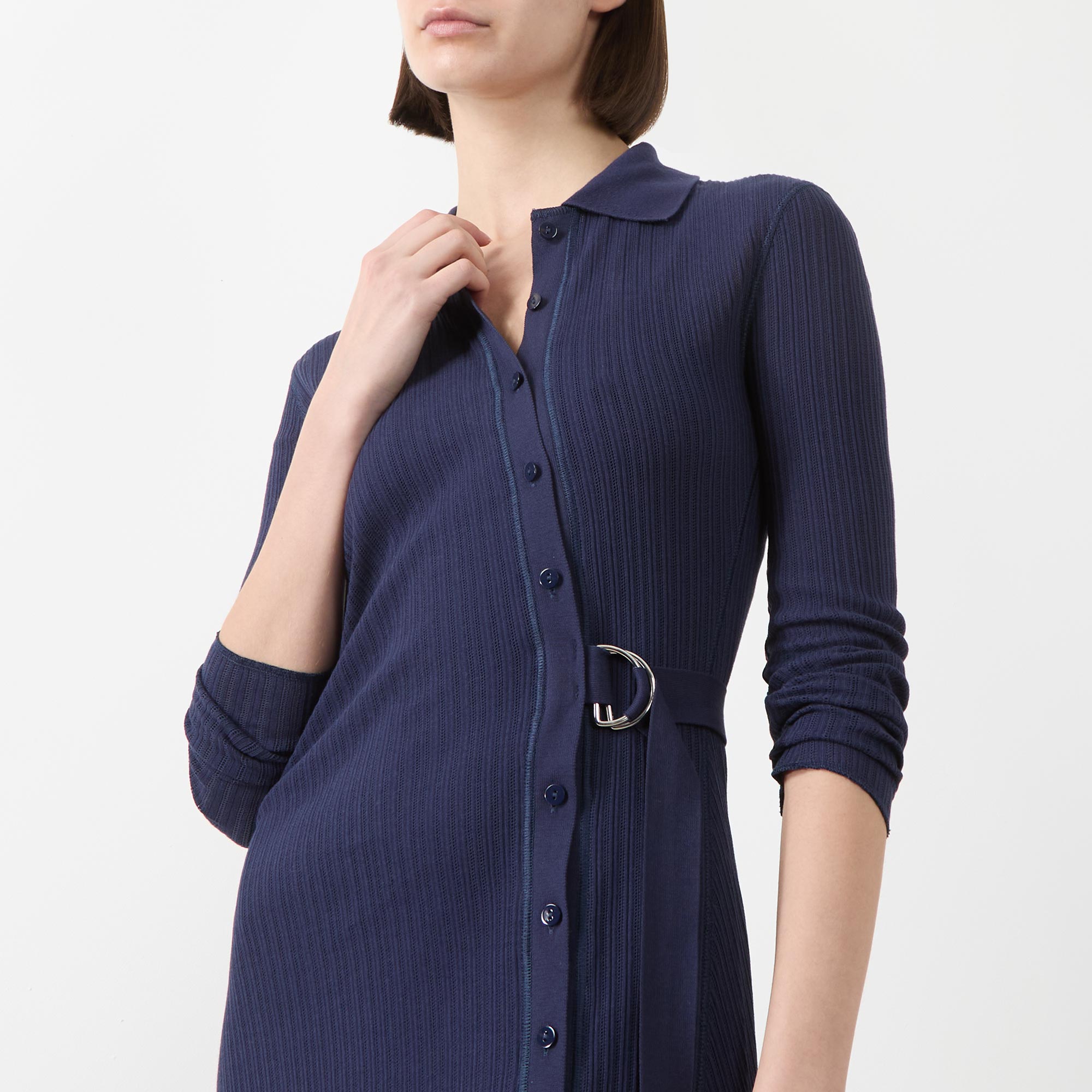 • Spread collar, long sleeves, diagonal button placket, D-ring belt detail, flared silhouette, midi length, ribbed-knit finish