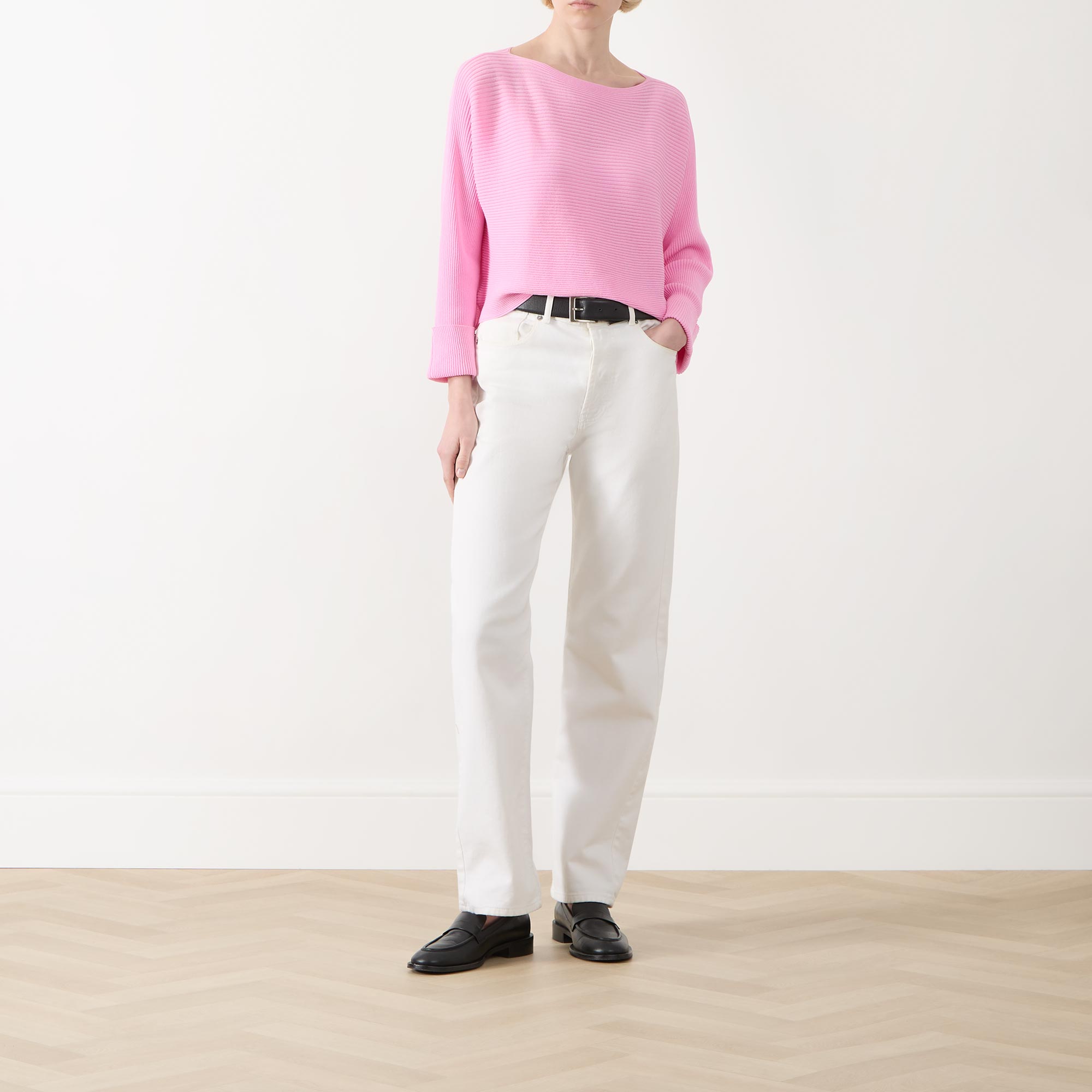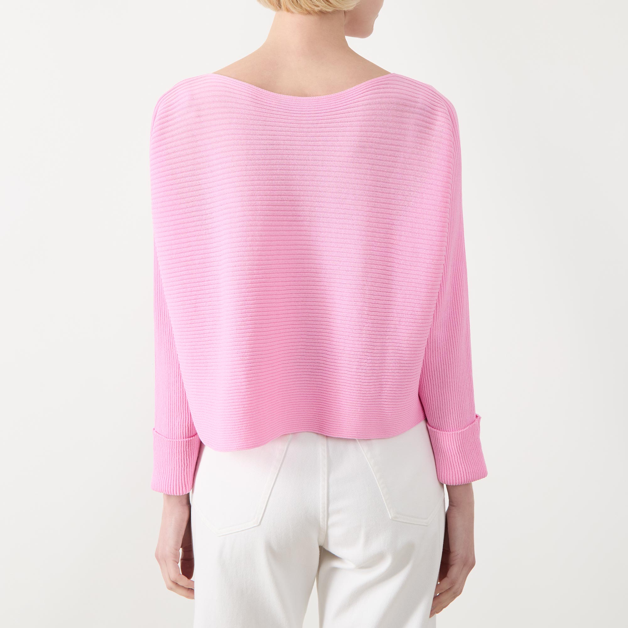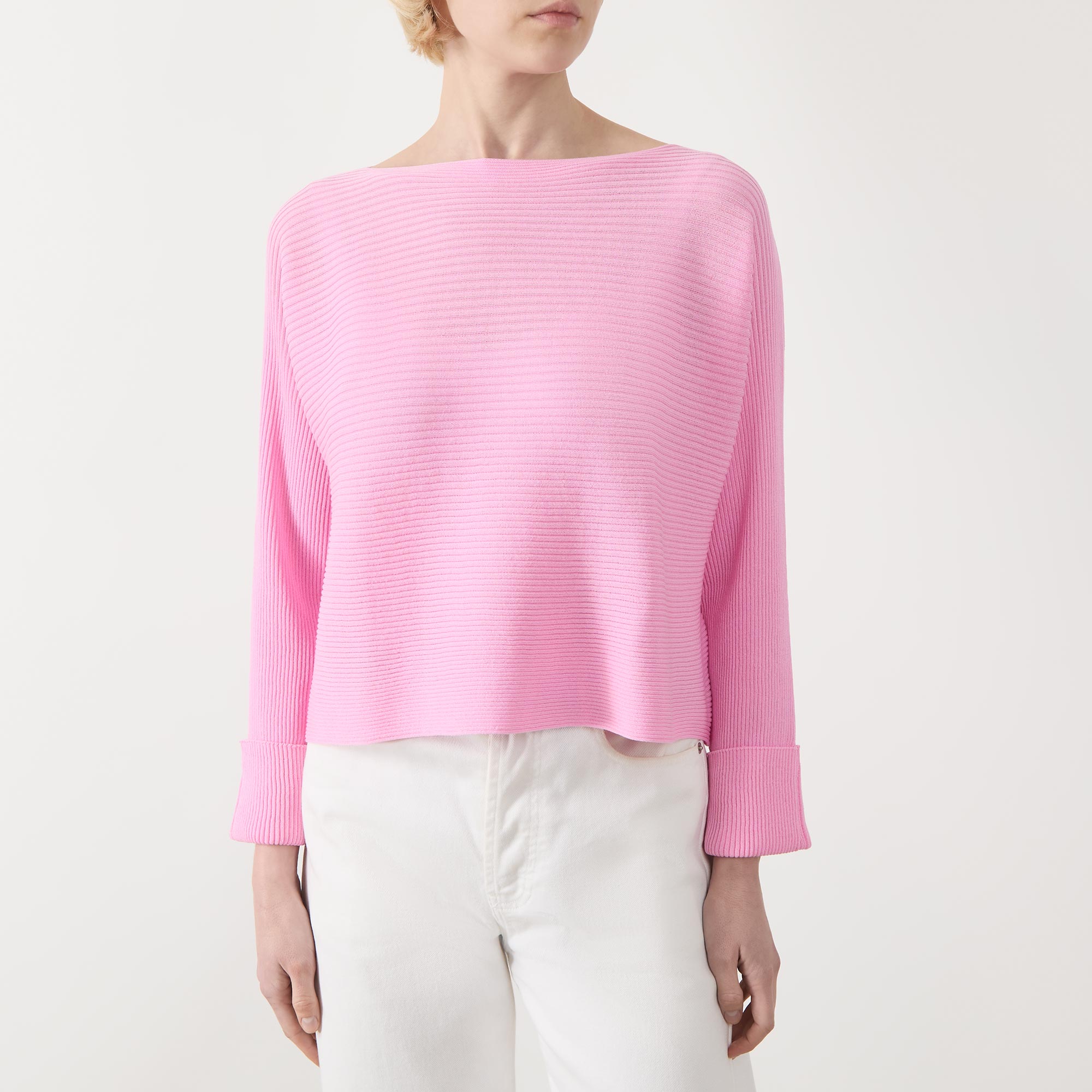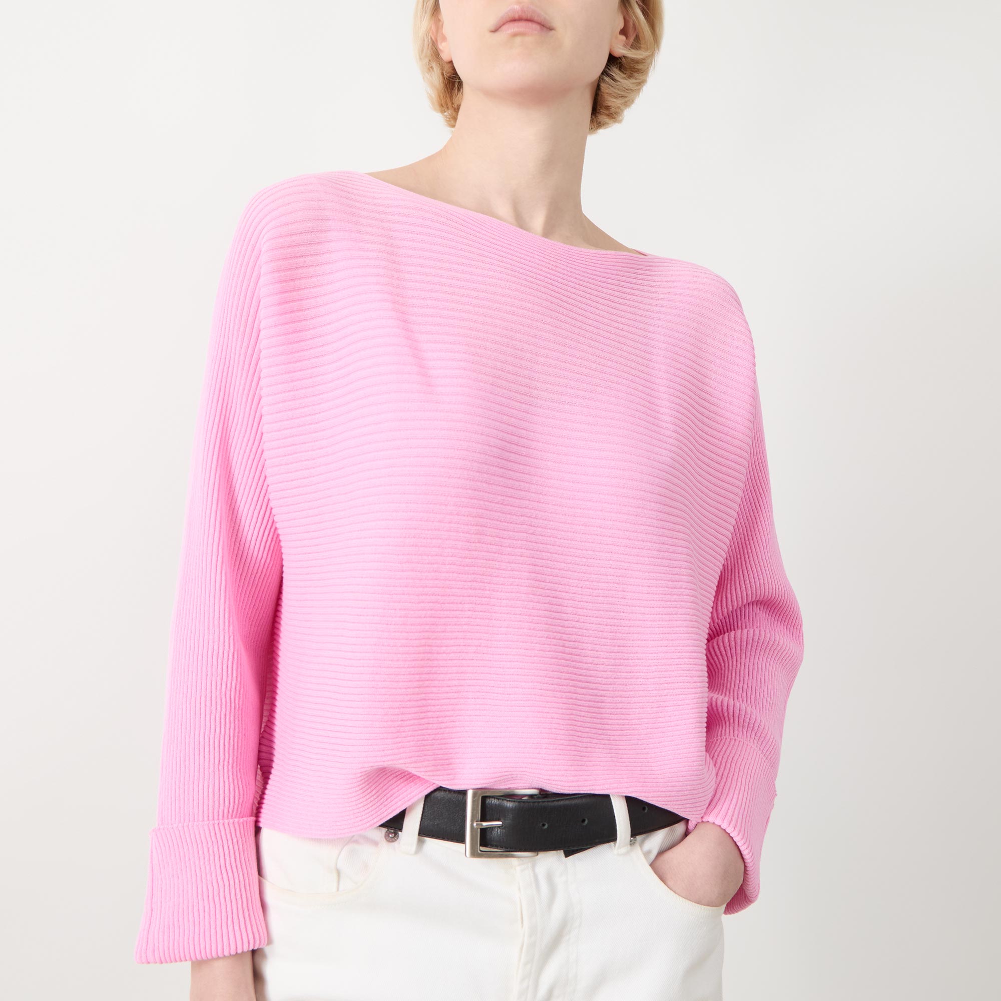 • Boat neckline, dropped shoulders, long sleeves, turn up cuffs, straight hem, rib knit construction, soft finish