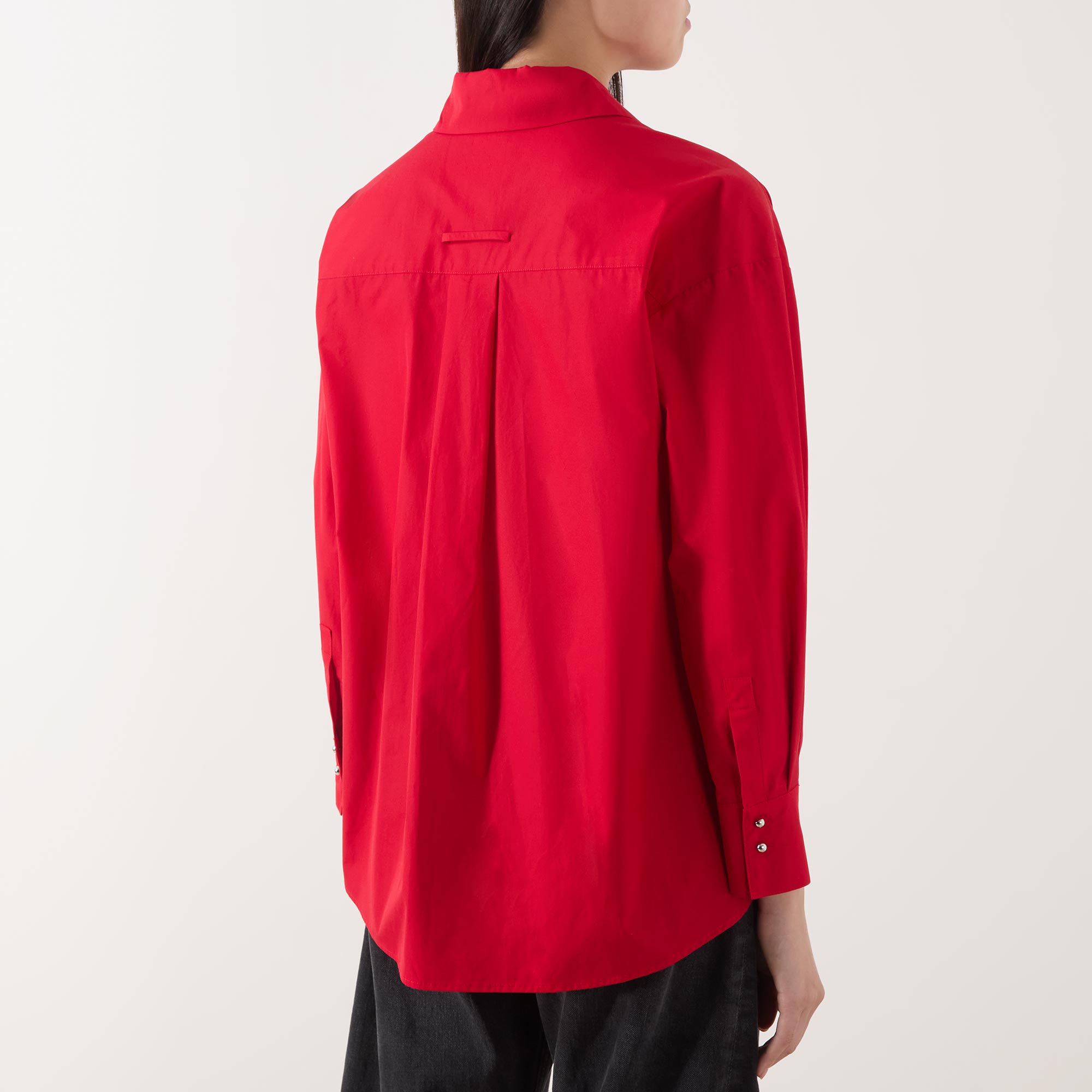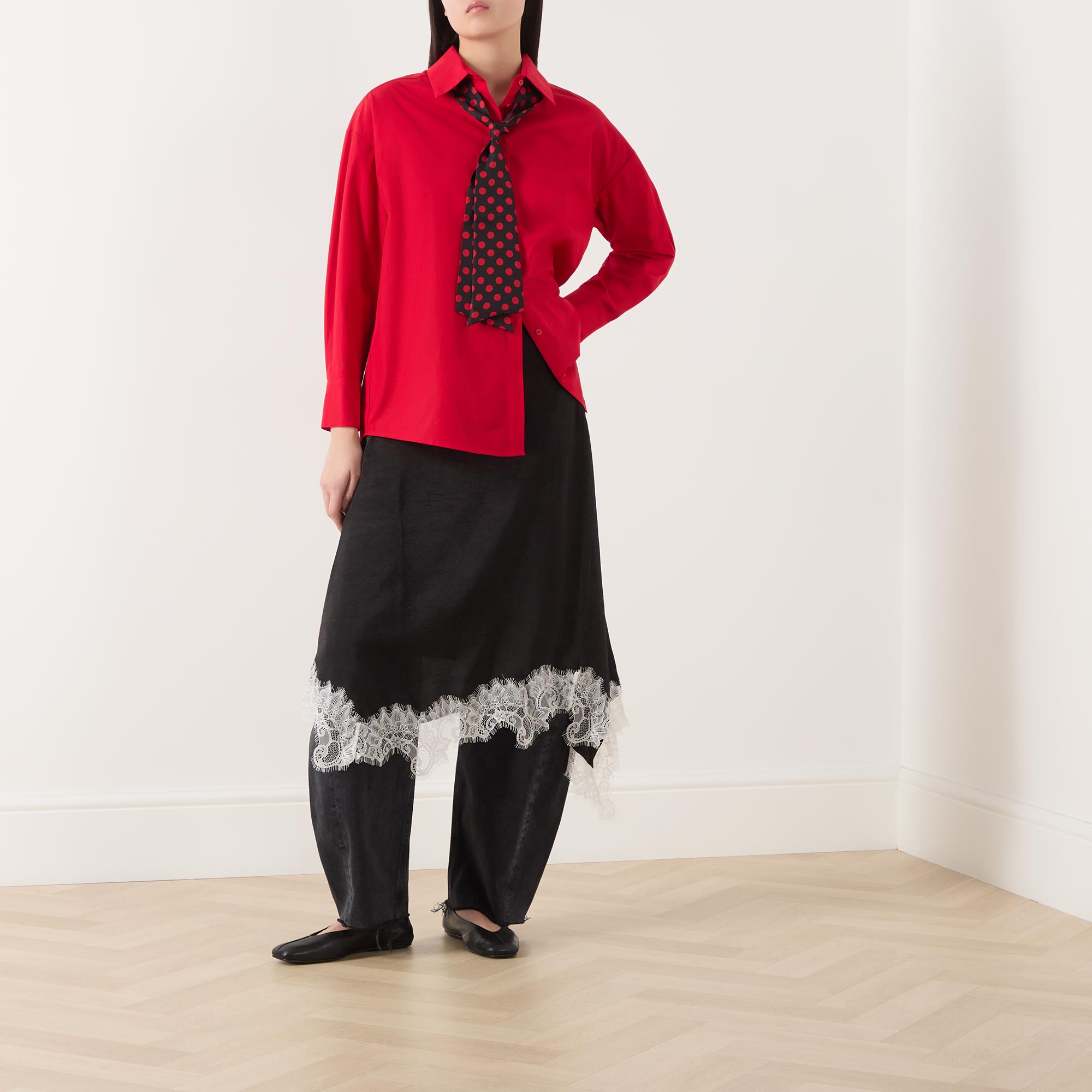 • Polka-dot tie, long sleeves, pointed collar, button fastenings, curved hemline