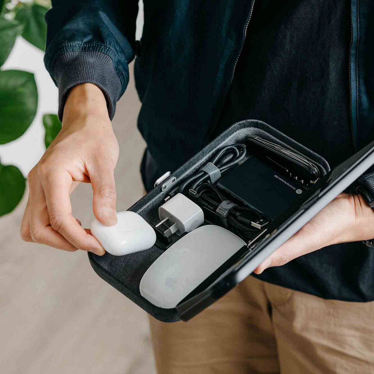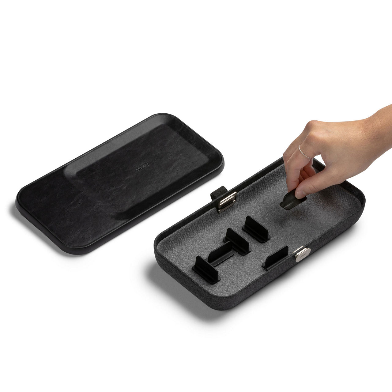 - In-built wireless charging pad (Nest V2 must be plugged in), USB-C power input, braided power cable included, customisable storage with movable dividers, single-layer organisation, dual-function hinge doubles as a pen loop, dedicated card storage