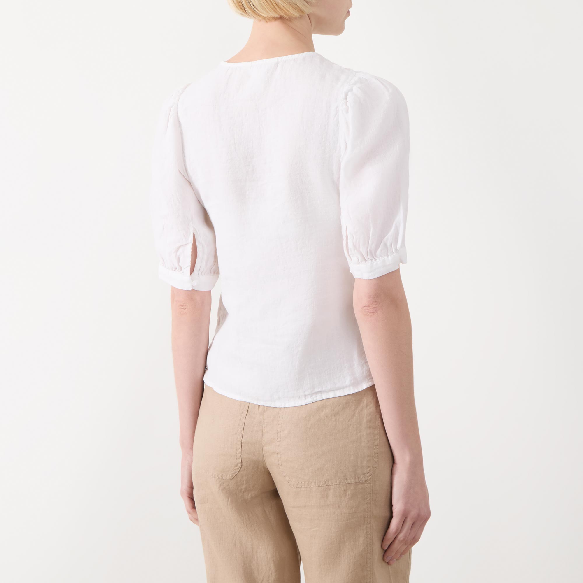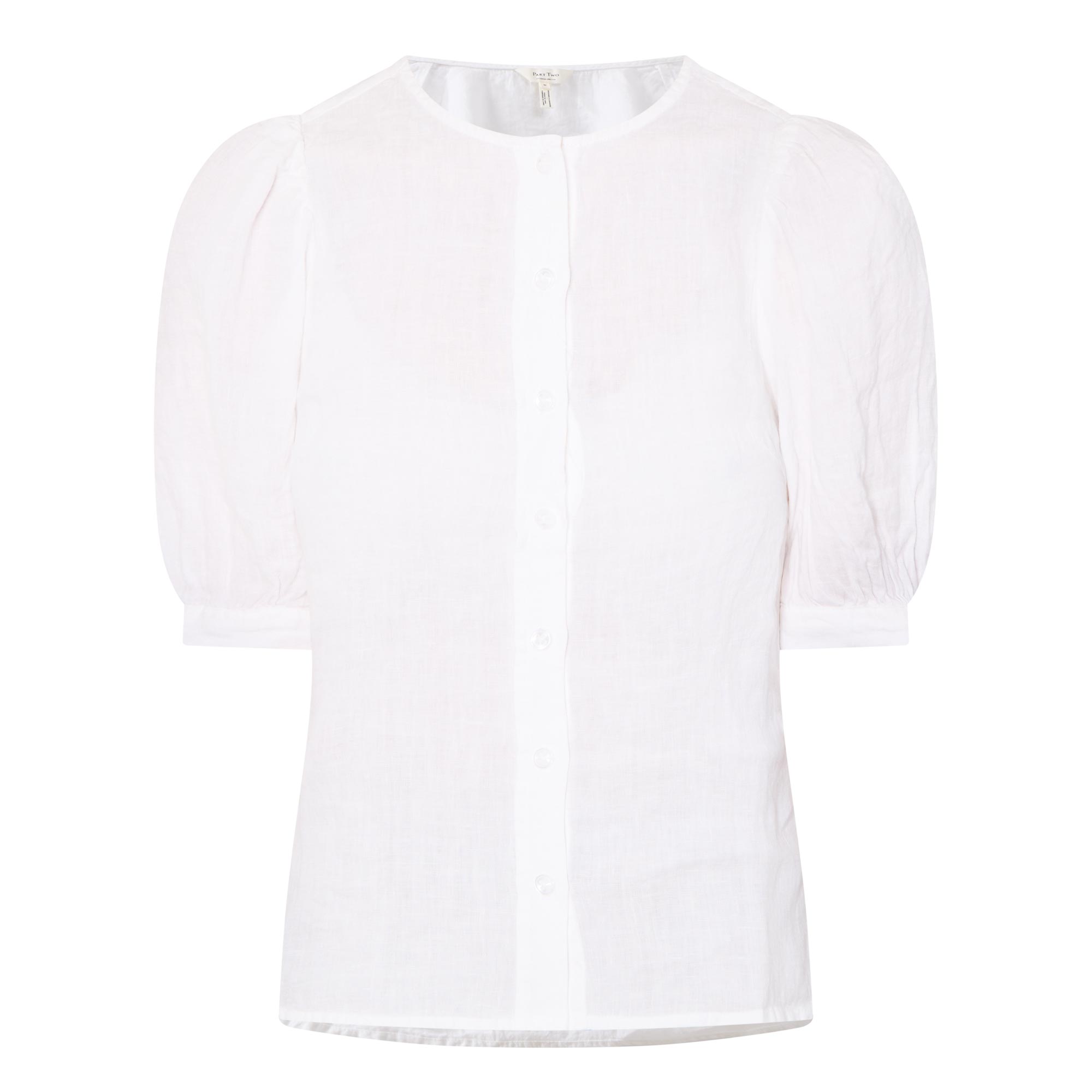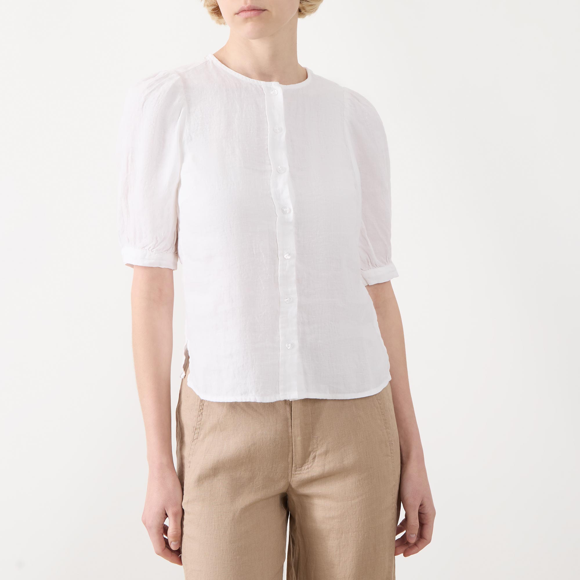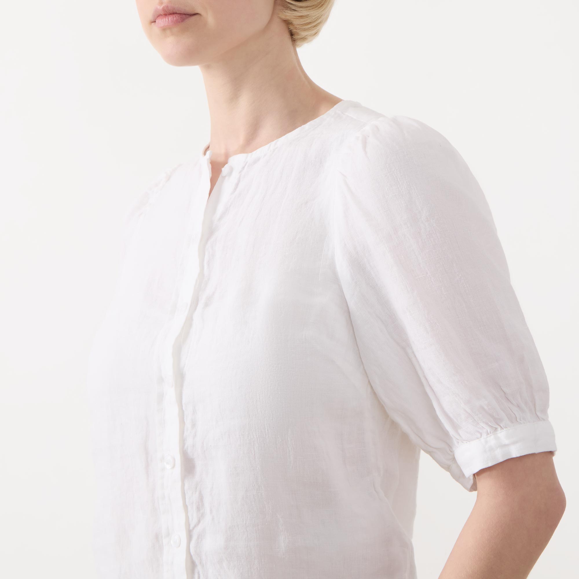 • Short gathered sleeves, lightweight, round neckline, front button fastenings