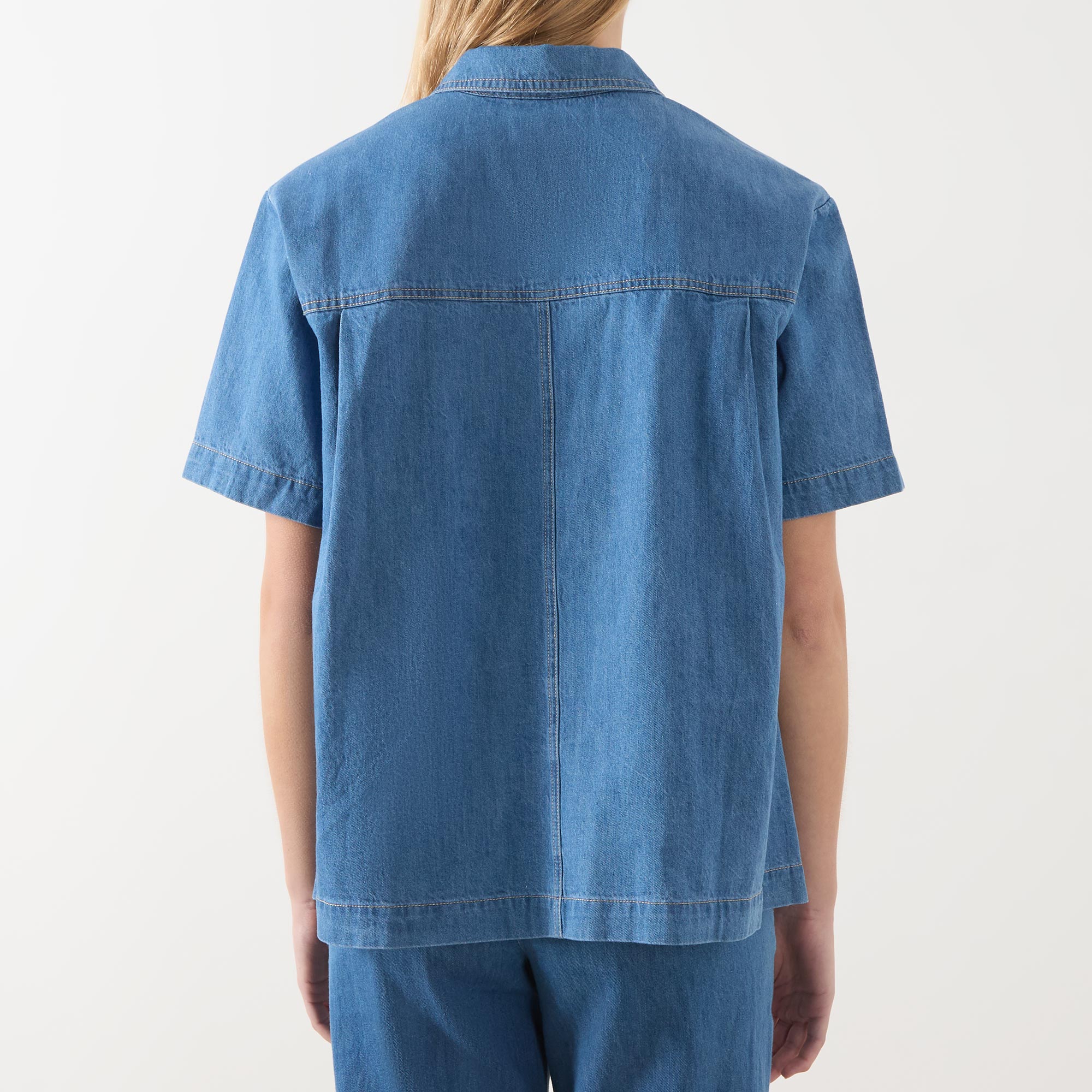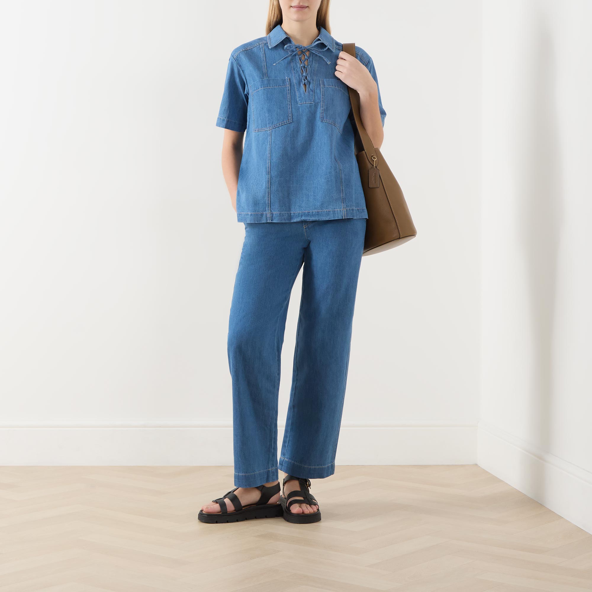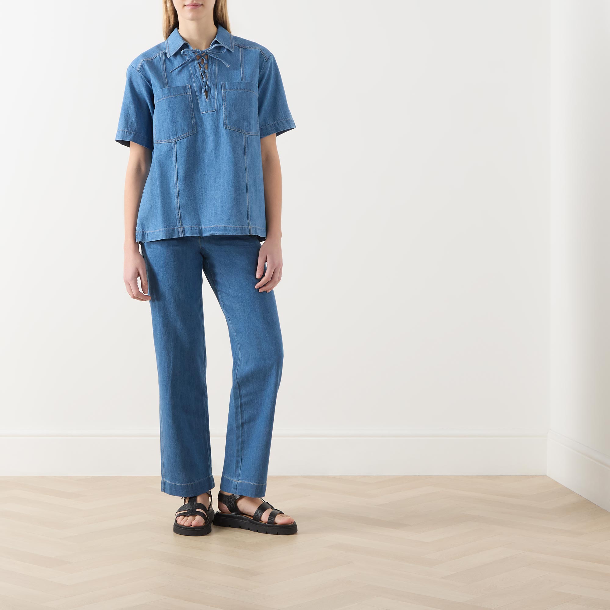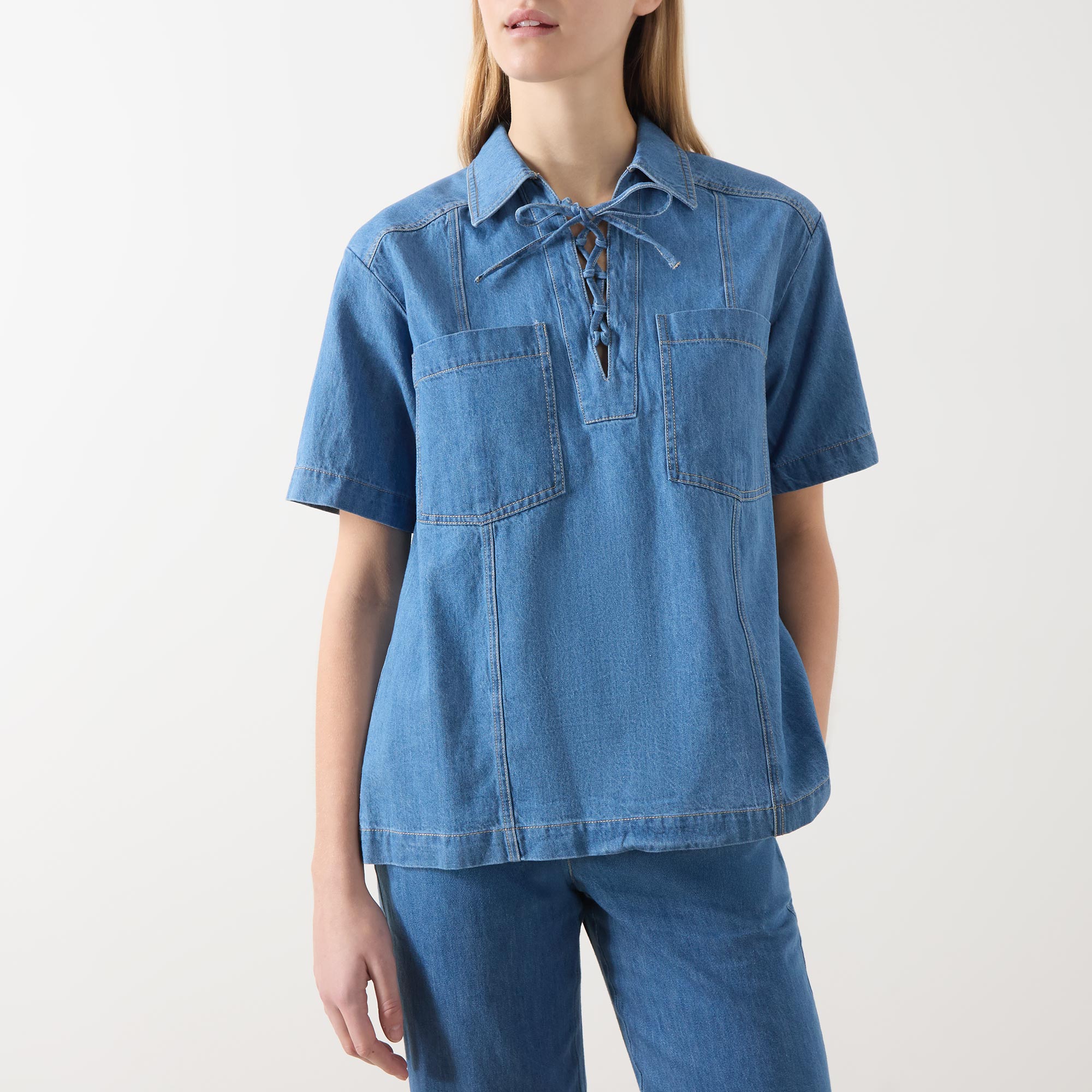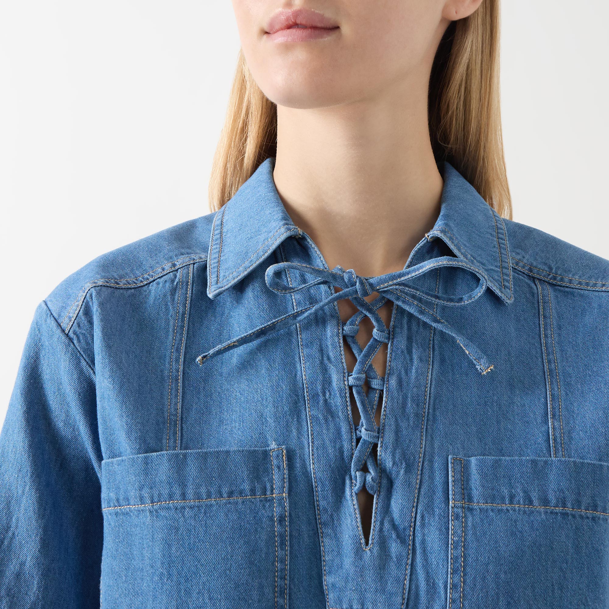 - Pointed collar, lace-up front, short sleeves, straight hemline, denim design