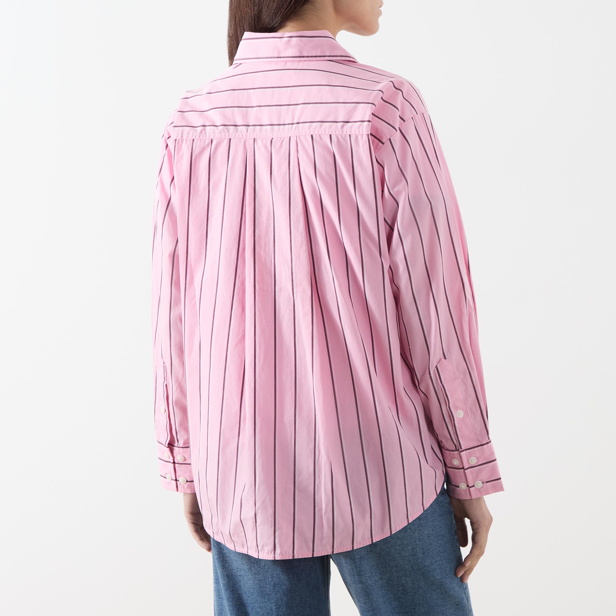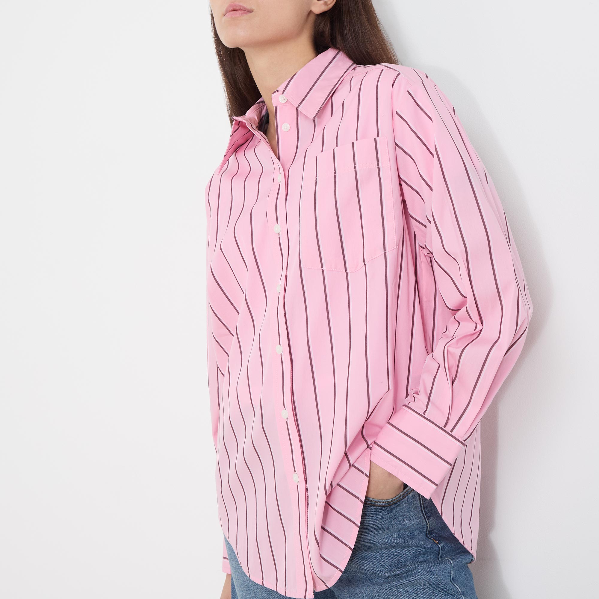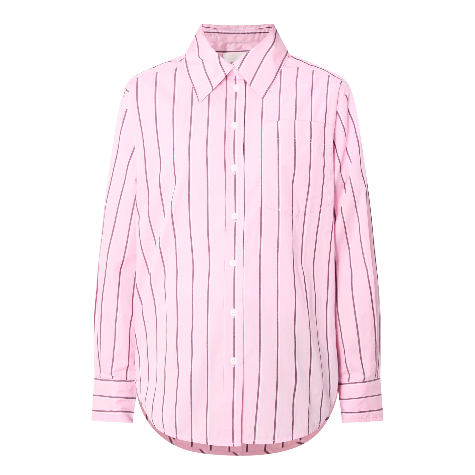- Pointed collar, button fastening, chest pocket, curved hemline, long sleeves, single-cuff, stripe pattern