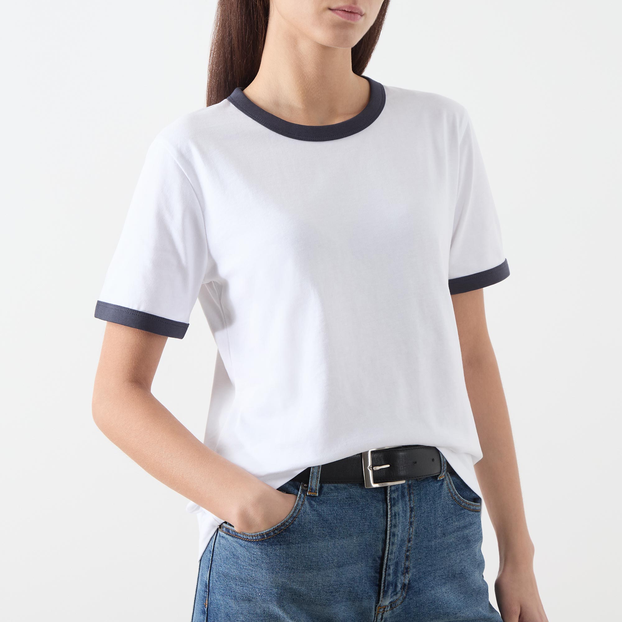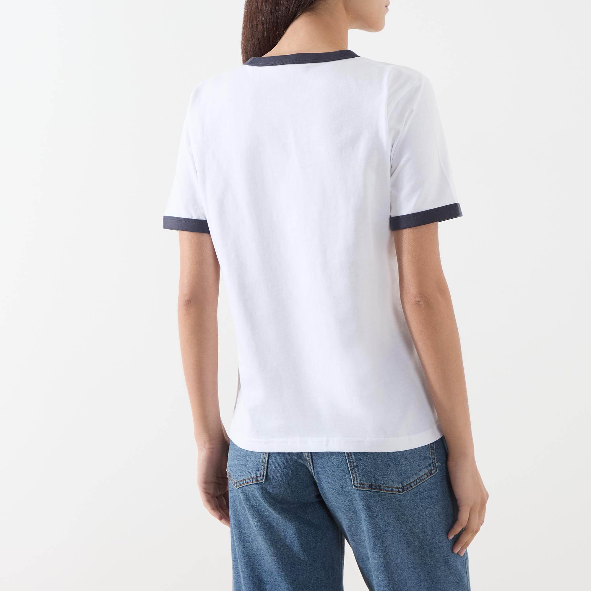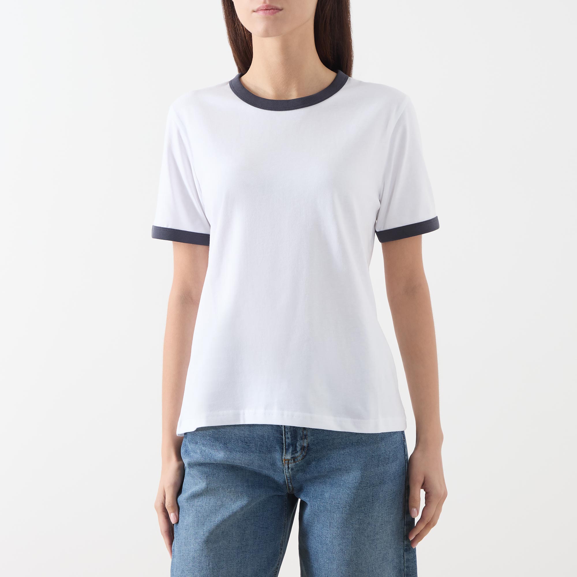 - Round neck, short sleeves, straight hemline, contrast trim