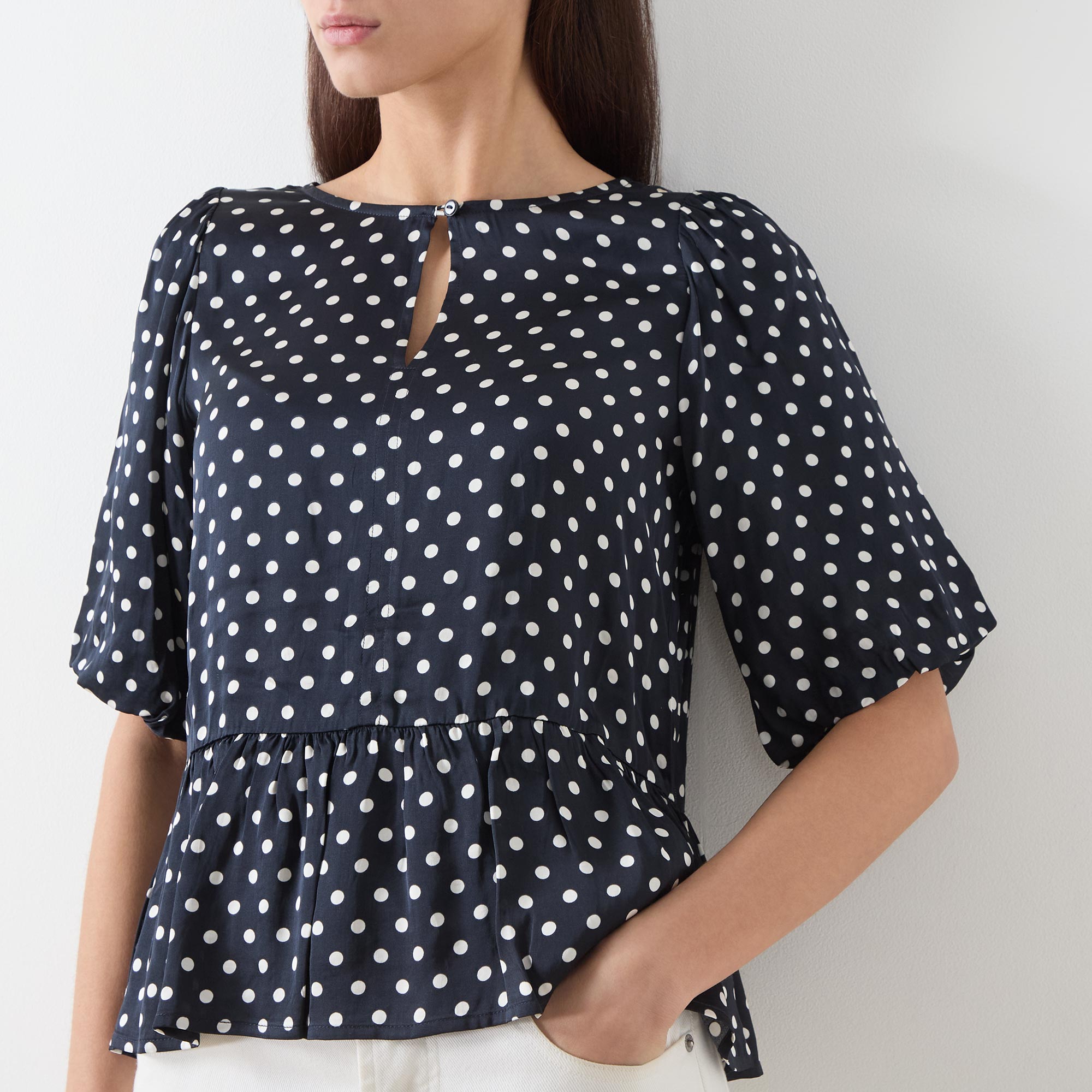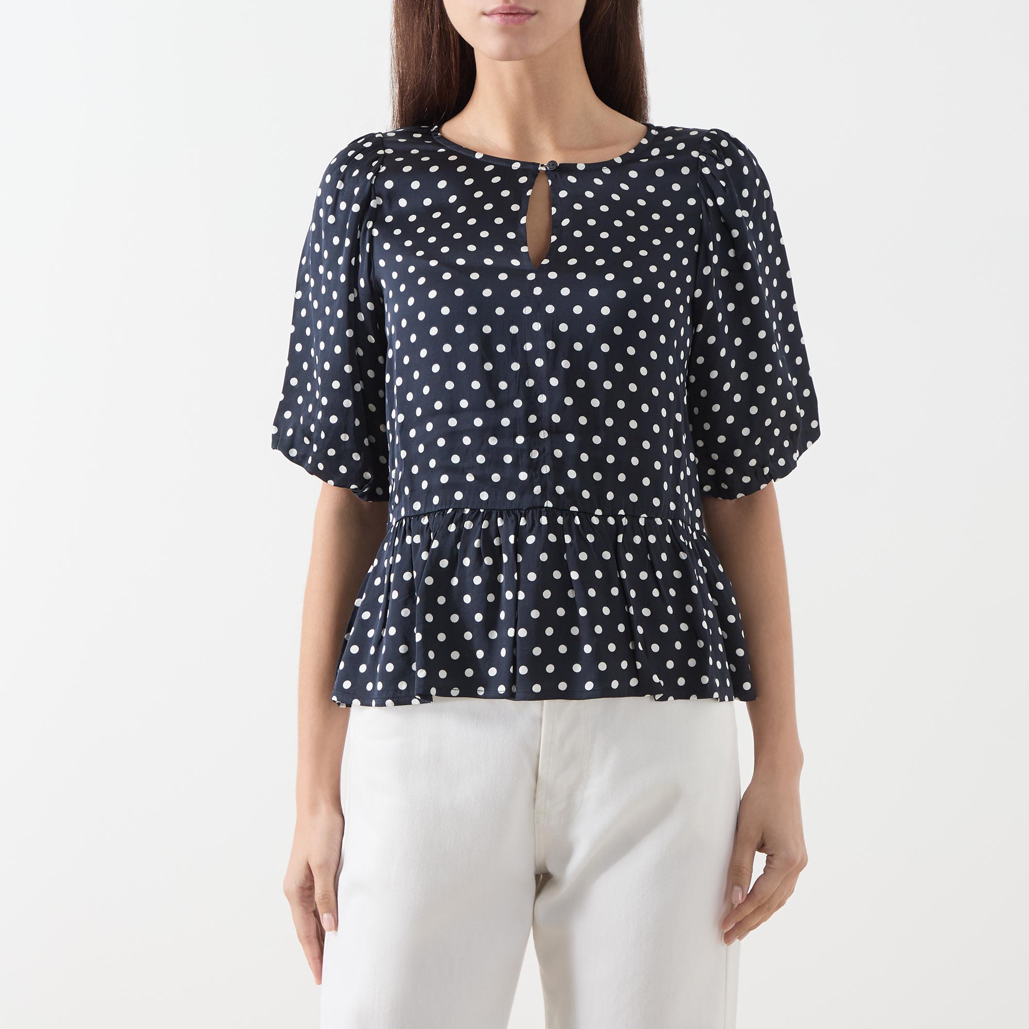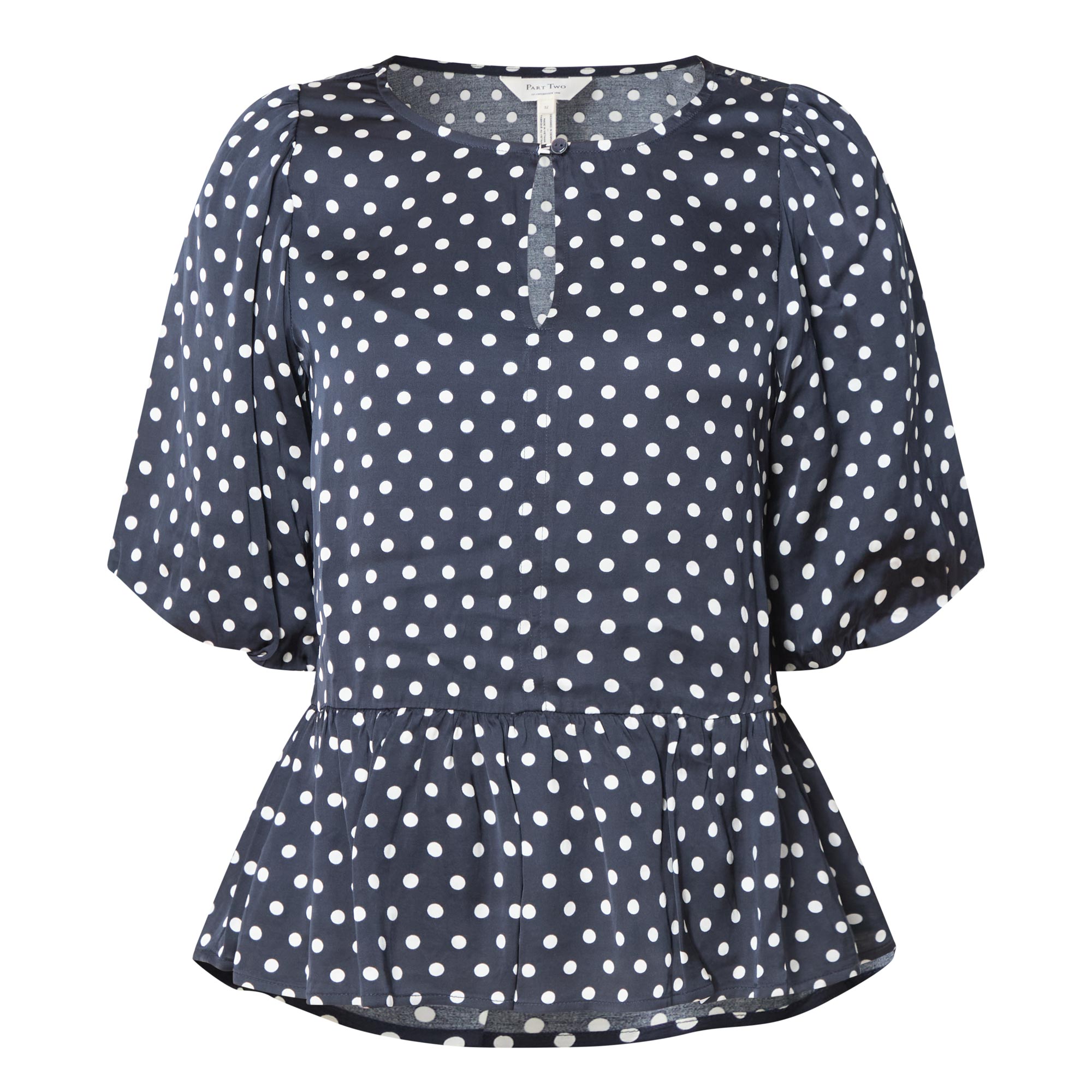 - Round neckline with buttoned keyhole detail, short puff sleeves, peplum hemline, polka dot pattern