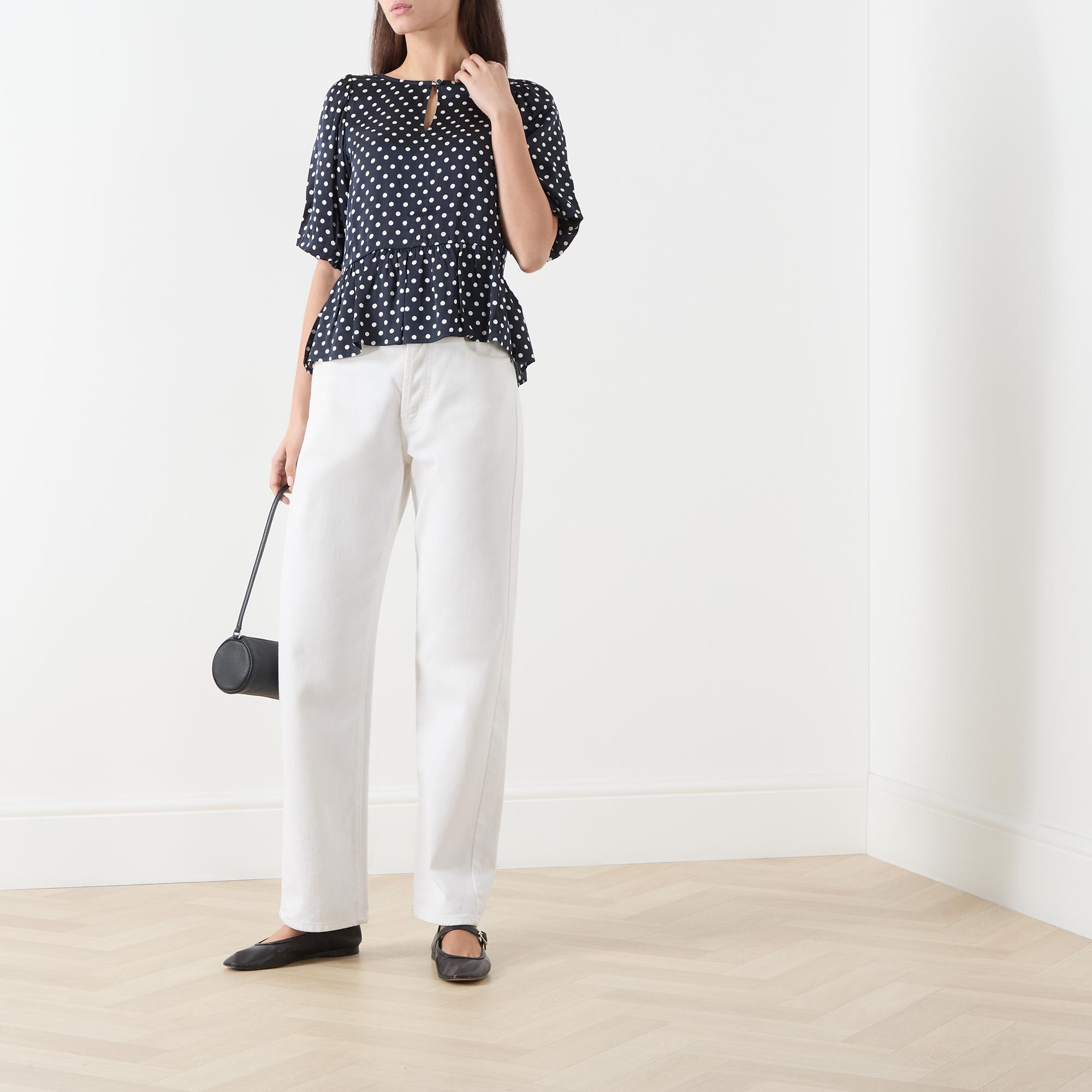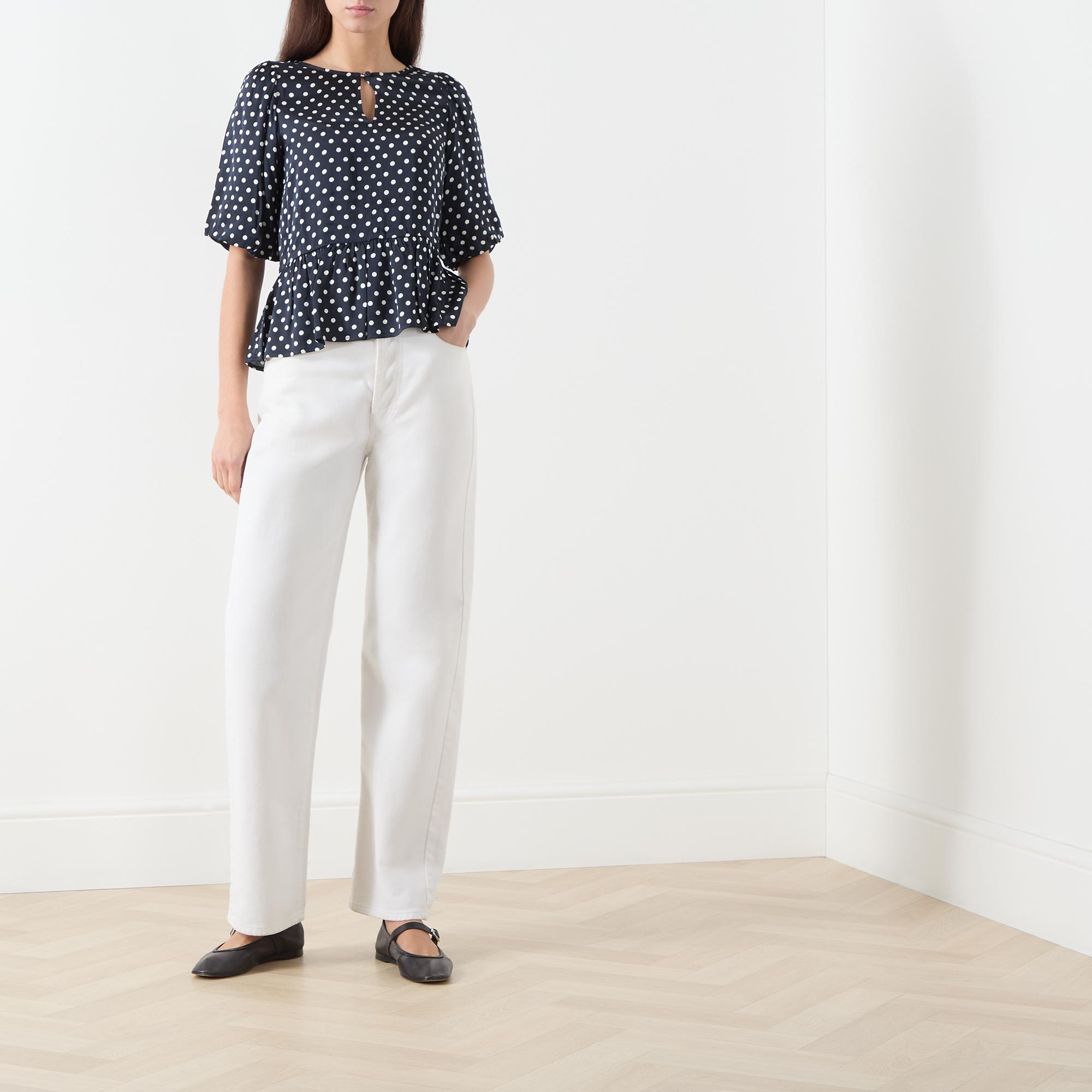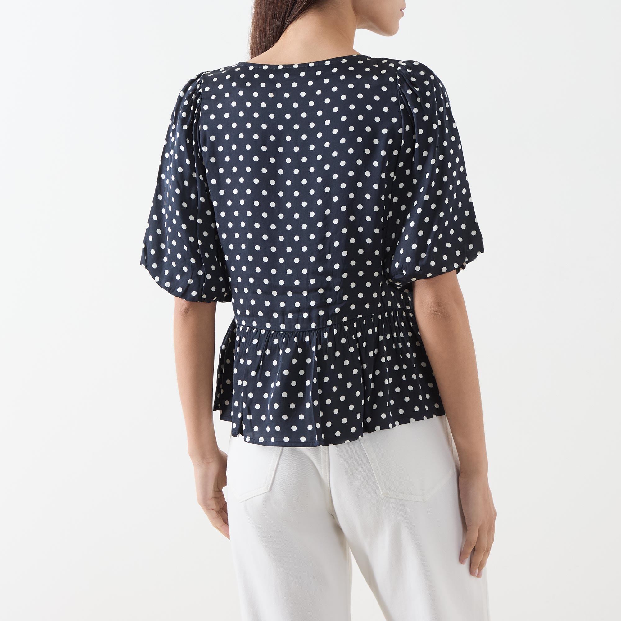 - Round neckline with buttoned keyhole detail, short puff sleeves, peplum hemline, polka dot pattern