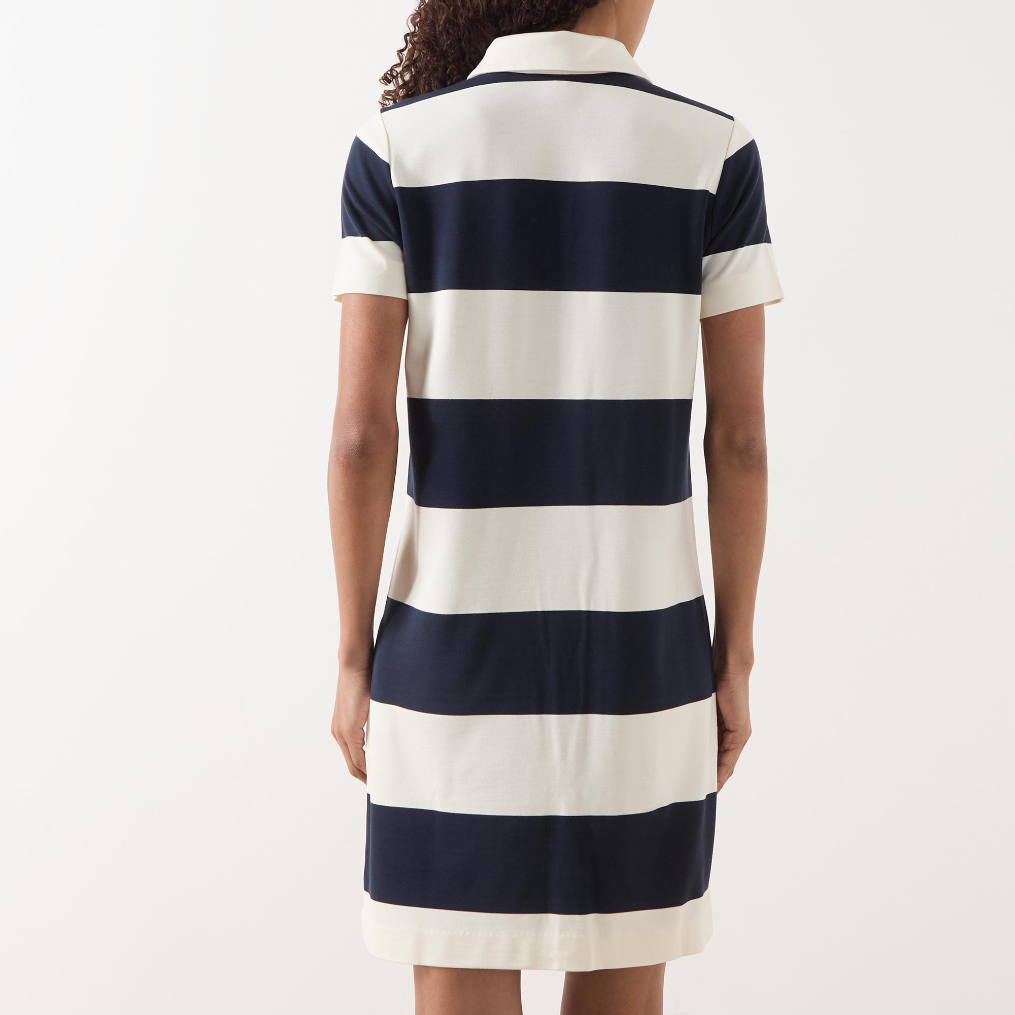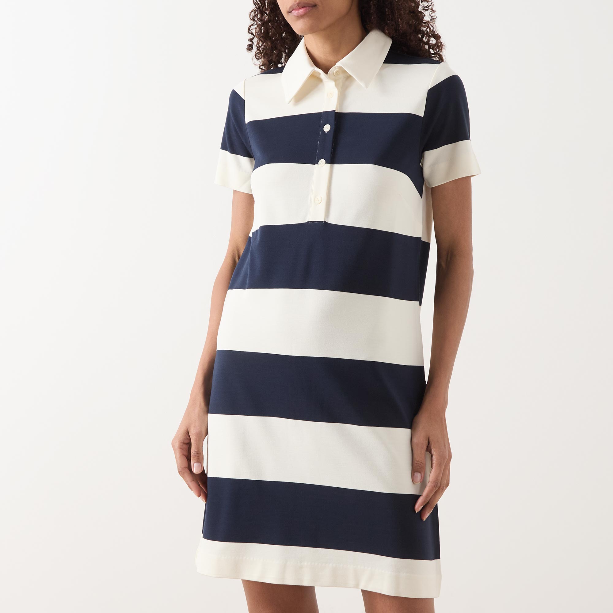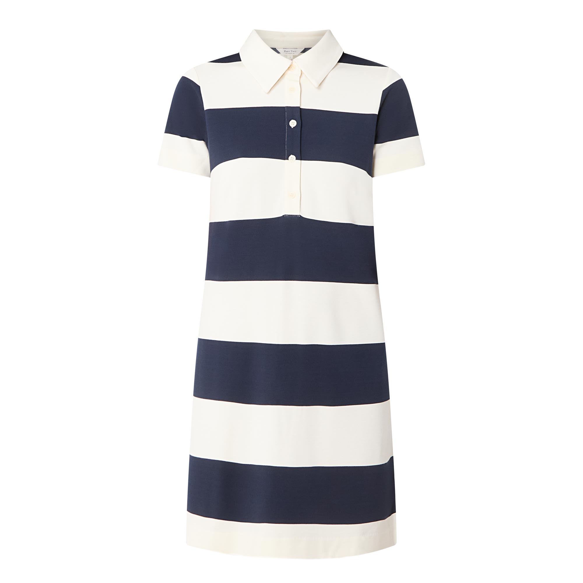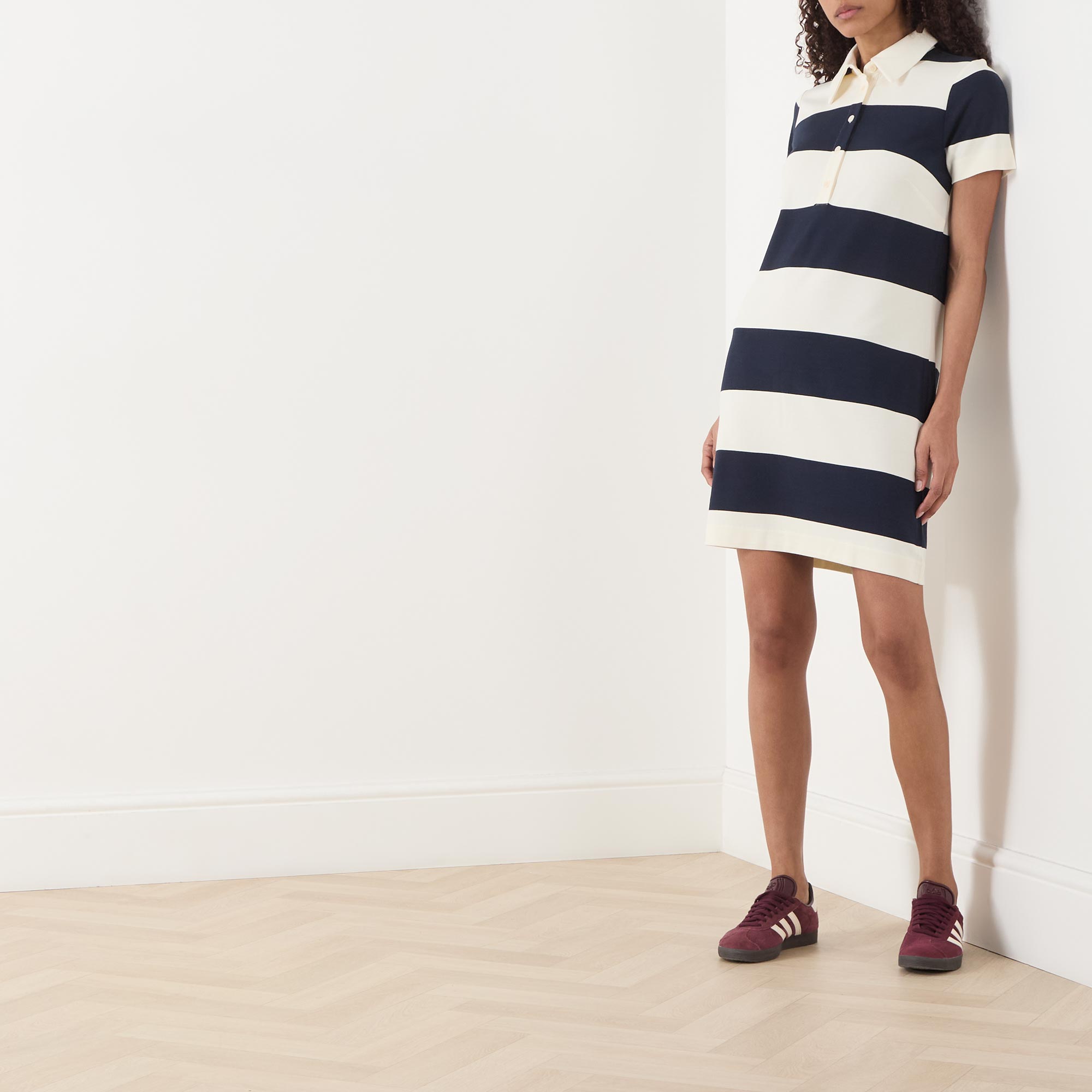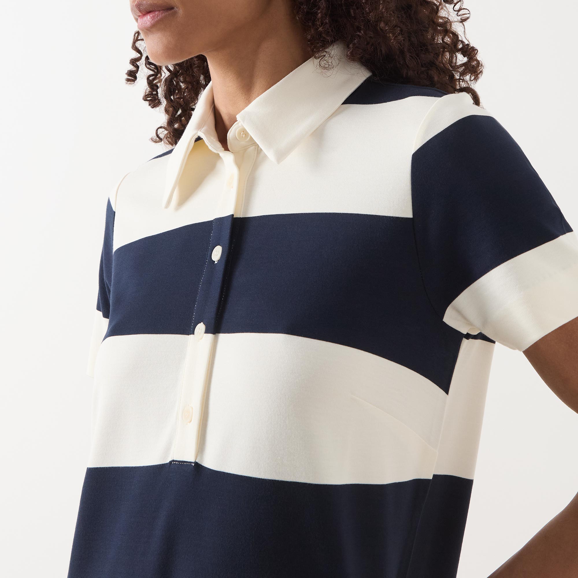 - Collared neckline, half-button fastening, short sleeves, mini length, stripe pattern, straight hemline