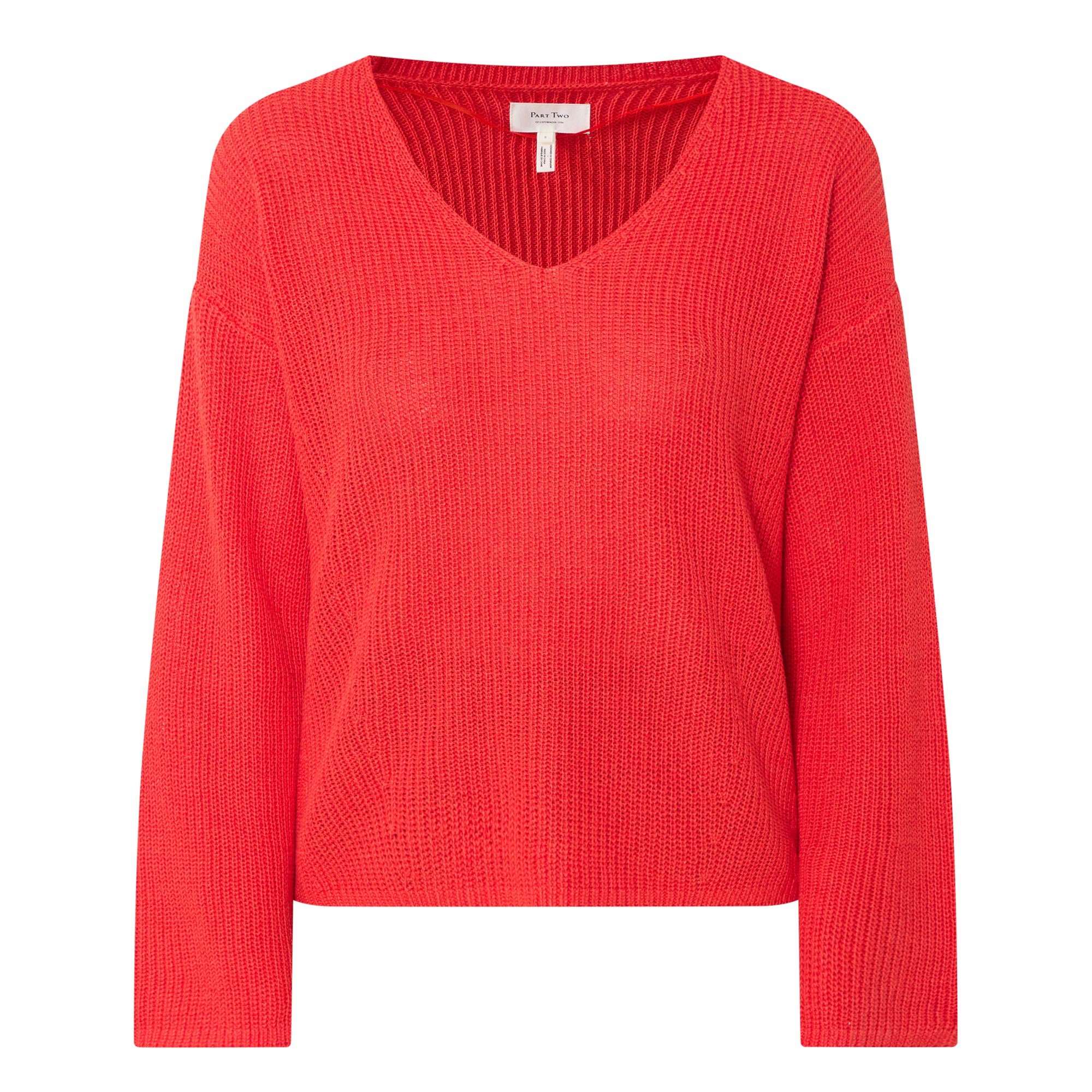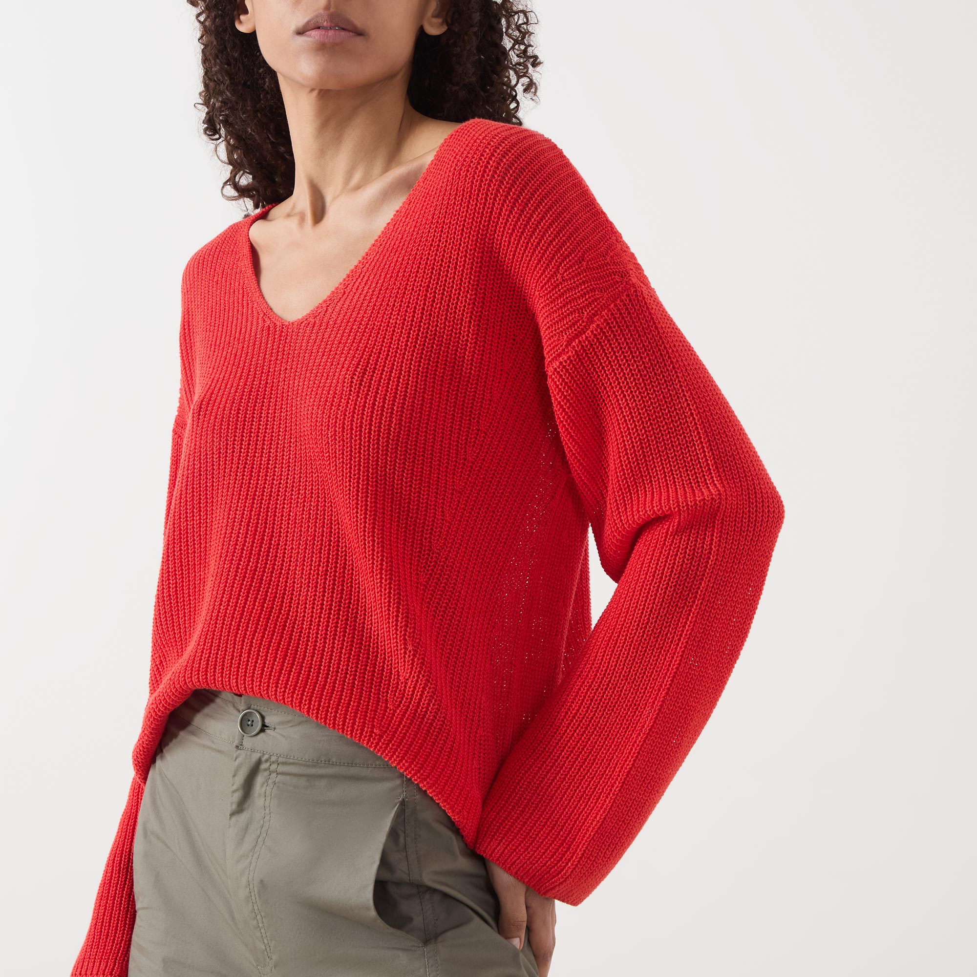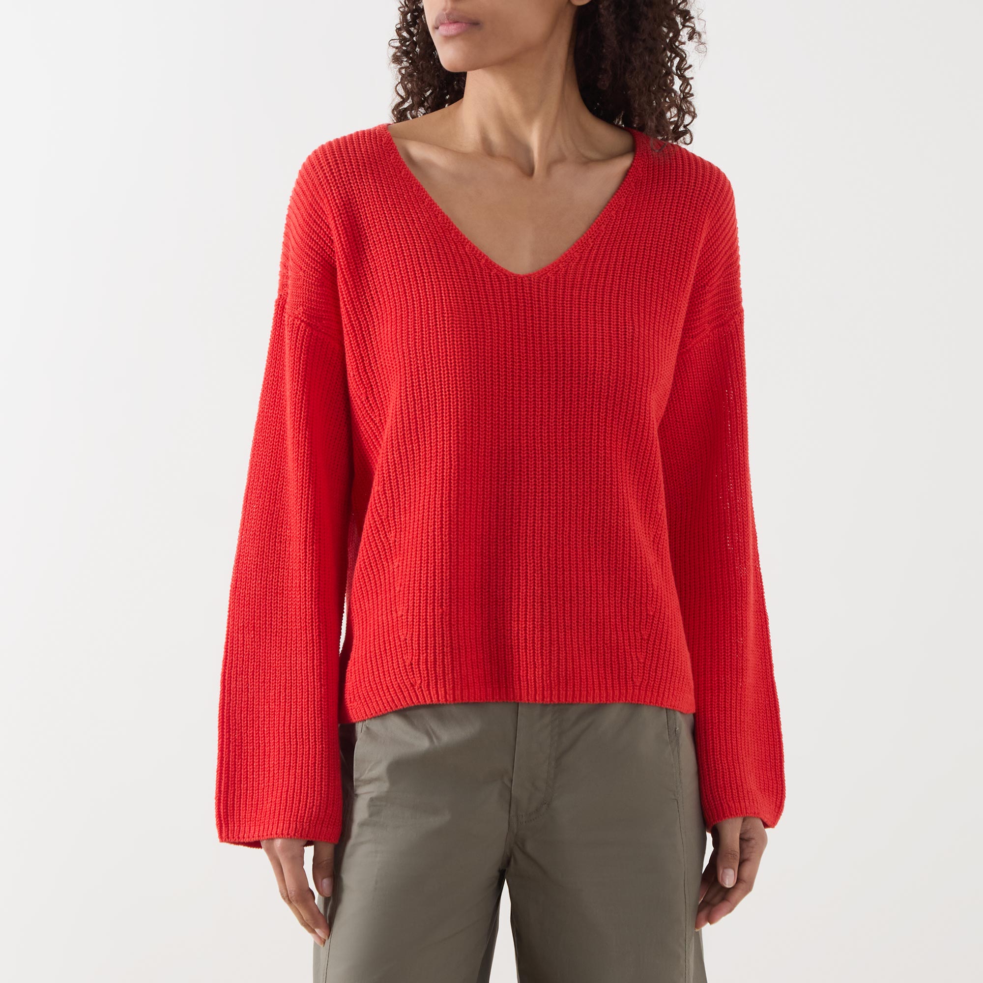 - Rib texture, V-neckline, long sleeves, straight hemline