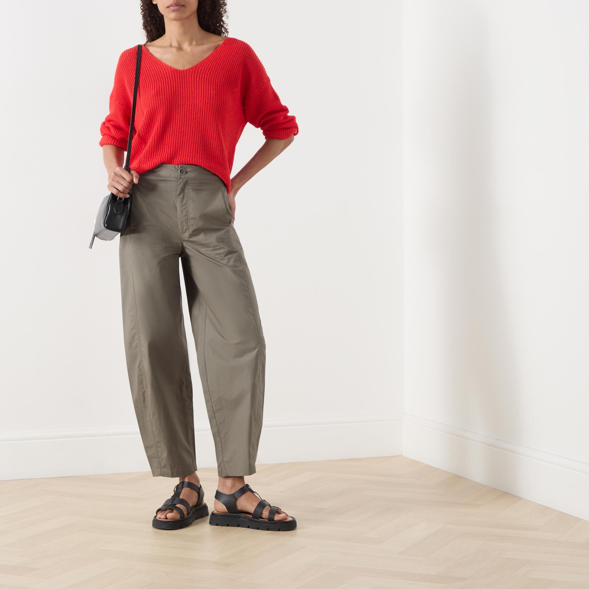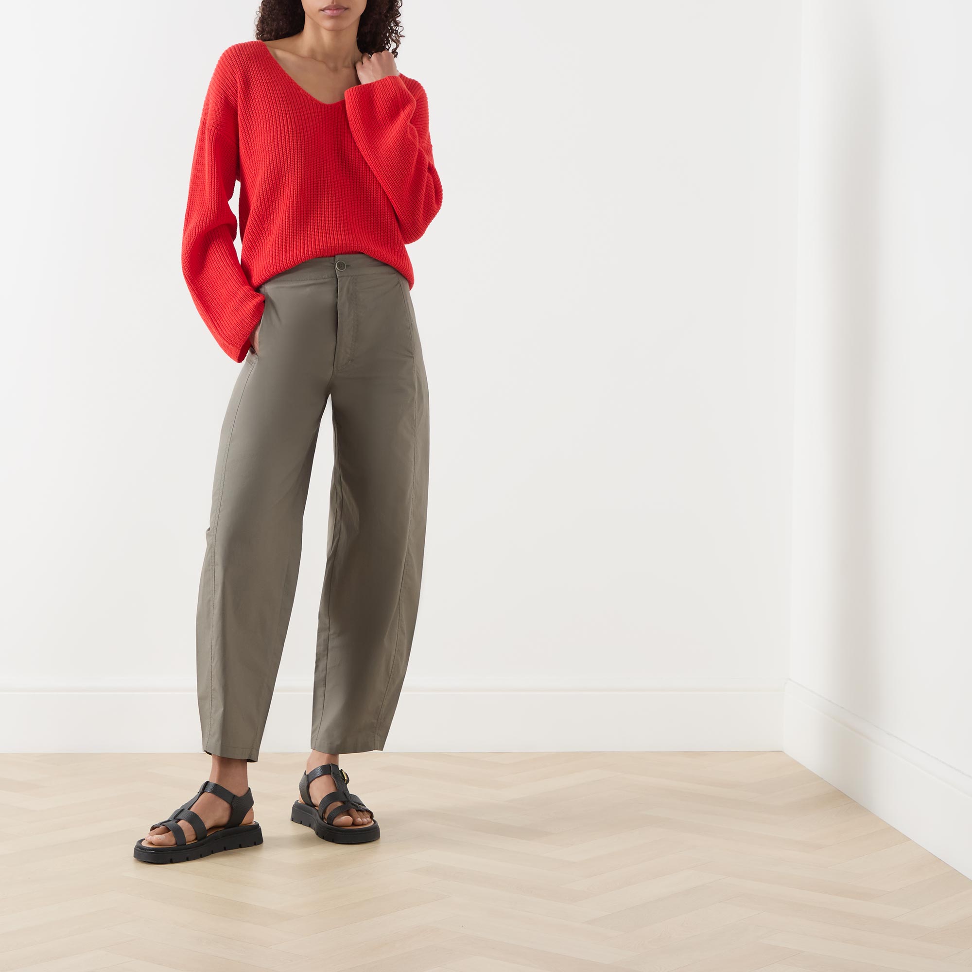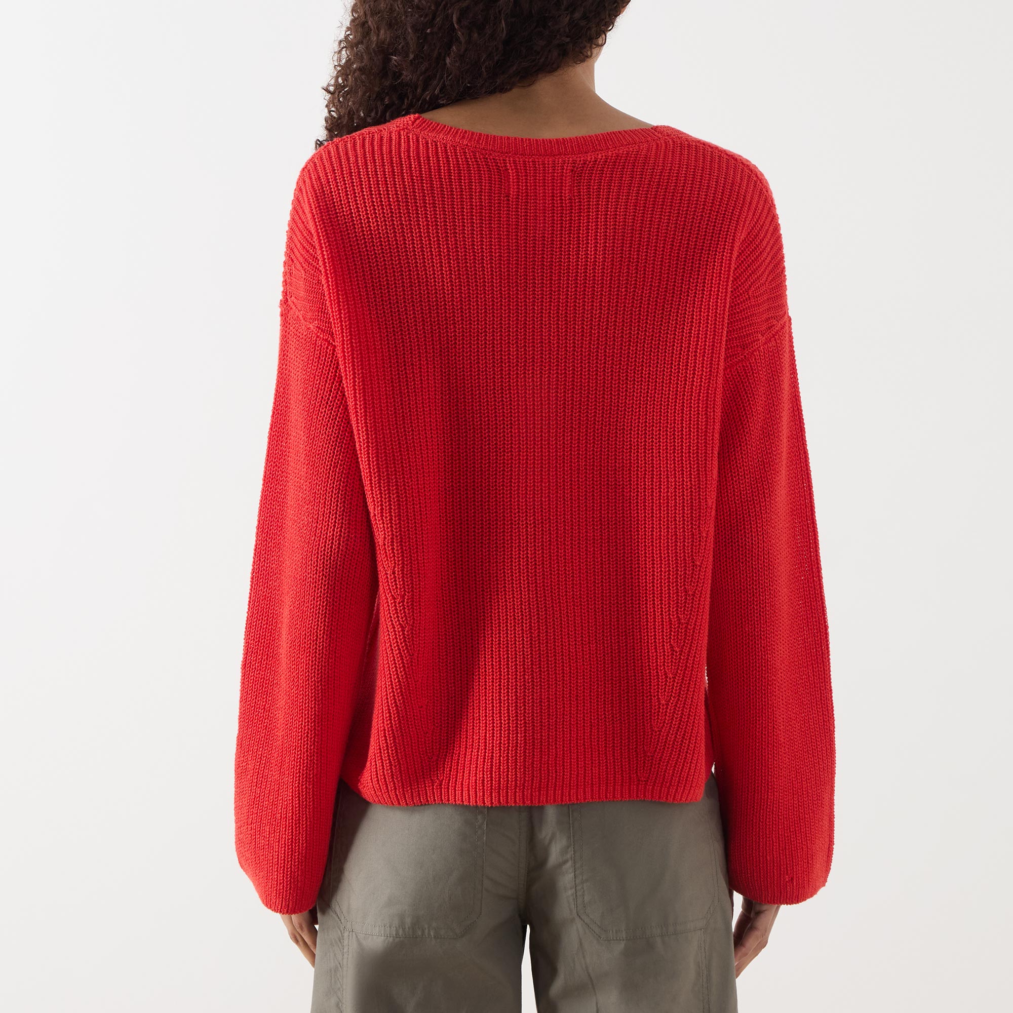 - Rib texture, V-neckline, long sleeves, straight hemline