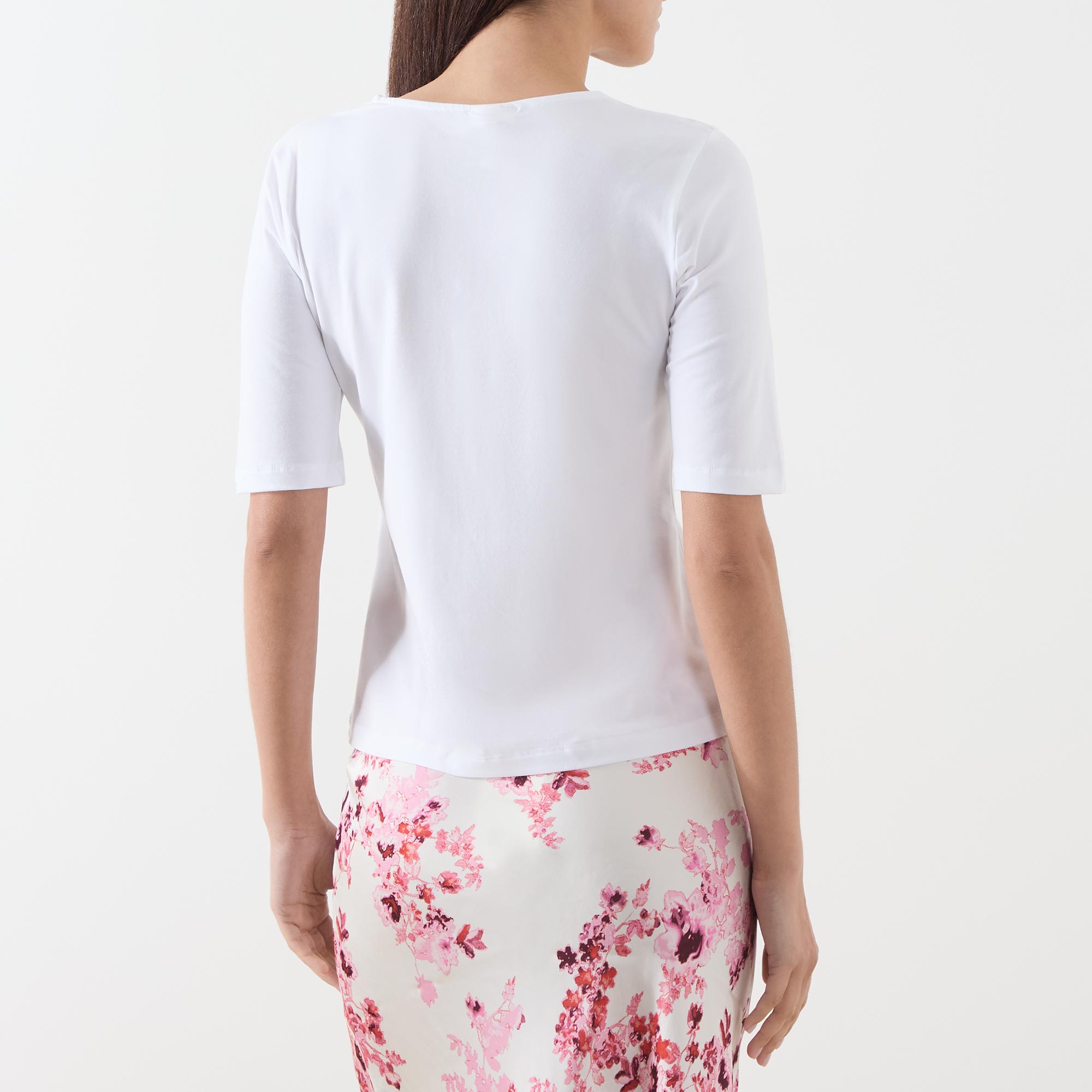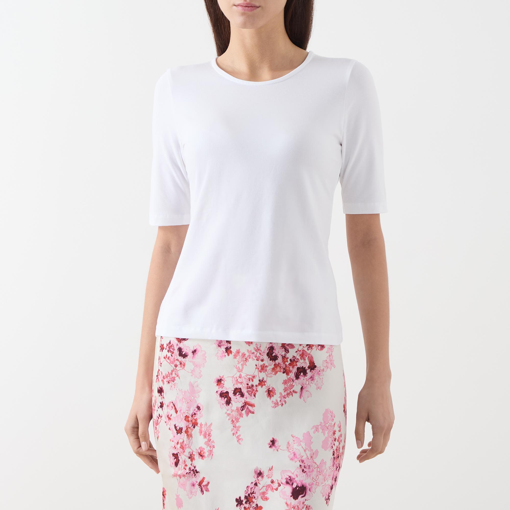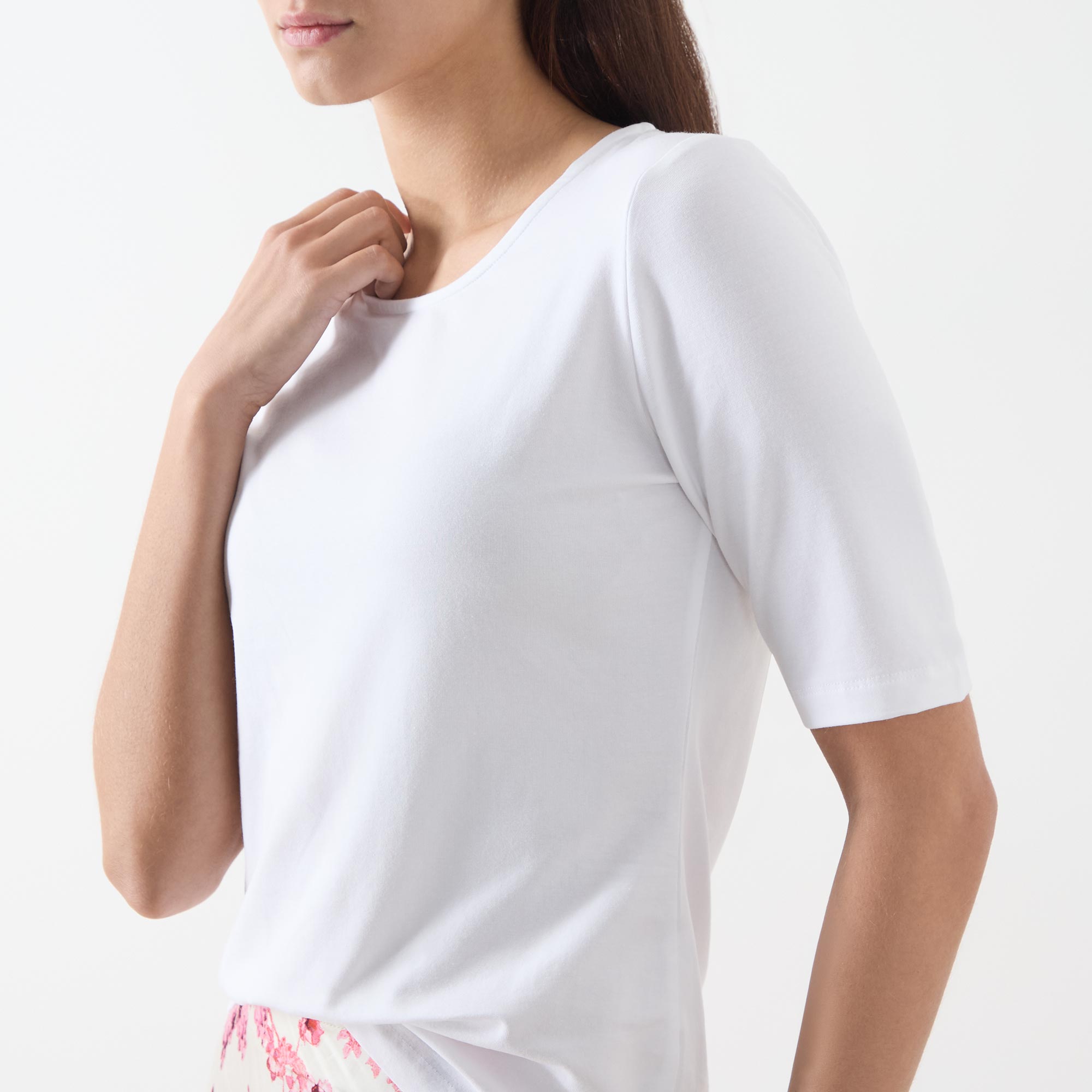 - Cropped sleeves, round neck, straight hemline