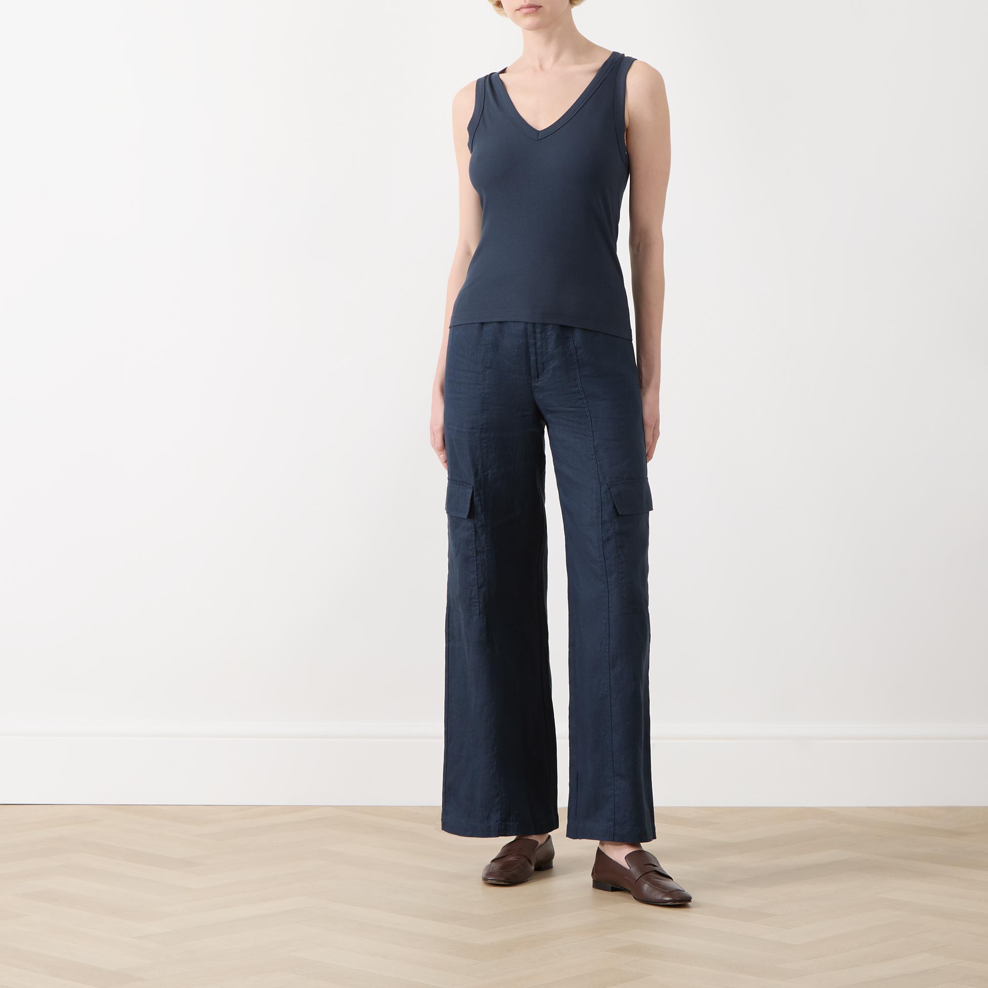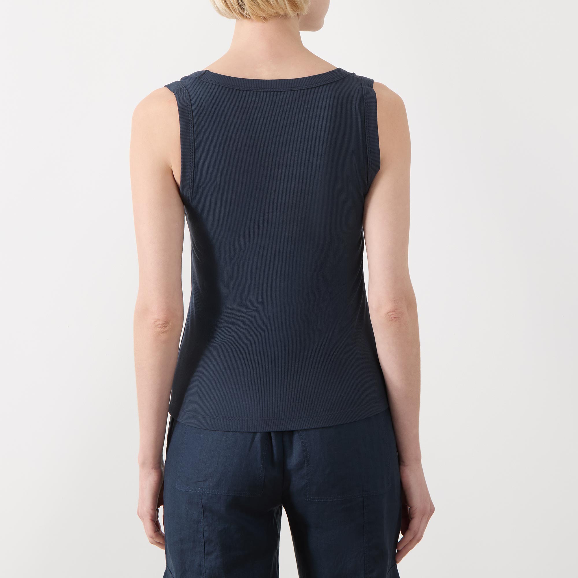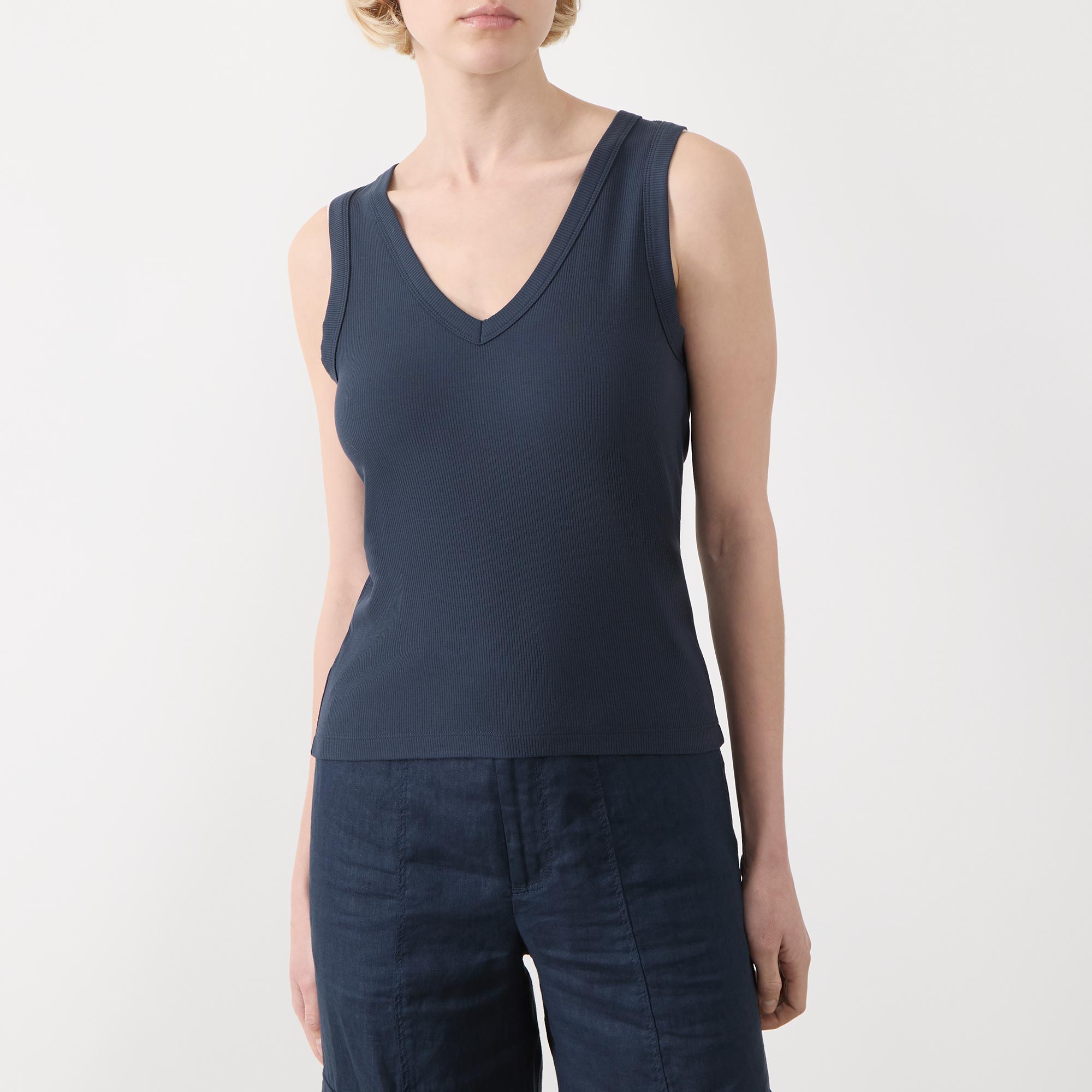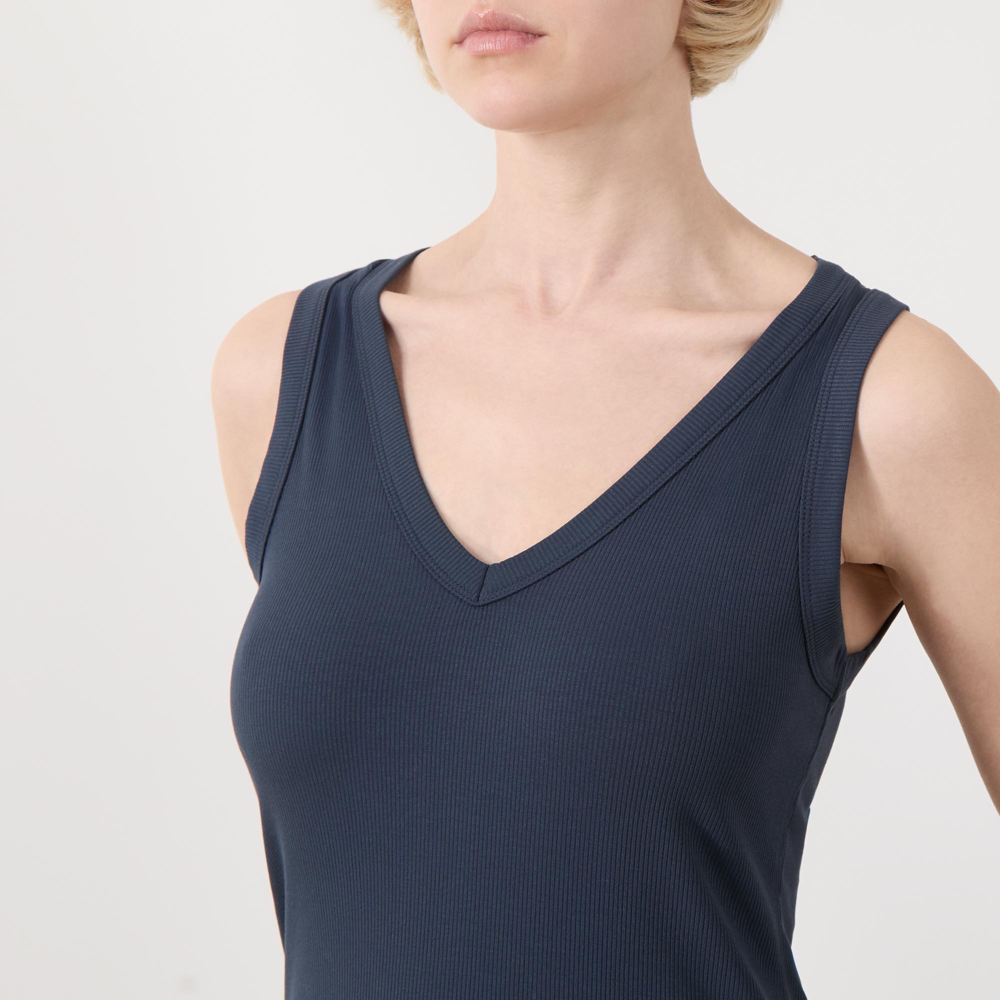 • V-neckline, ribbed finish, sleeveless, straight hem