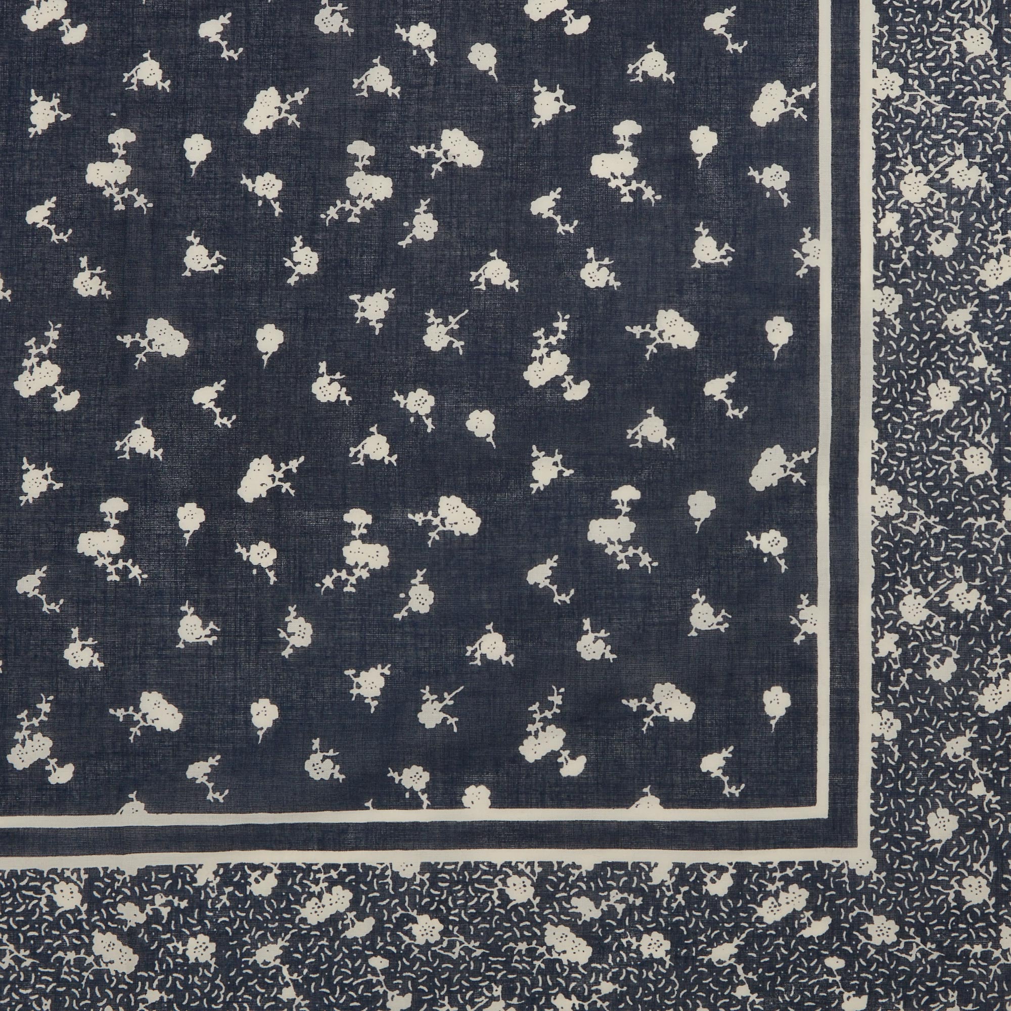 - Wrap style, clean edges, floral print, contrasting border, woven design, lightweight, soft finish