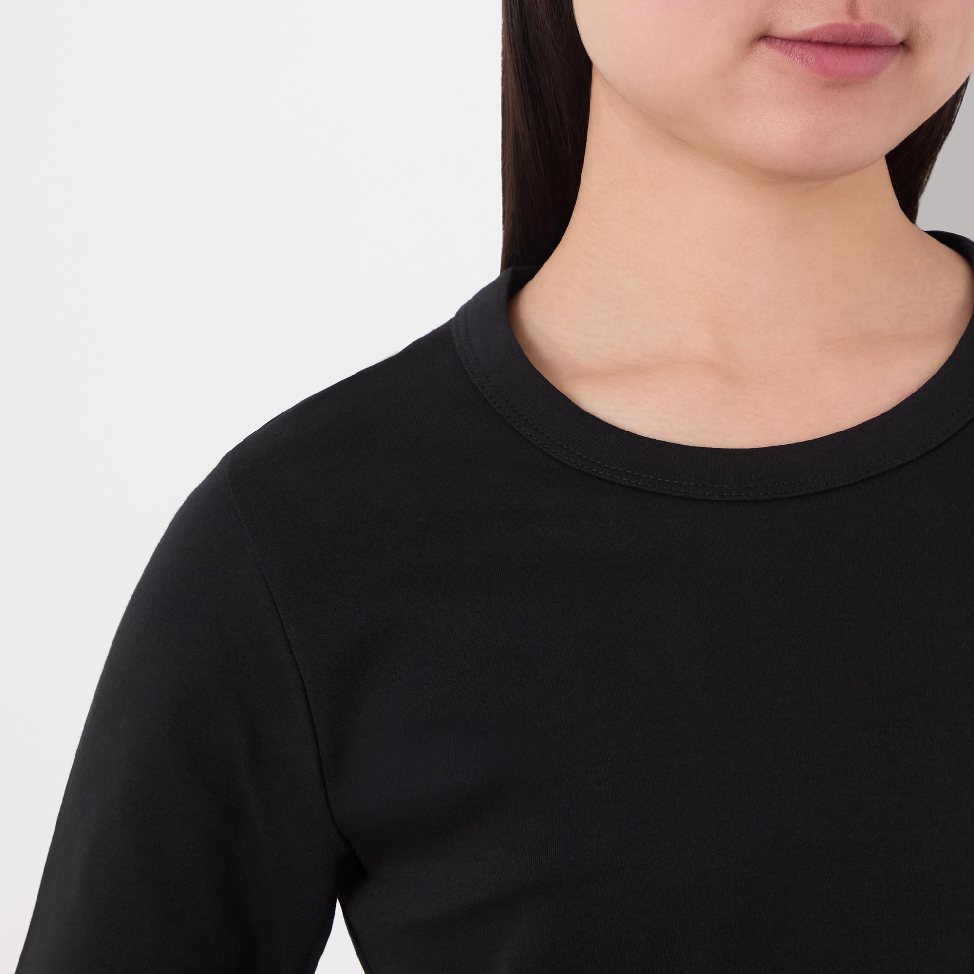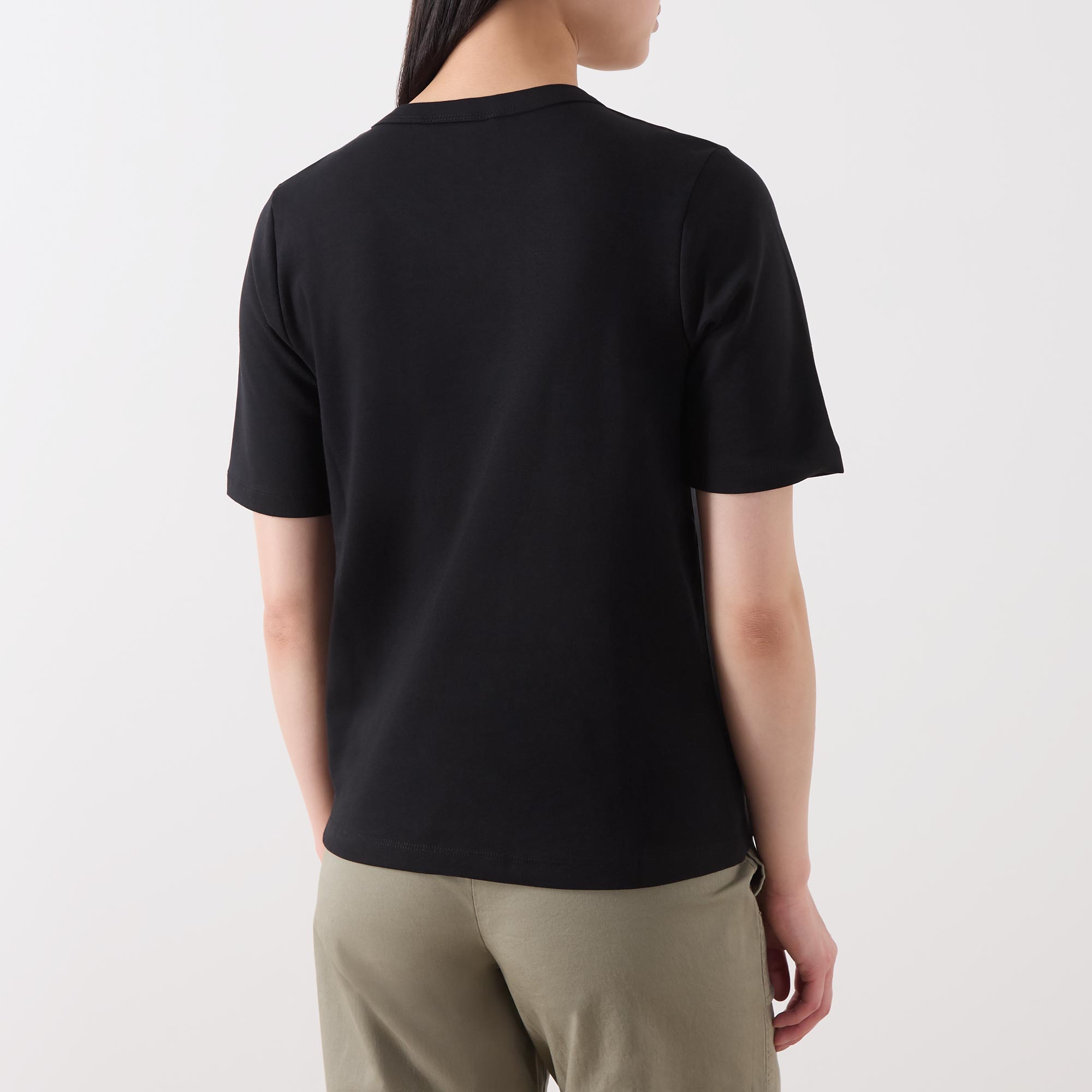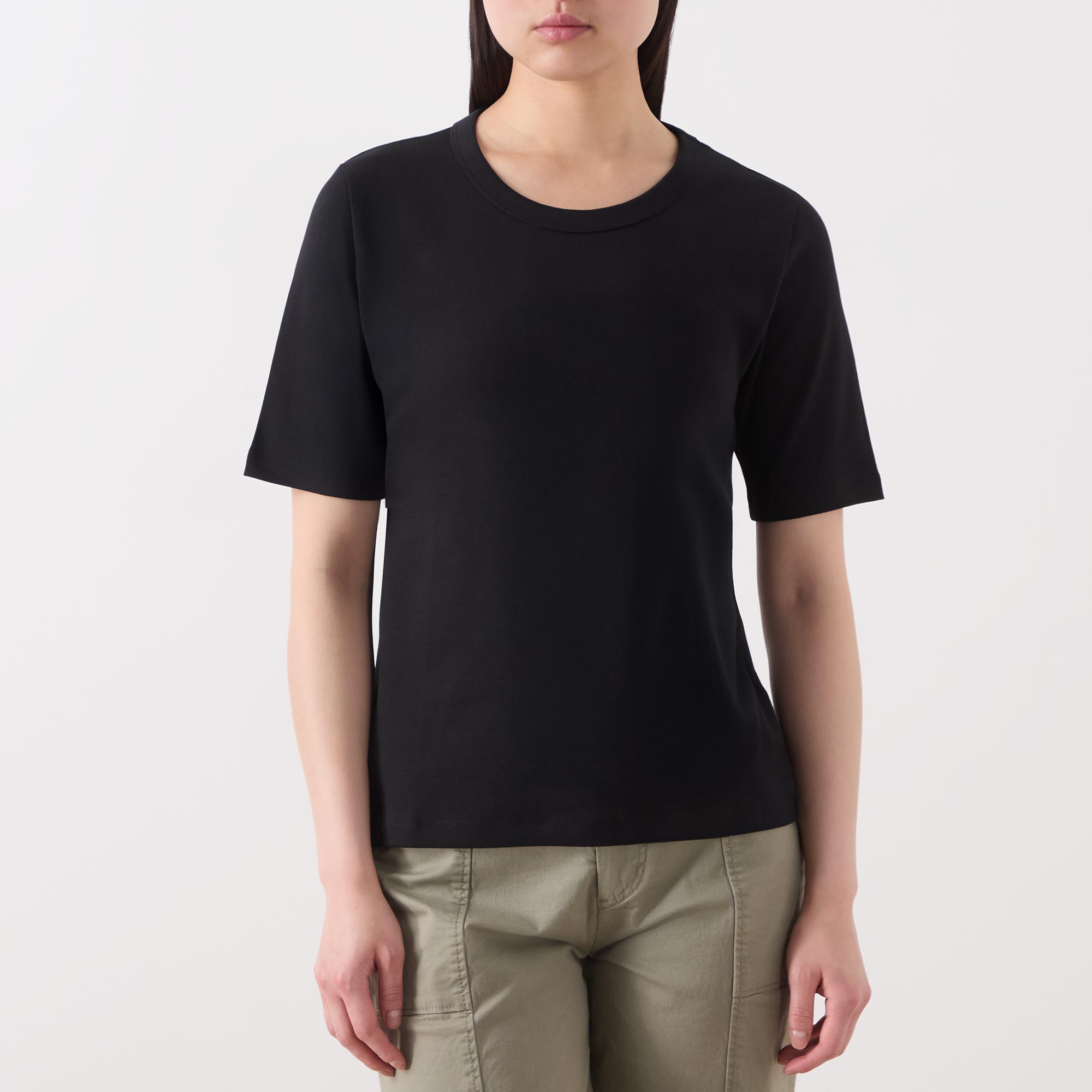 - Round neckline, short sleeves, tonal stitching, straight hemline, smooth fabric
