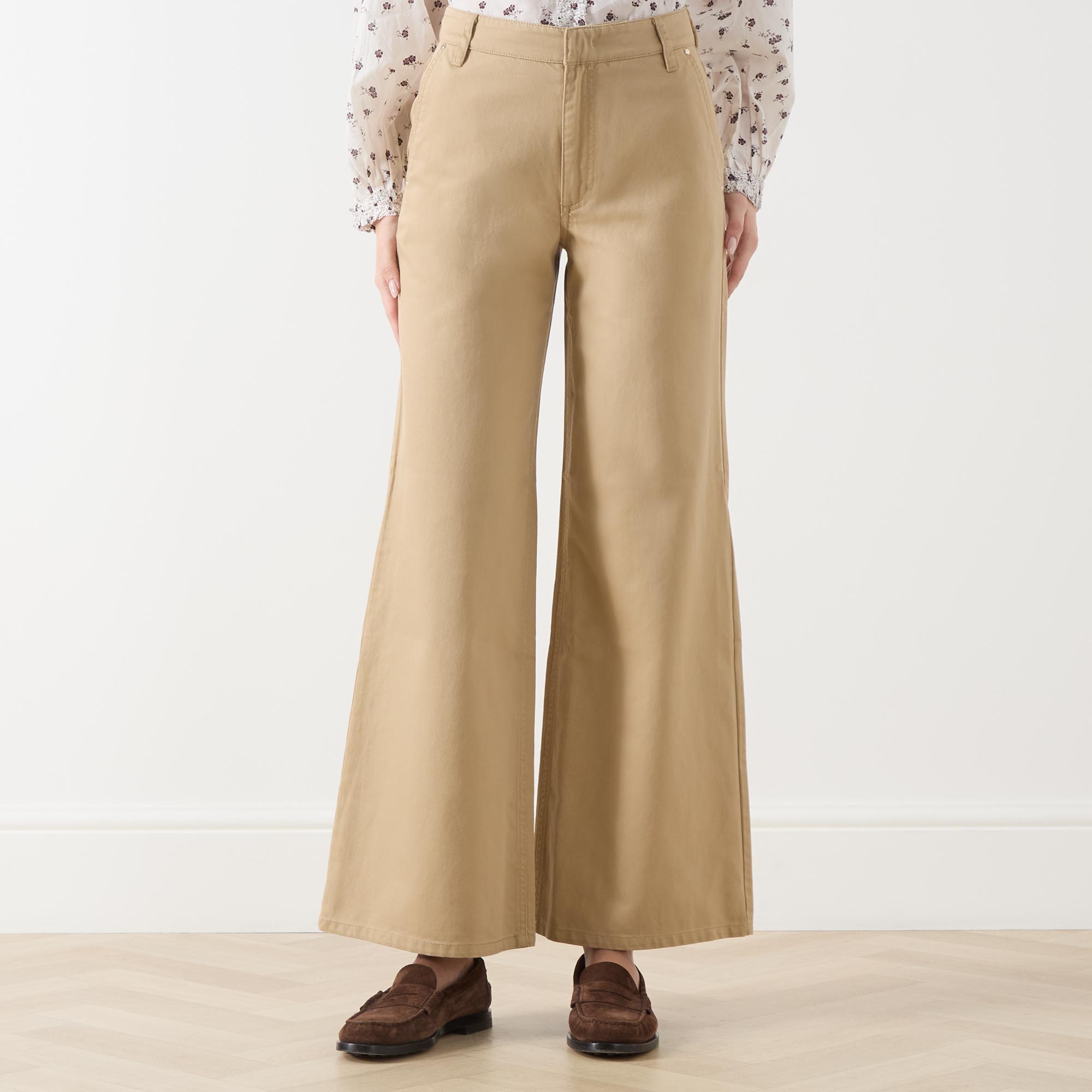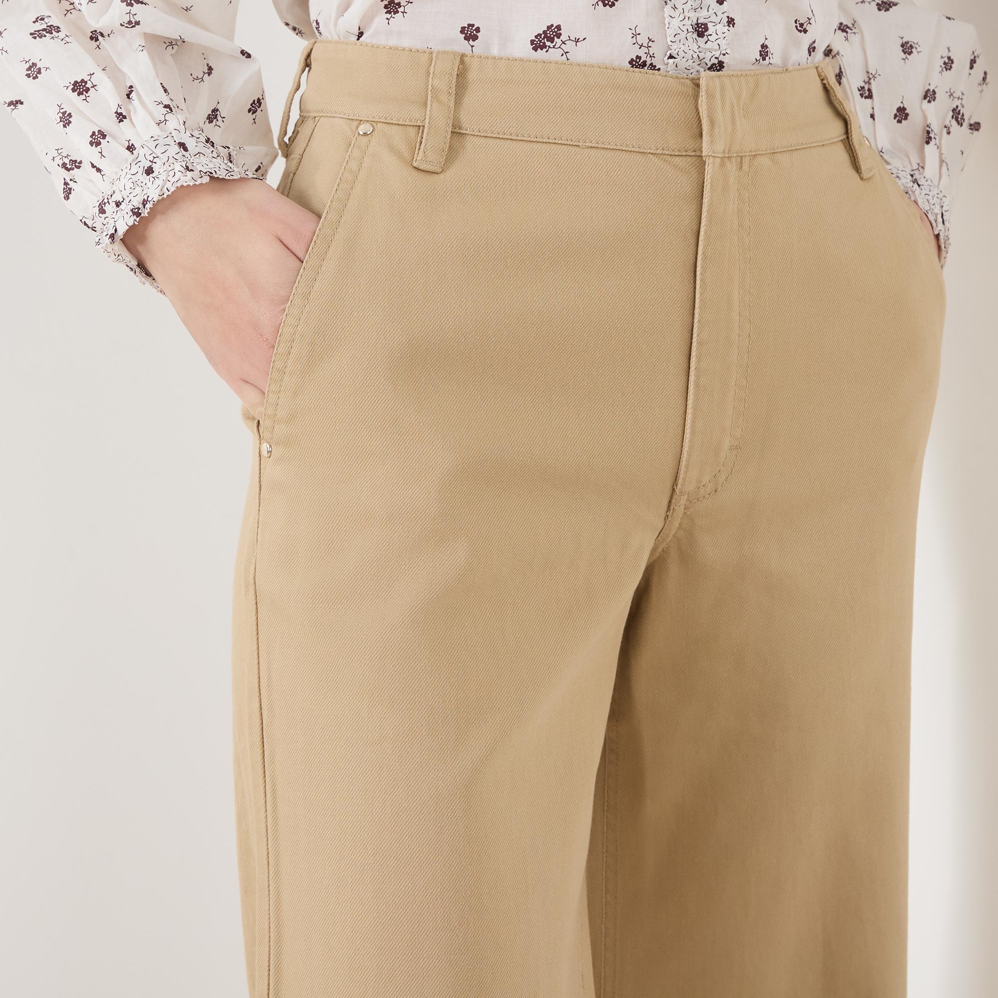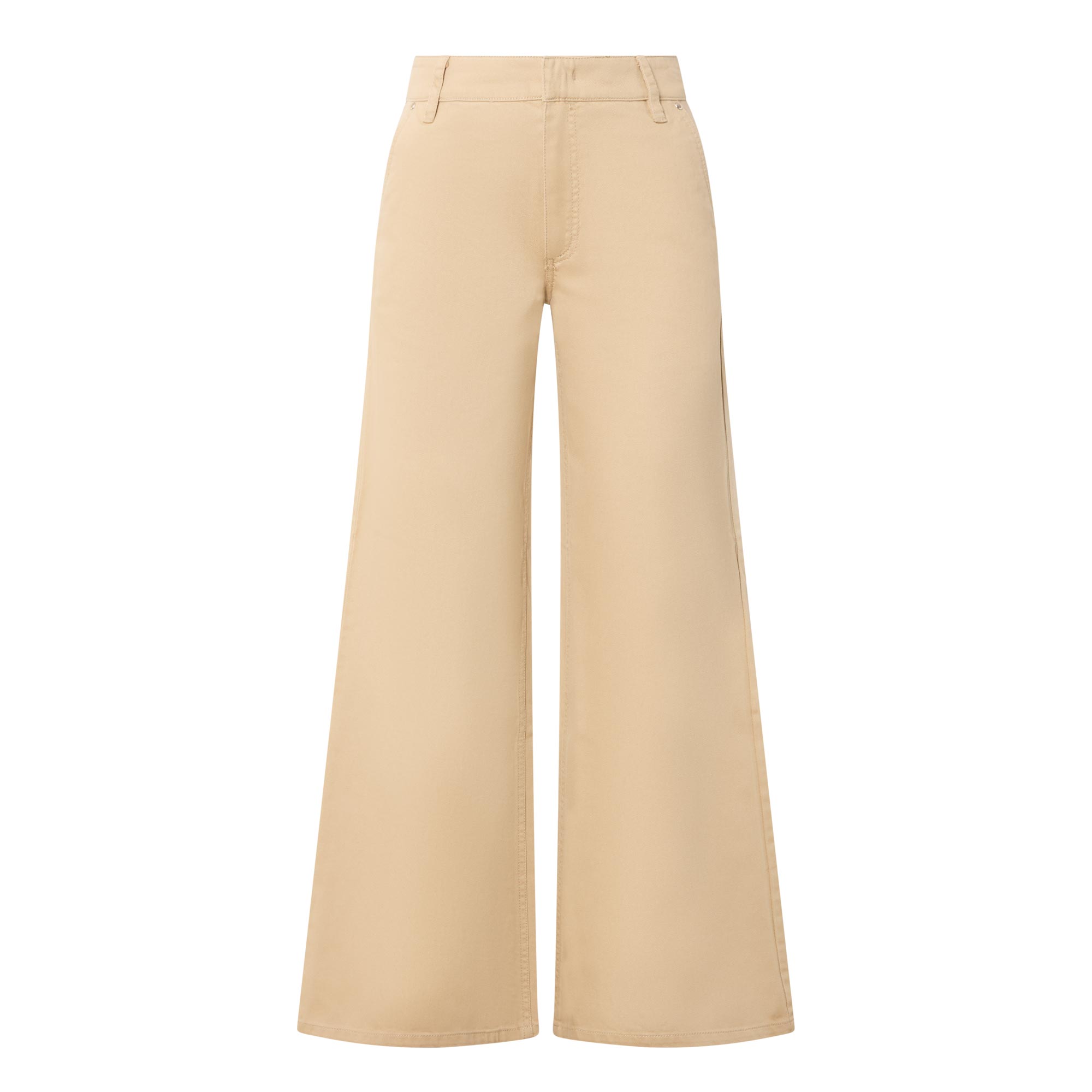 - High-rise, wide leg, concealed fastening, belt loops, side pockets, back pockets