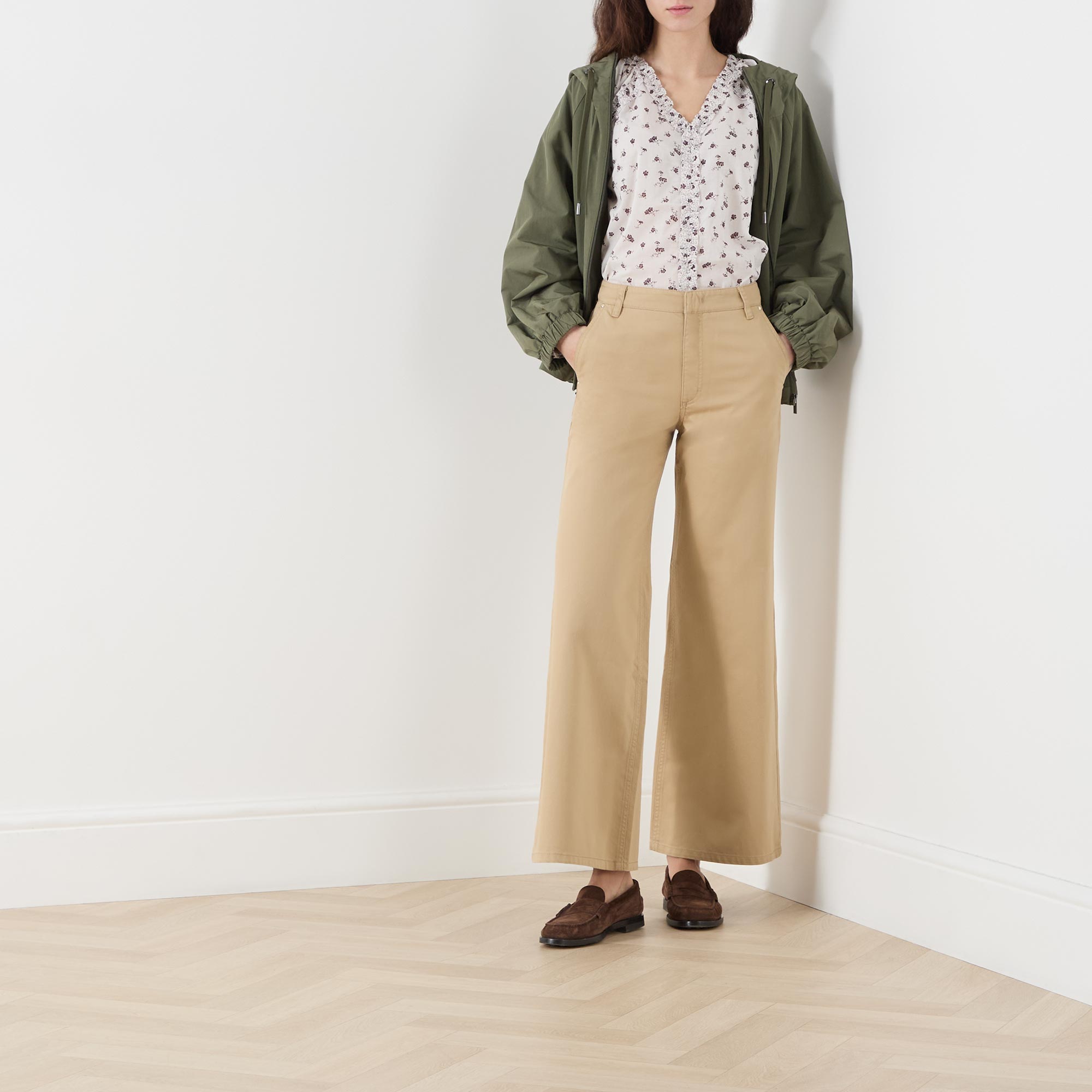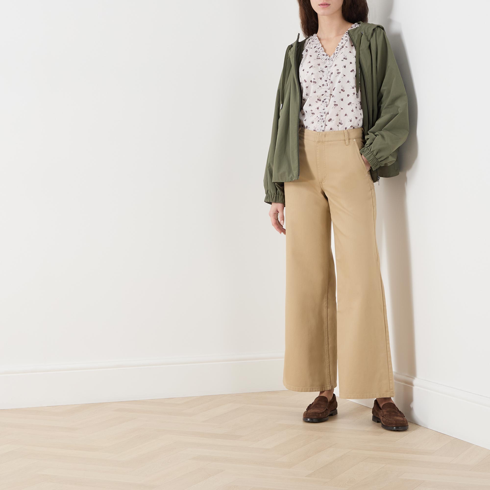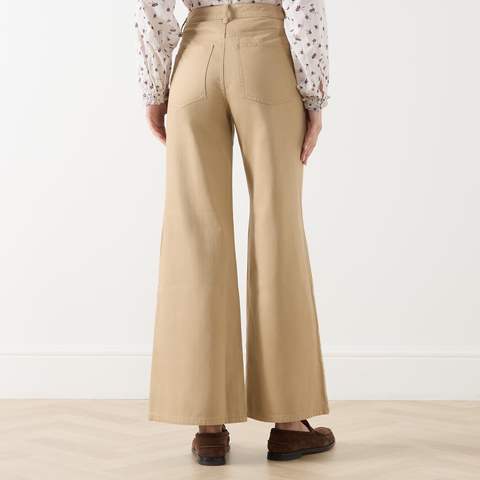 - High-rise, wide leg, concealed fastening, belt loops, side pockets, back pockets
