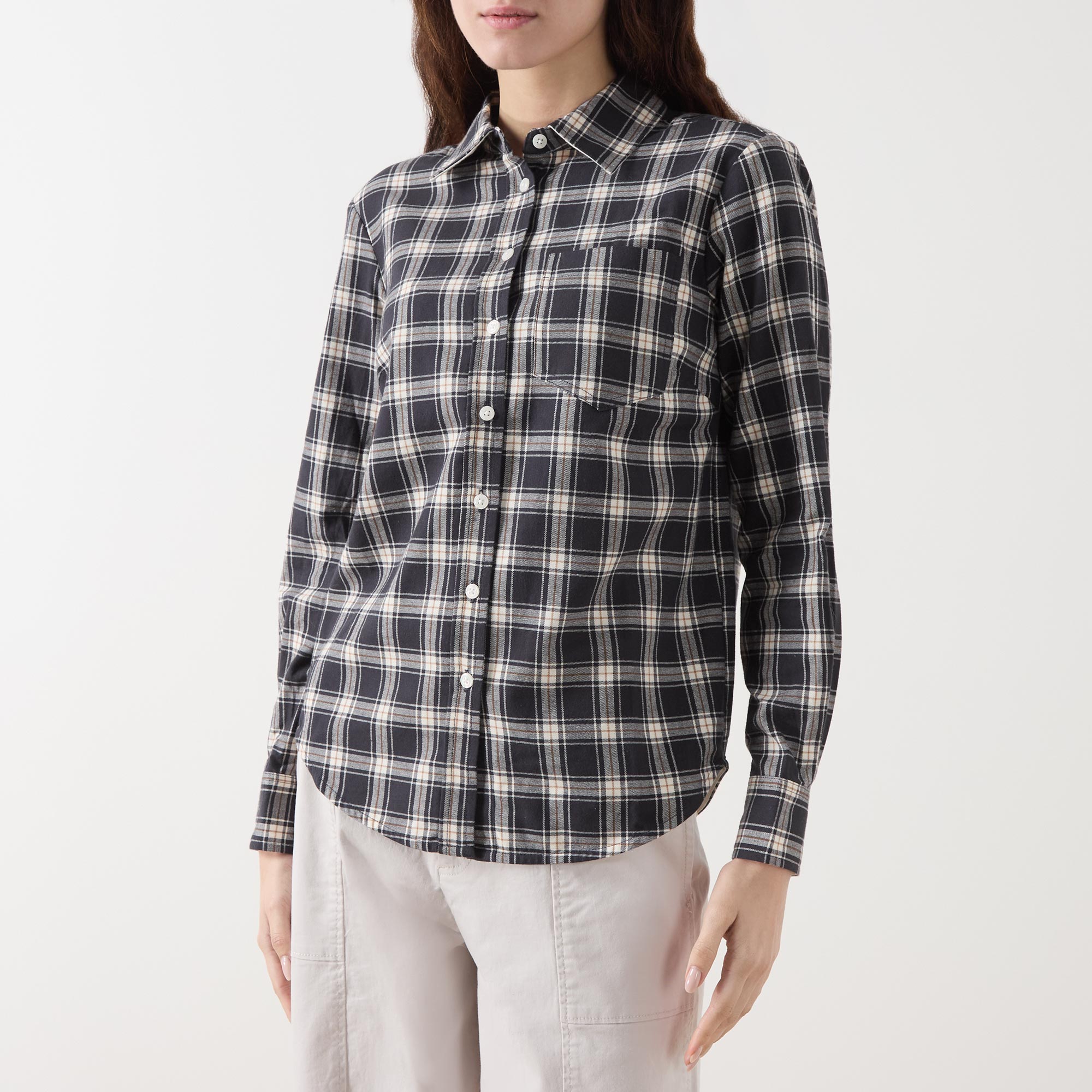 - Pointed collar, long sleeves, curved hemline, check pattern, chest pocket