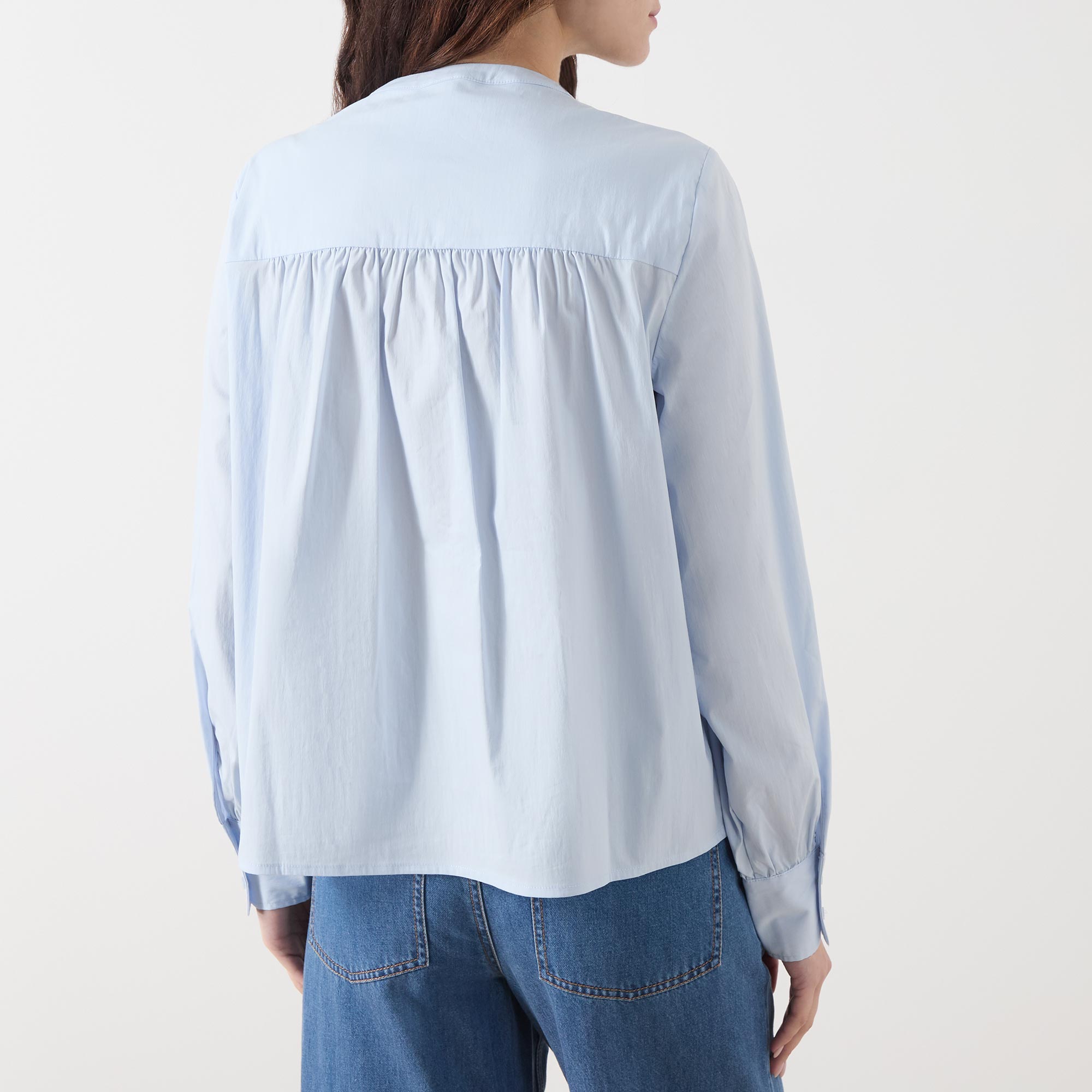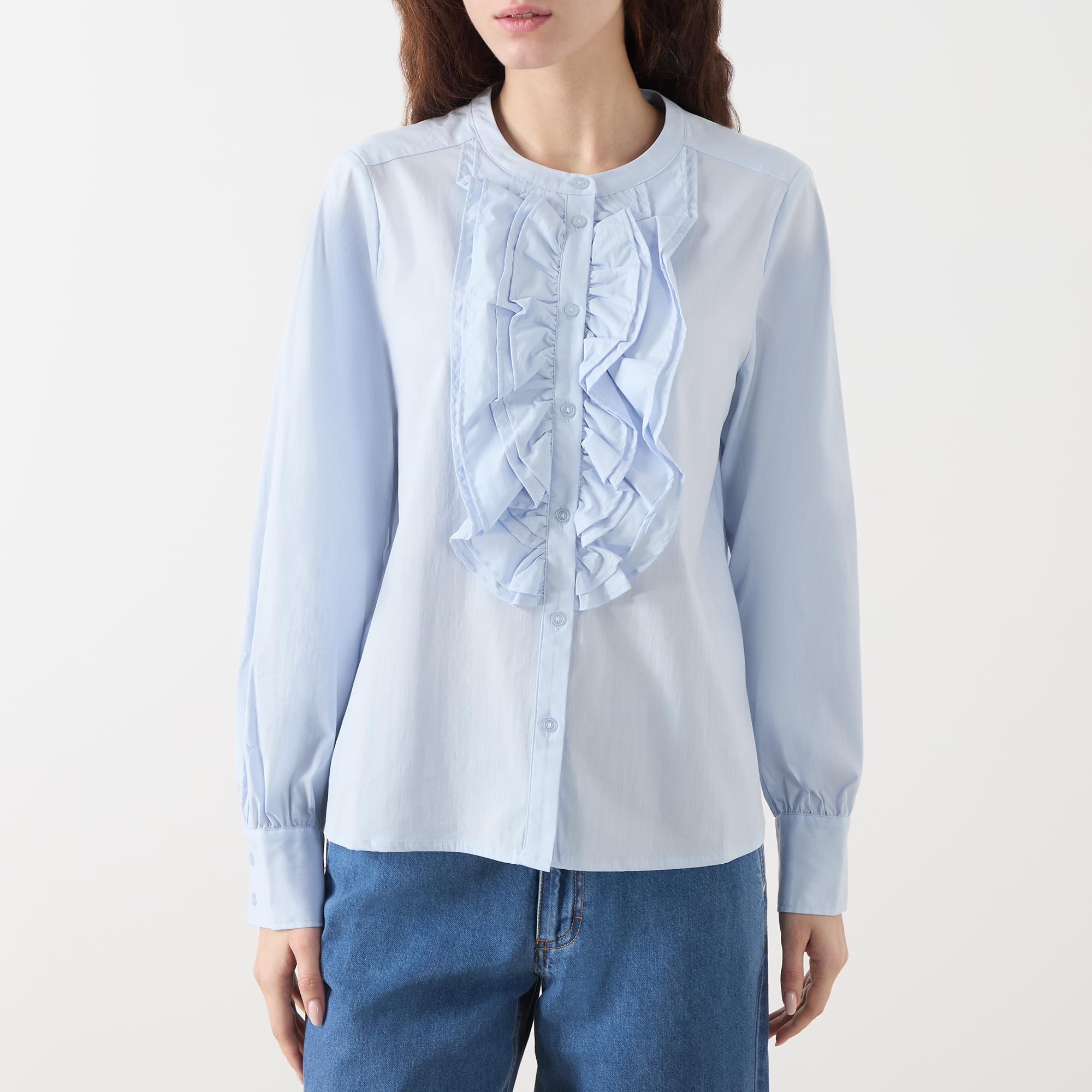- Round neck, long sleeves, button fastenings, ruffle detail, straight hemline