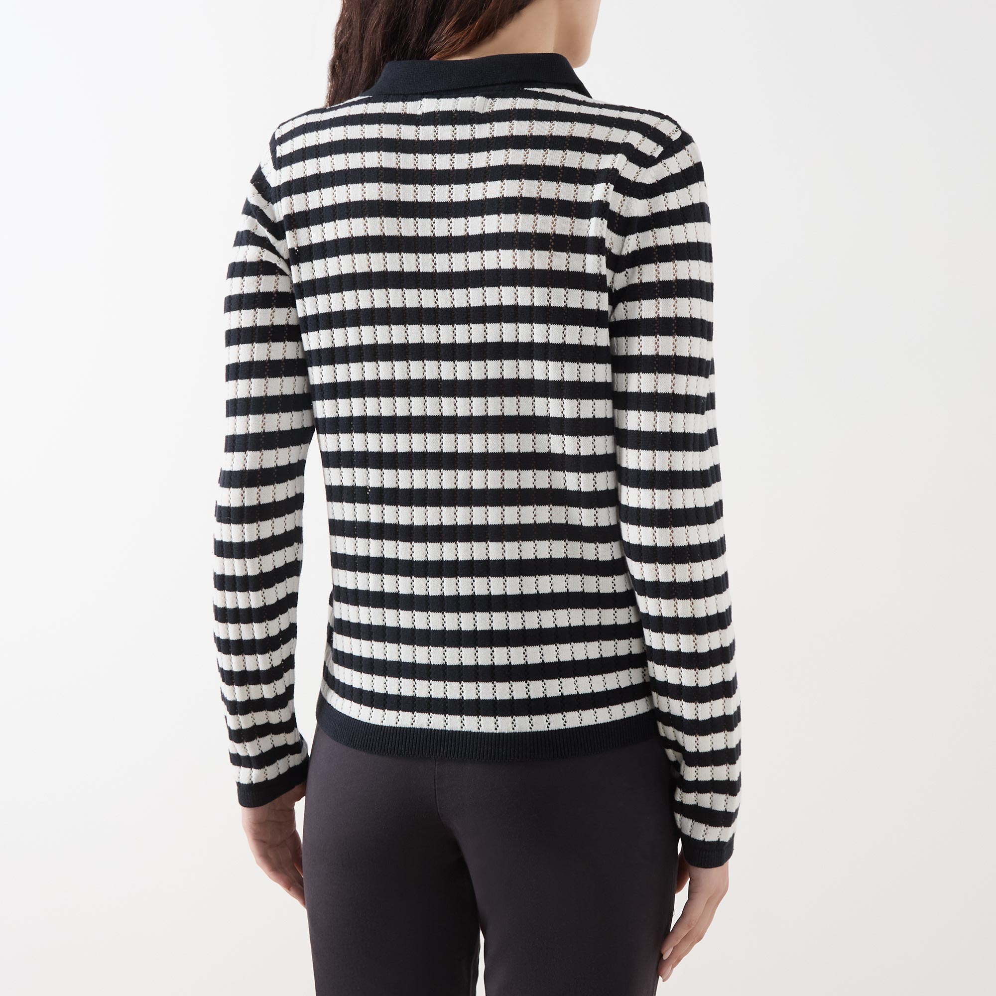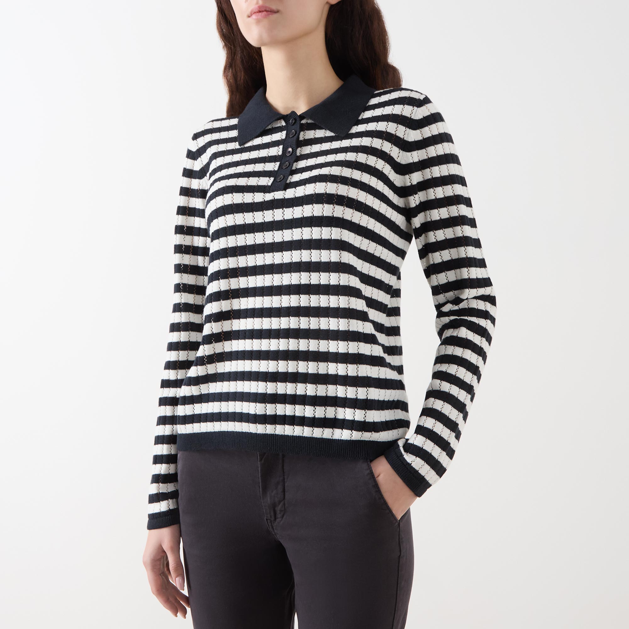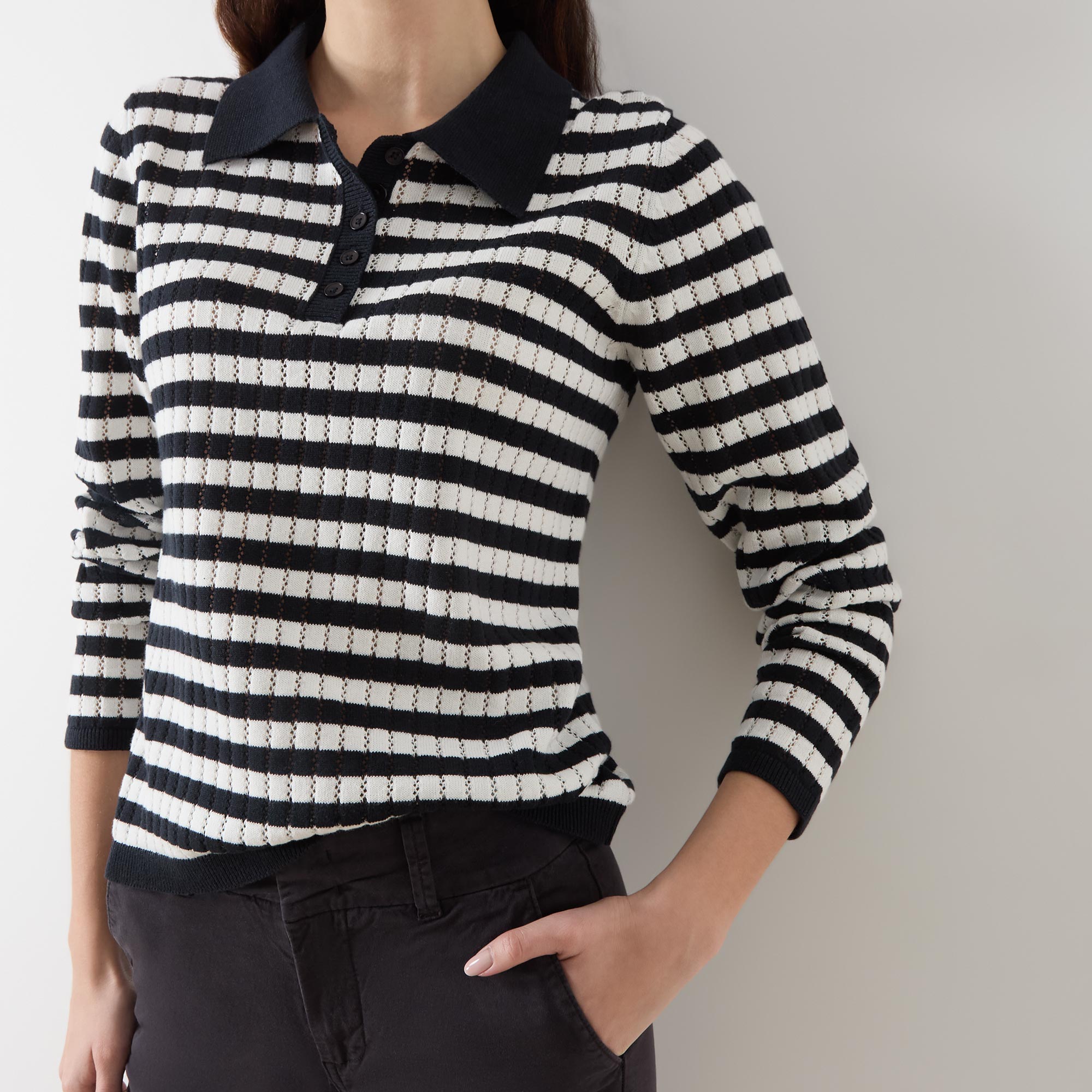 - Open knit stripes, long sleeves, polo collar, button fastenings, straight hemline