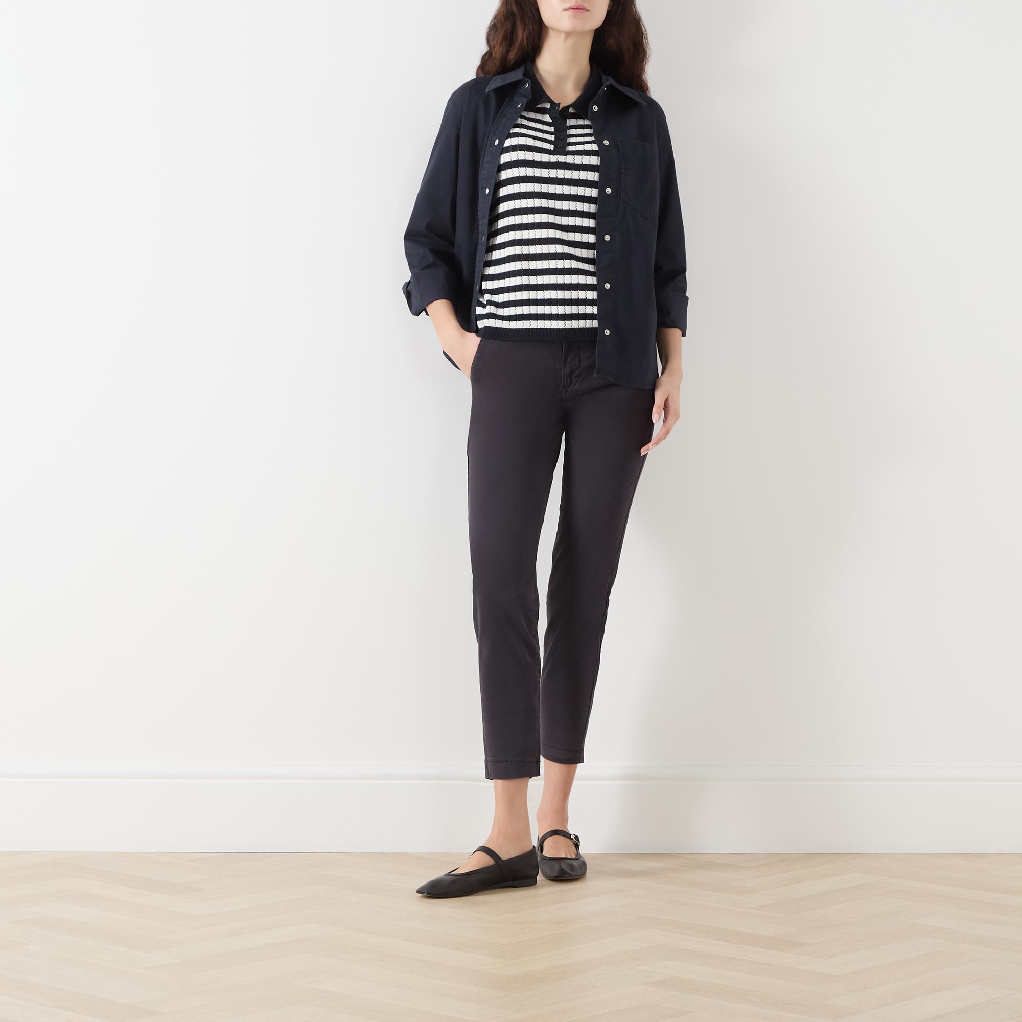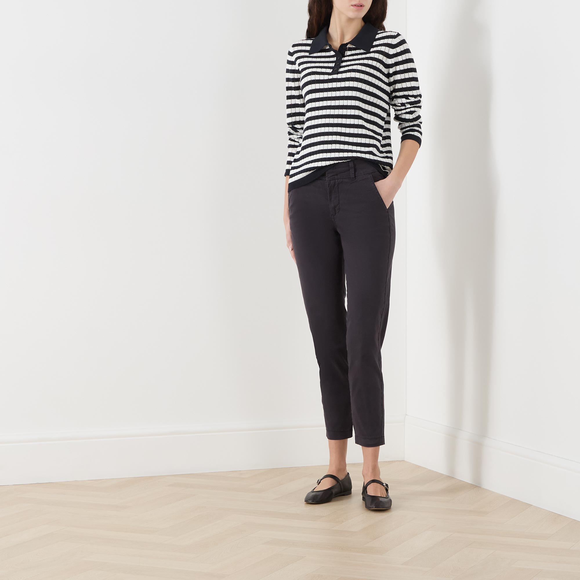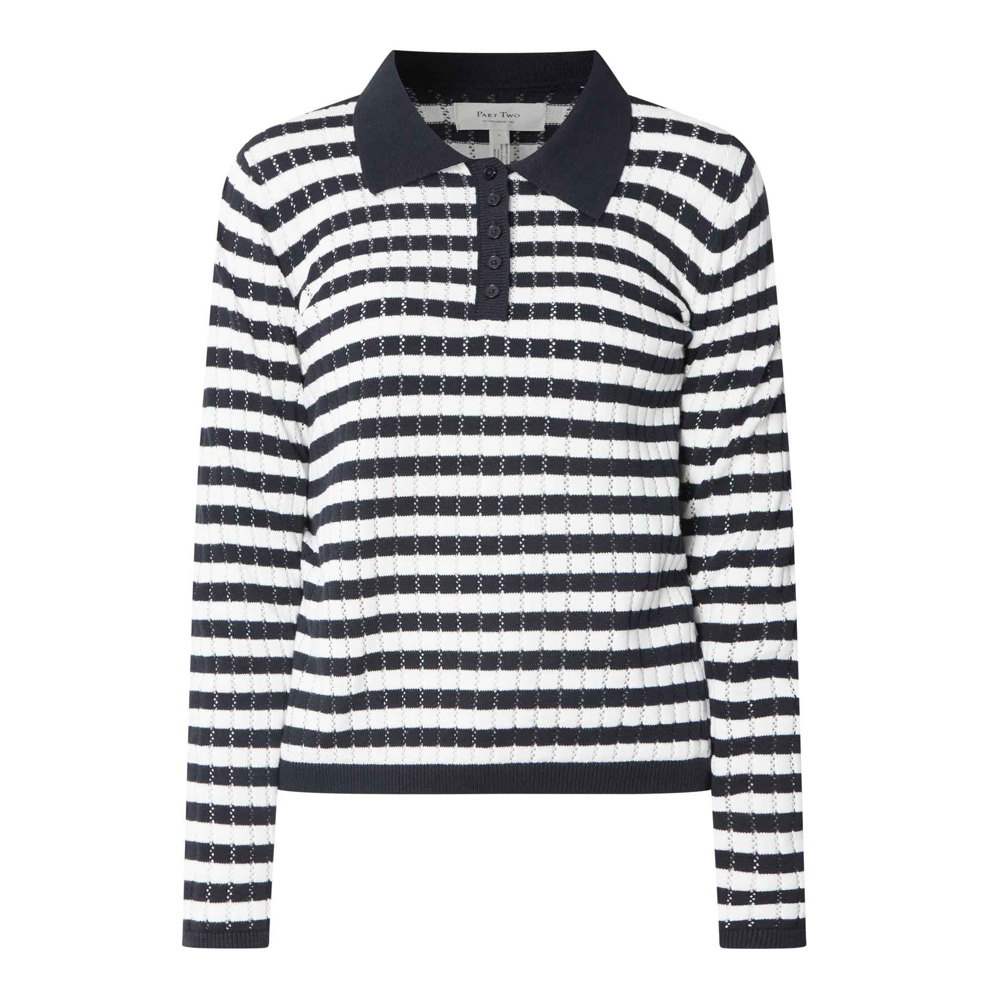 - Open knit stripes, long sleeves, polo collar, button fastenings, straight hemline