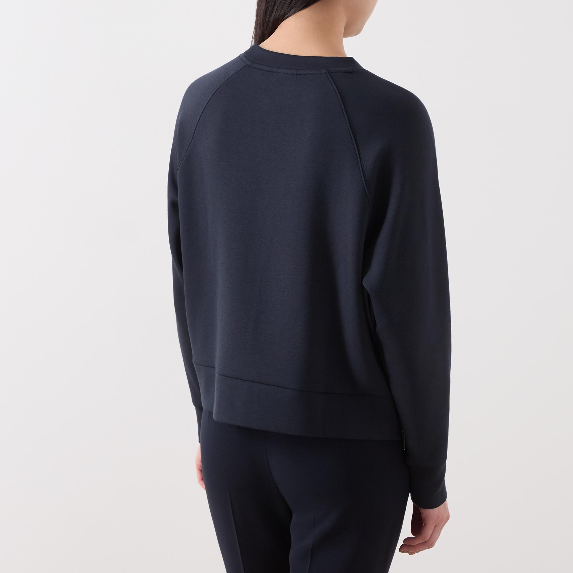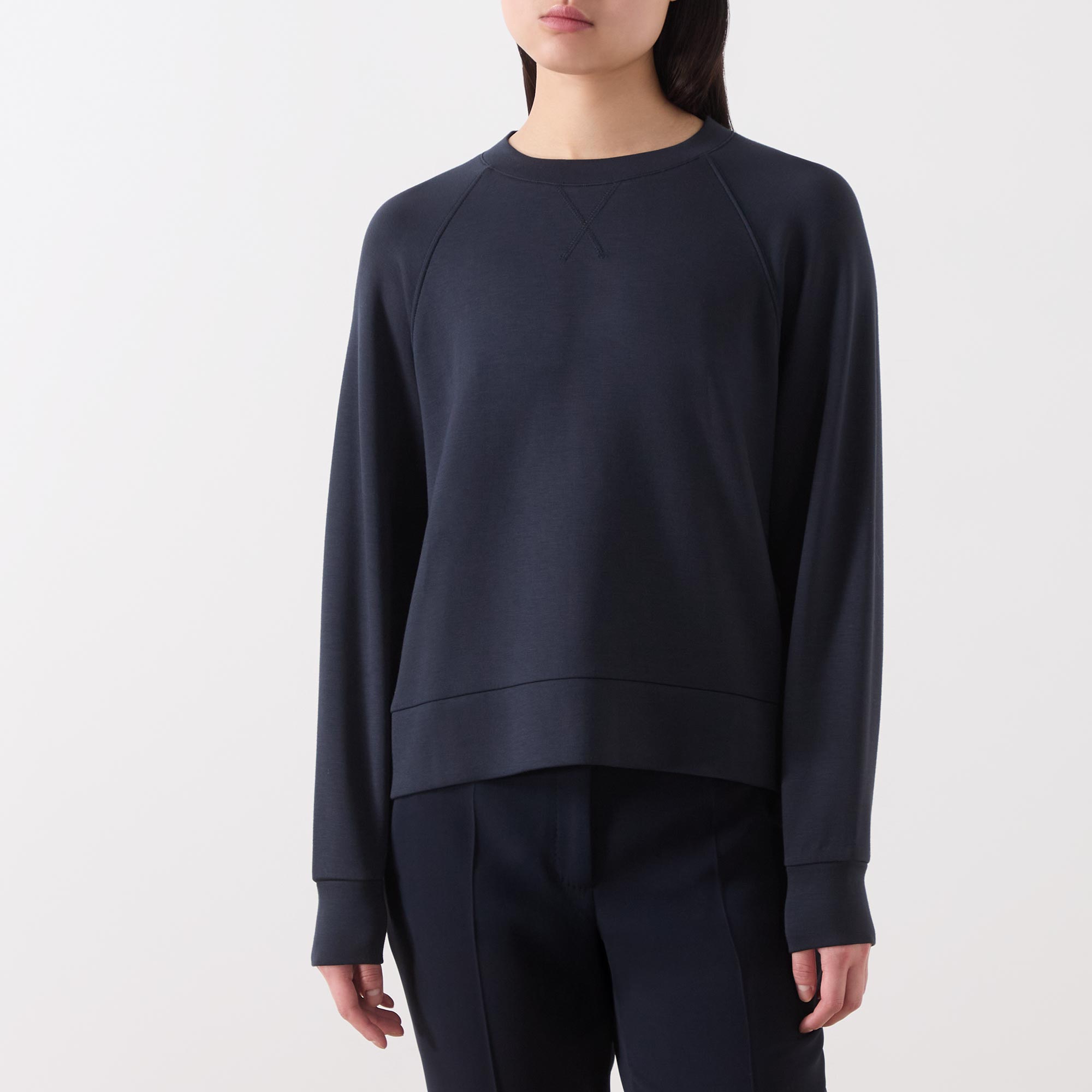 - Crew neckline, long sleeves, V-stitch detail, inverted seams, stretch cuffs, pullover style, smooth fabric