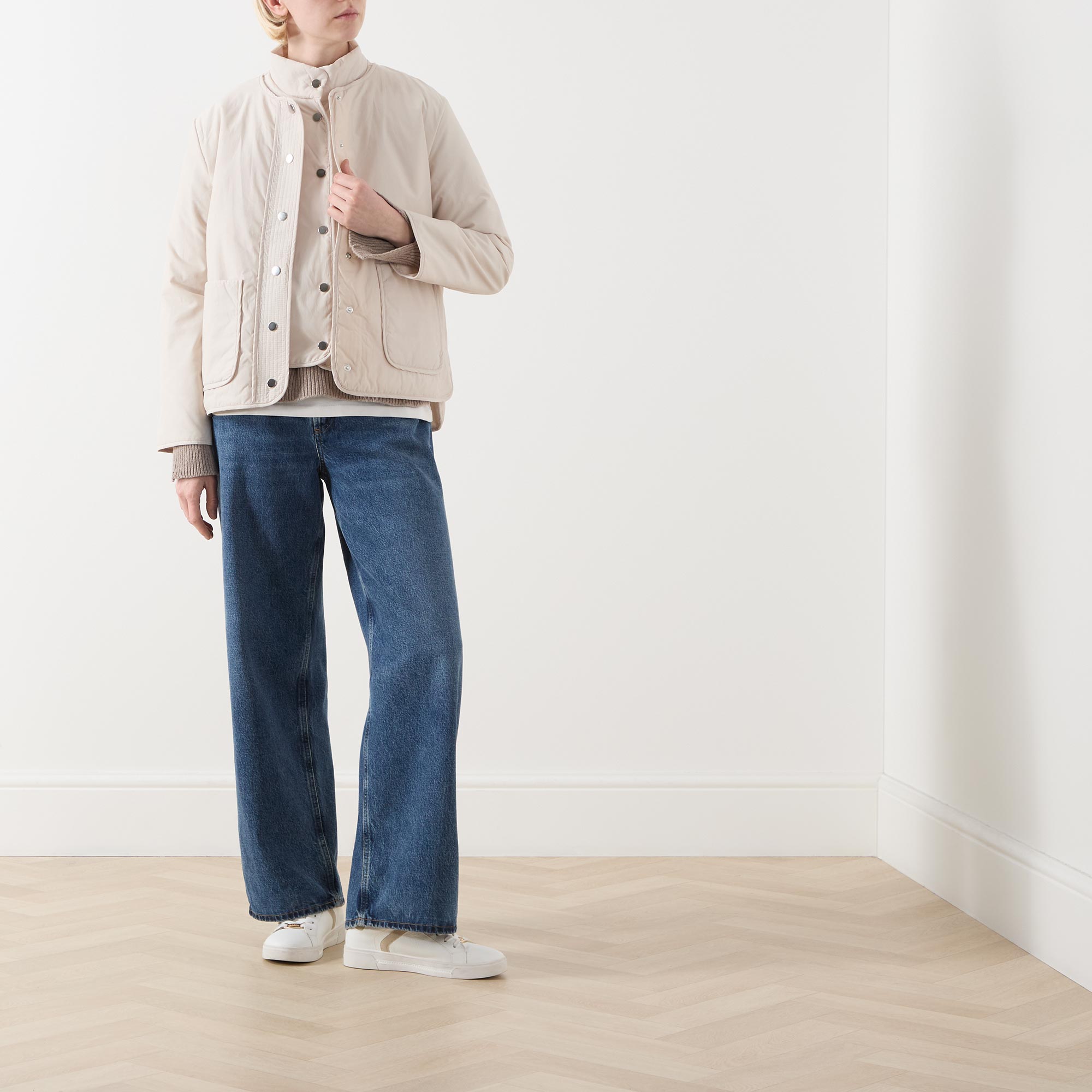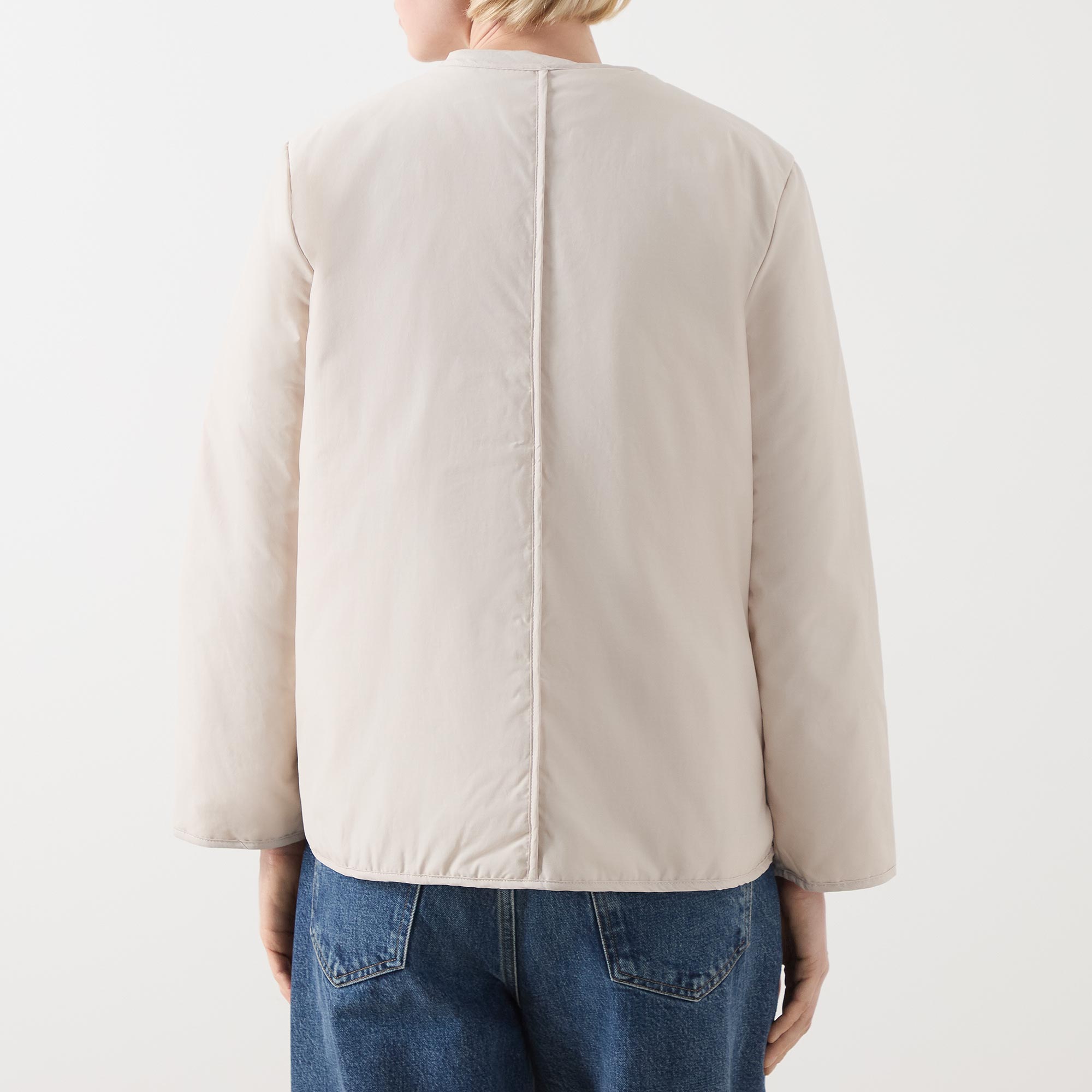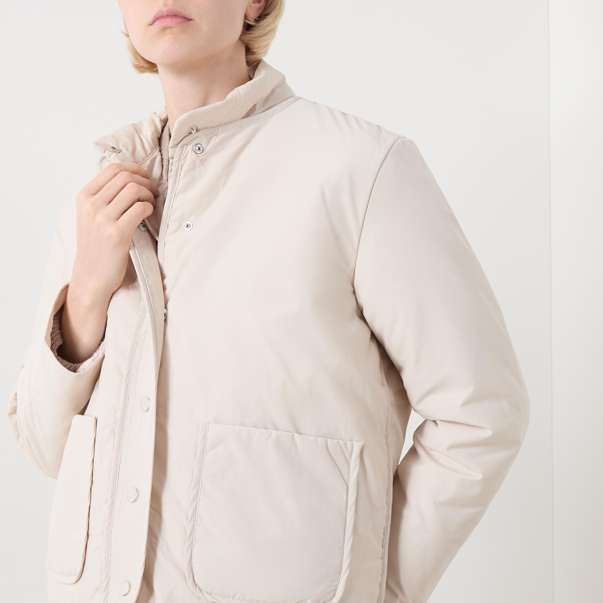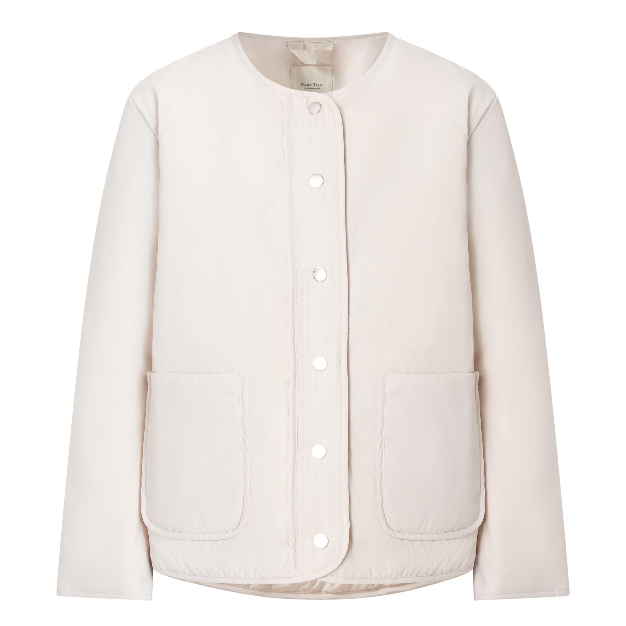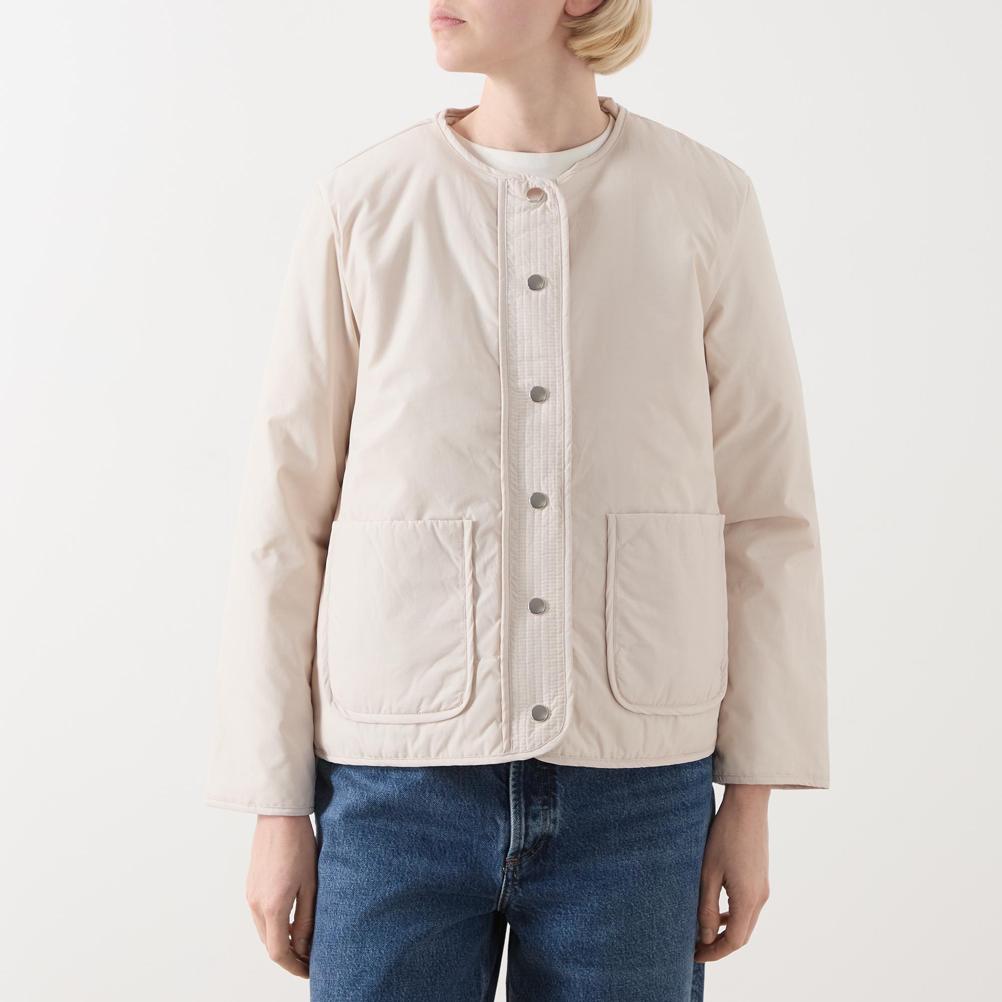 - Round neckline, dropped shoulders, long sleeves, front snap button fastening, two front patch pockets, straight hem, bound trims, exposed seam detailing, smooth finish