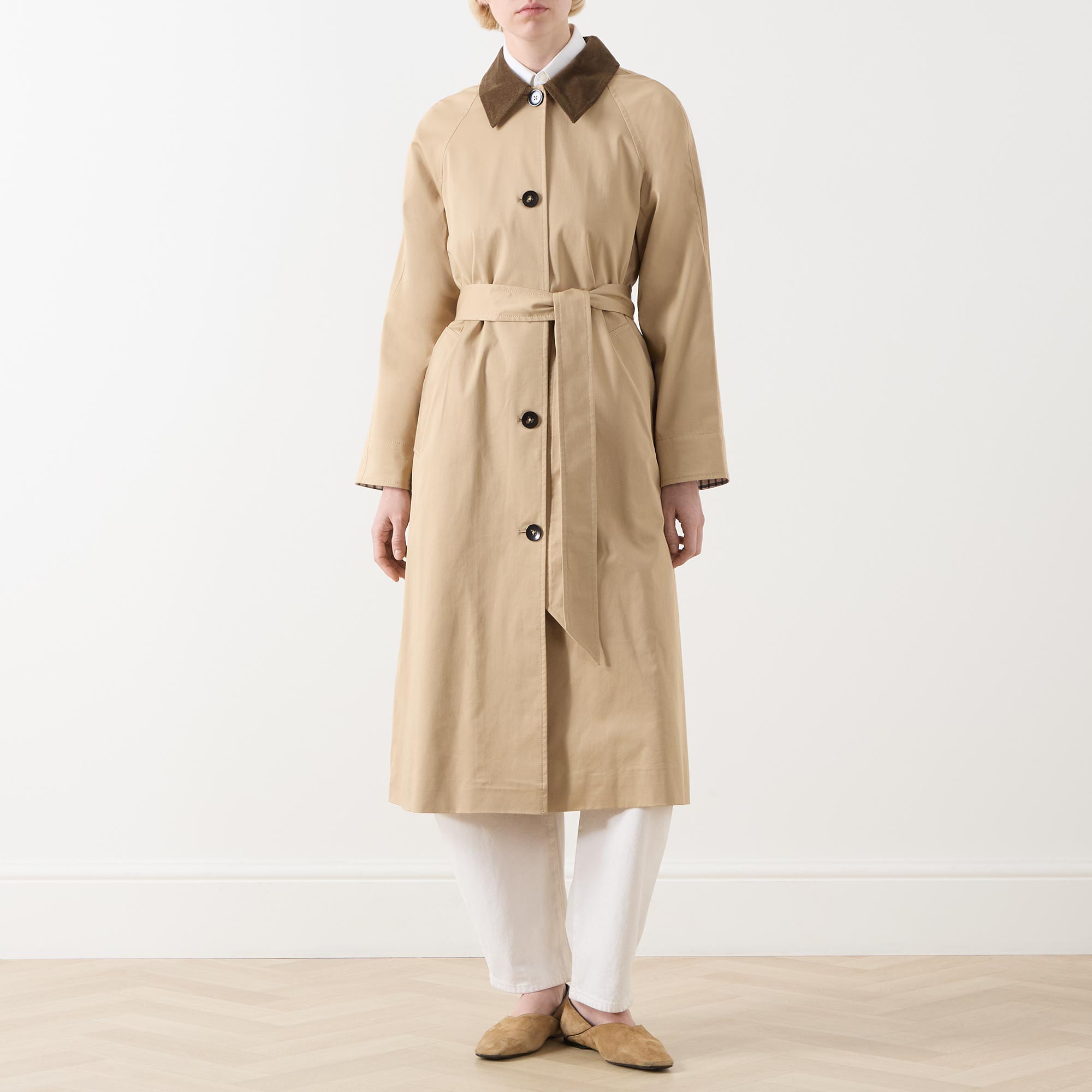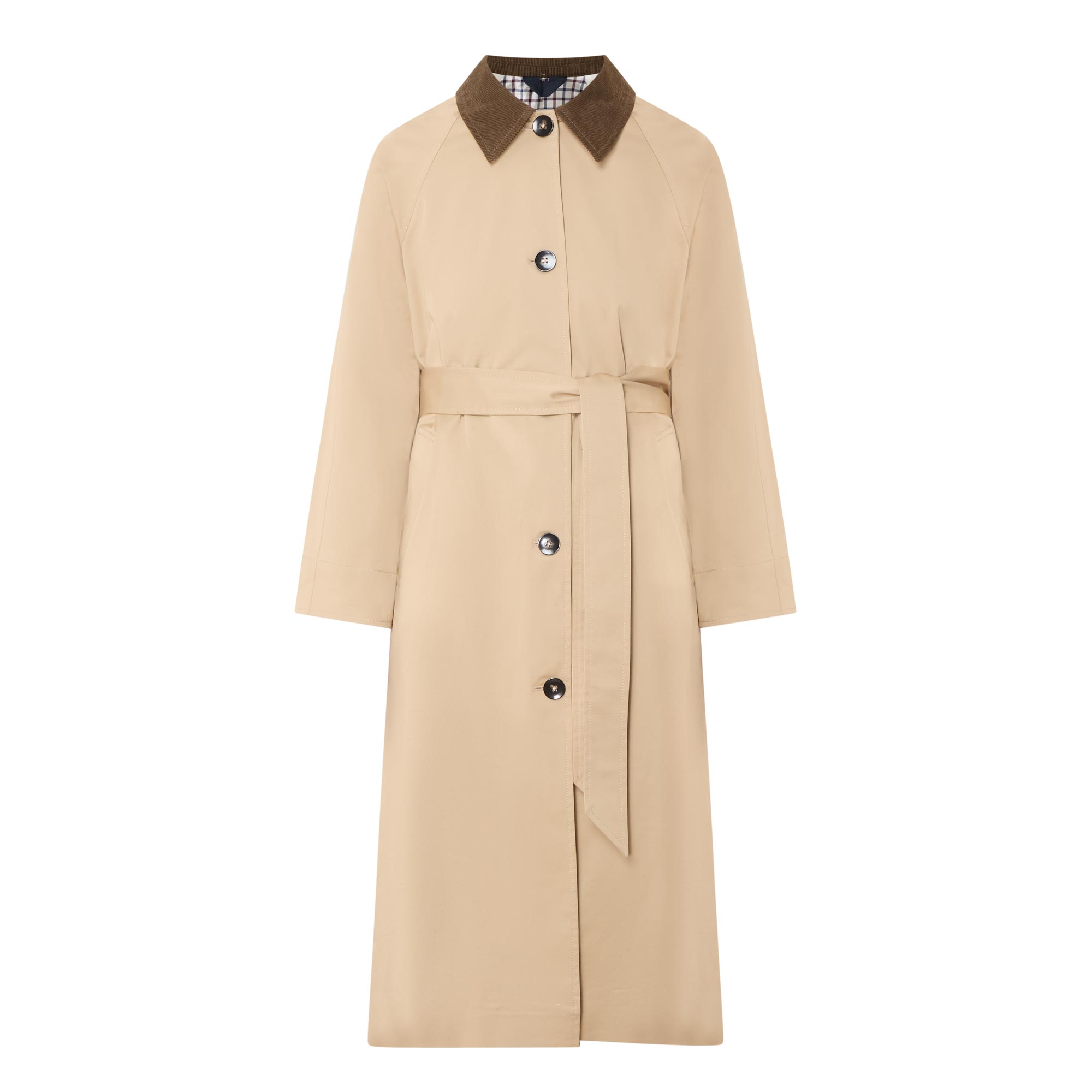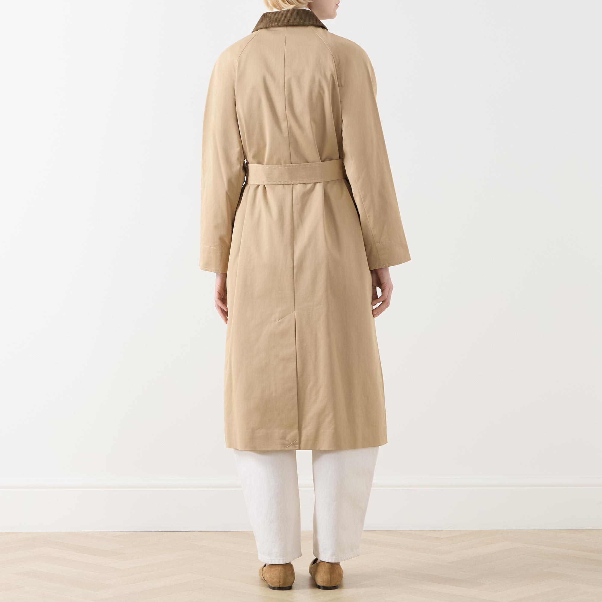 - Contrasting corduroy point collar, long sleeves, front button fastening, matching self tie waist belt, two angled welt pockets, straight hem, rear vent, longline design, smooth finish