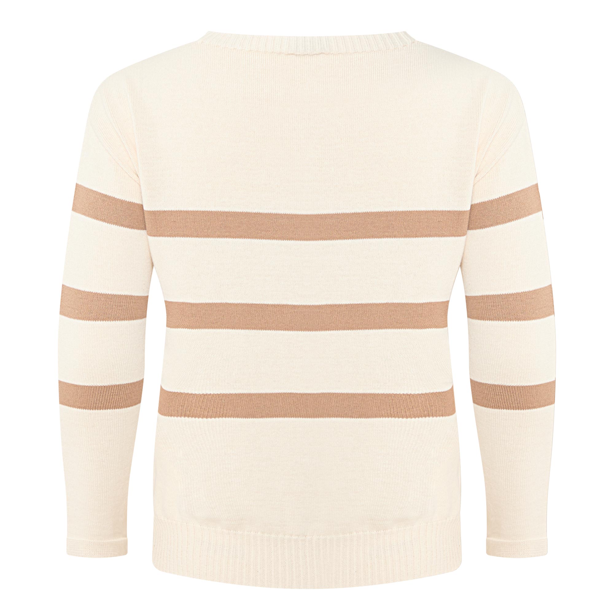 - Crew neckline, long sleeves, dropped shoulders, striped pattern, ribbed trims, pullover style, knitted finish