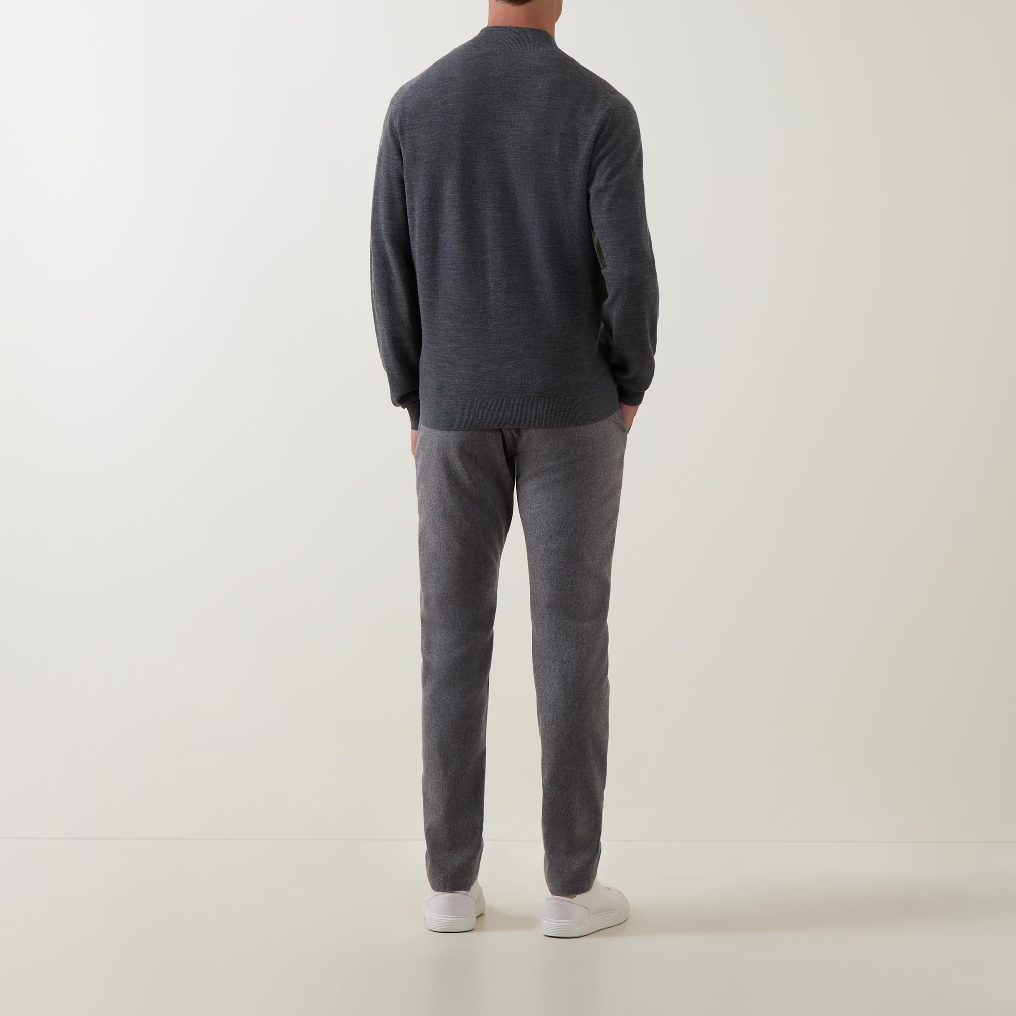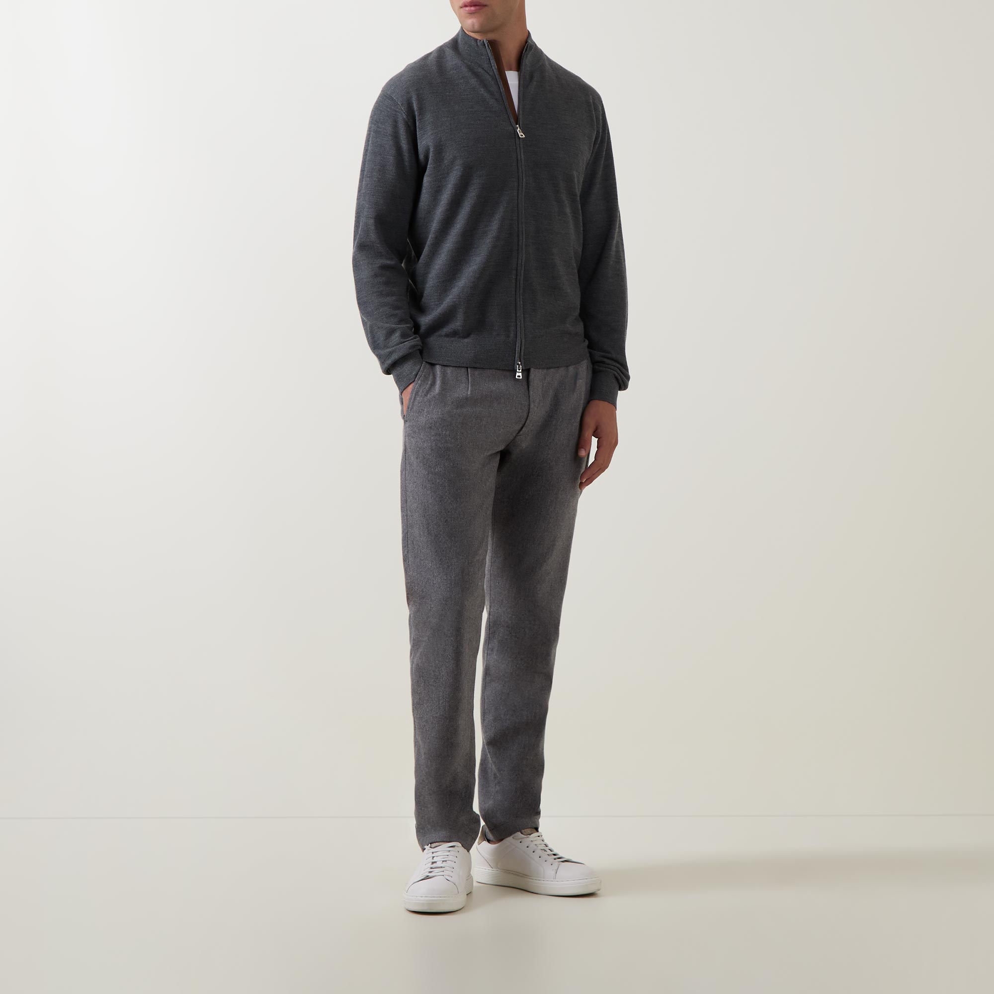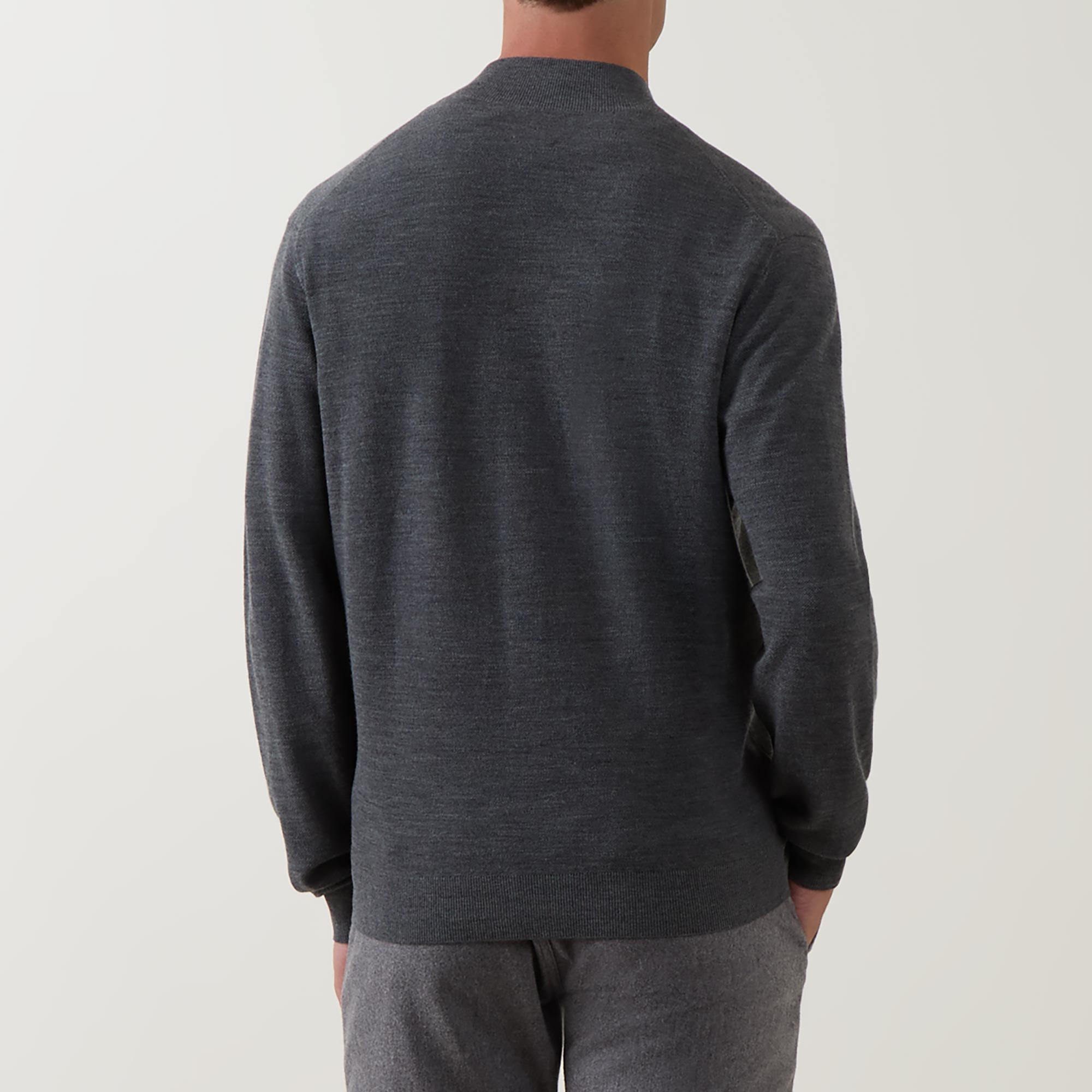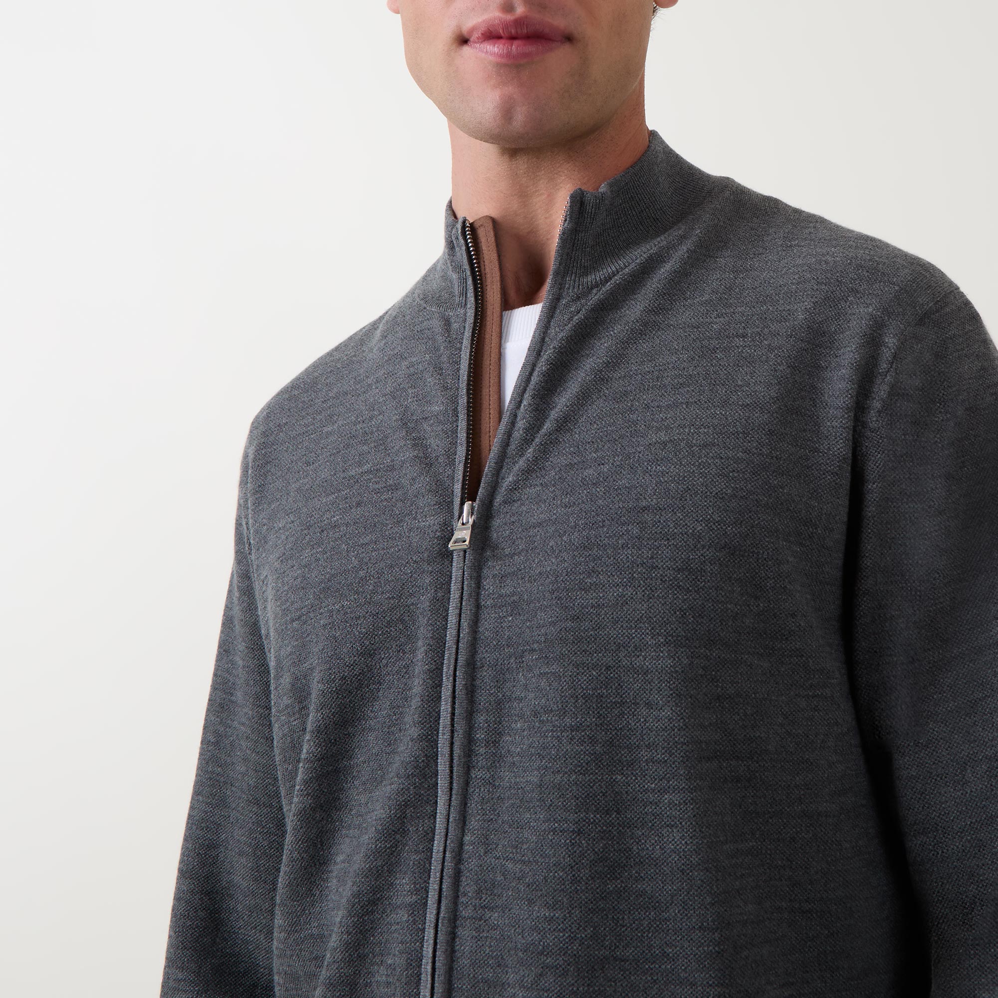 - Mock neck, long sleeves, two-way front zip fastening, straight hem, ribbed trims, silver-tone hardware, knit construction