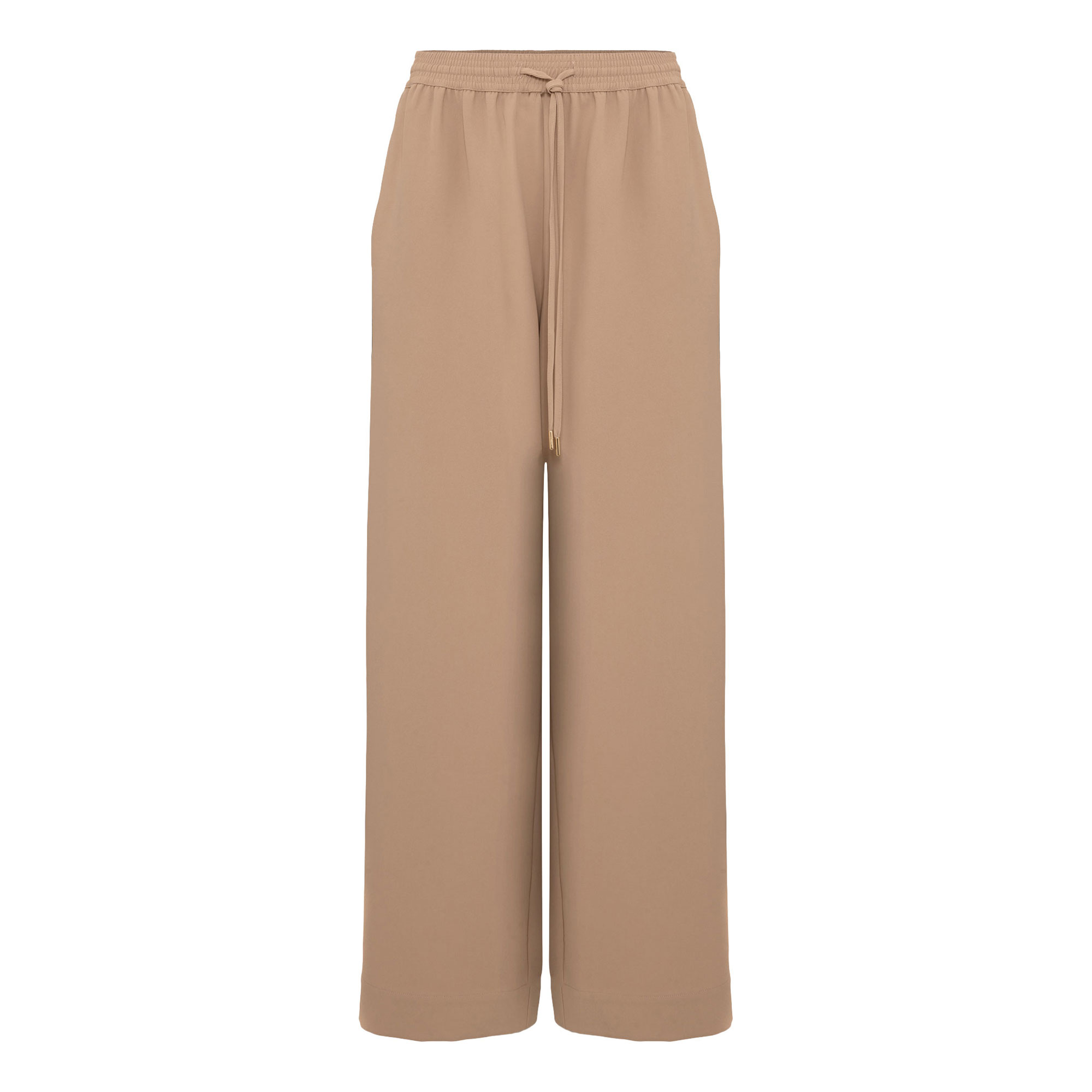- Elasticated drawstring waistband, side stripe detail, wide-cut leg, smooth fabric