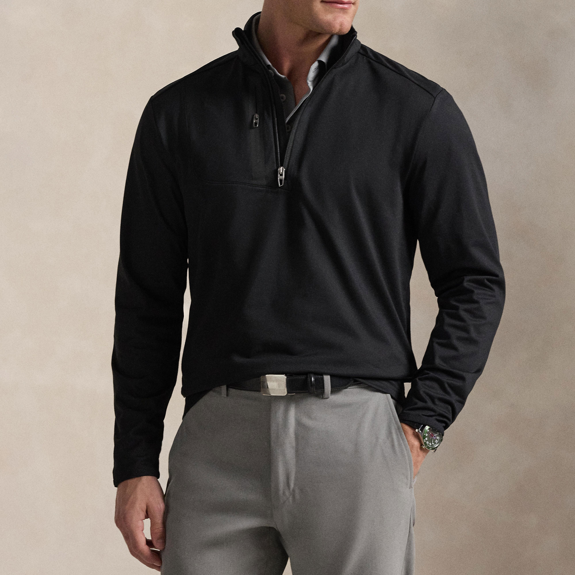 - Mock neckline, quarter-zip placket, top flap to prevent chafing, long sleeves, stretch-fused binding at cuffs, chest zipped pocket, logo label at the nape, pull-on style