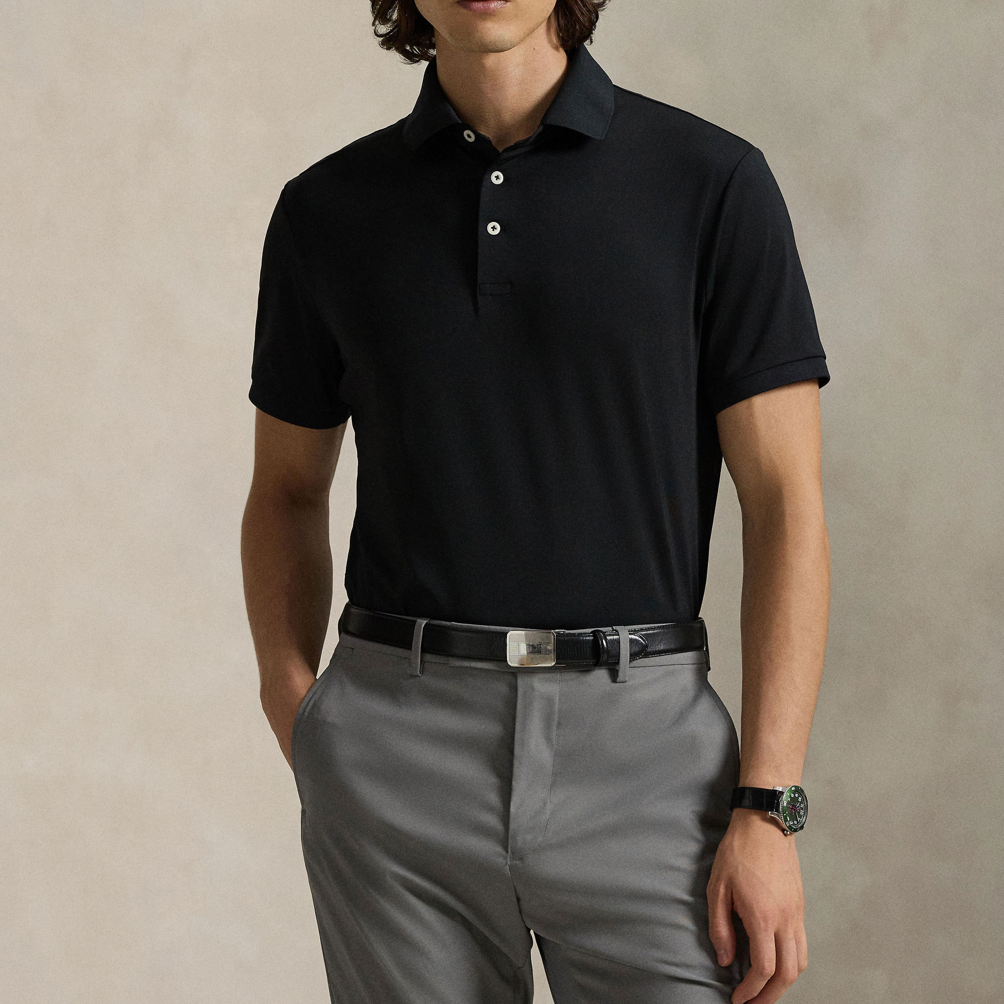 - Ribbed Polo collar, three-button placket, bespoke corozo buttons, short sleeves, ribbed armbands, silicone logo tab at shoulder and nape, even vented hem