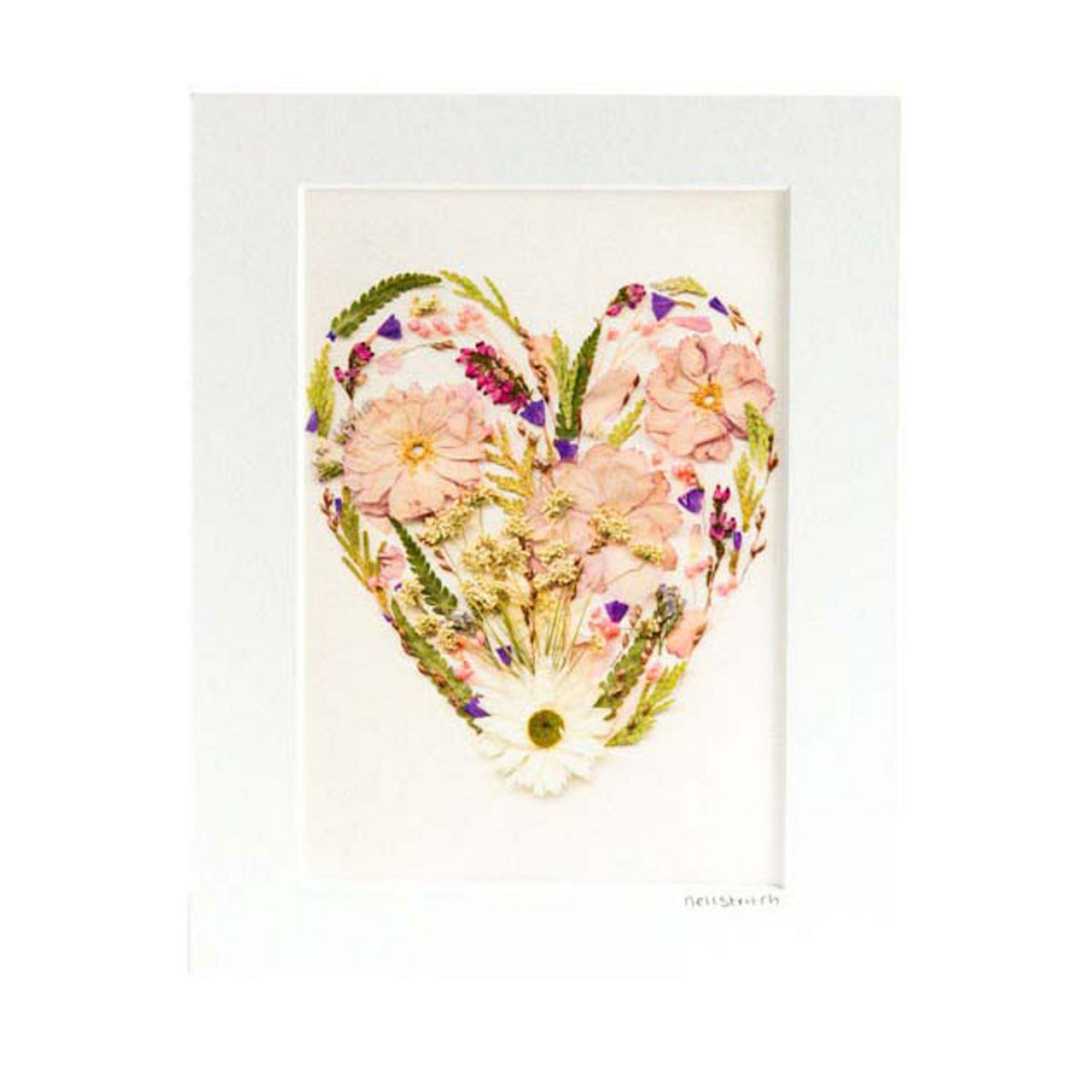 Express your love with this fine art print from Pressed Flowers By Nell. This piece features a heart-shaped design made from pressed cherry blossoms, palm, fern, statice, heather, and more, all grown in Nell's garden. This delicate floral arrangement beautifully captures the tenderness of nature, making it a charming addition to any space.