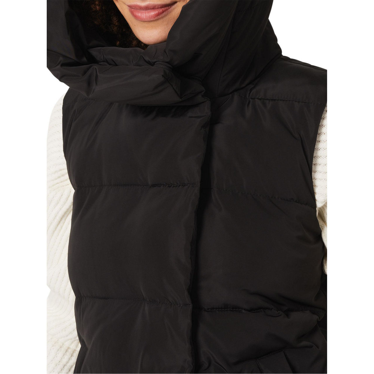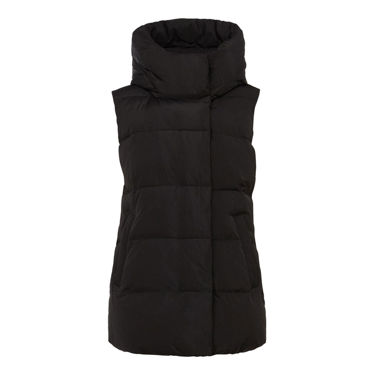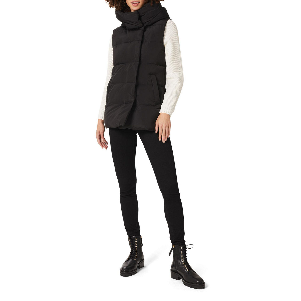 - Stand-up collar, sleeveless, zip-through fastening, padded, hooded.