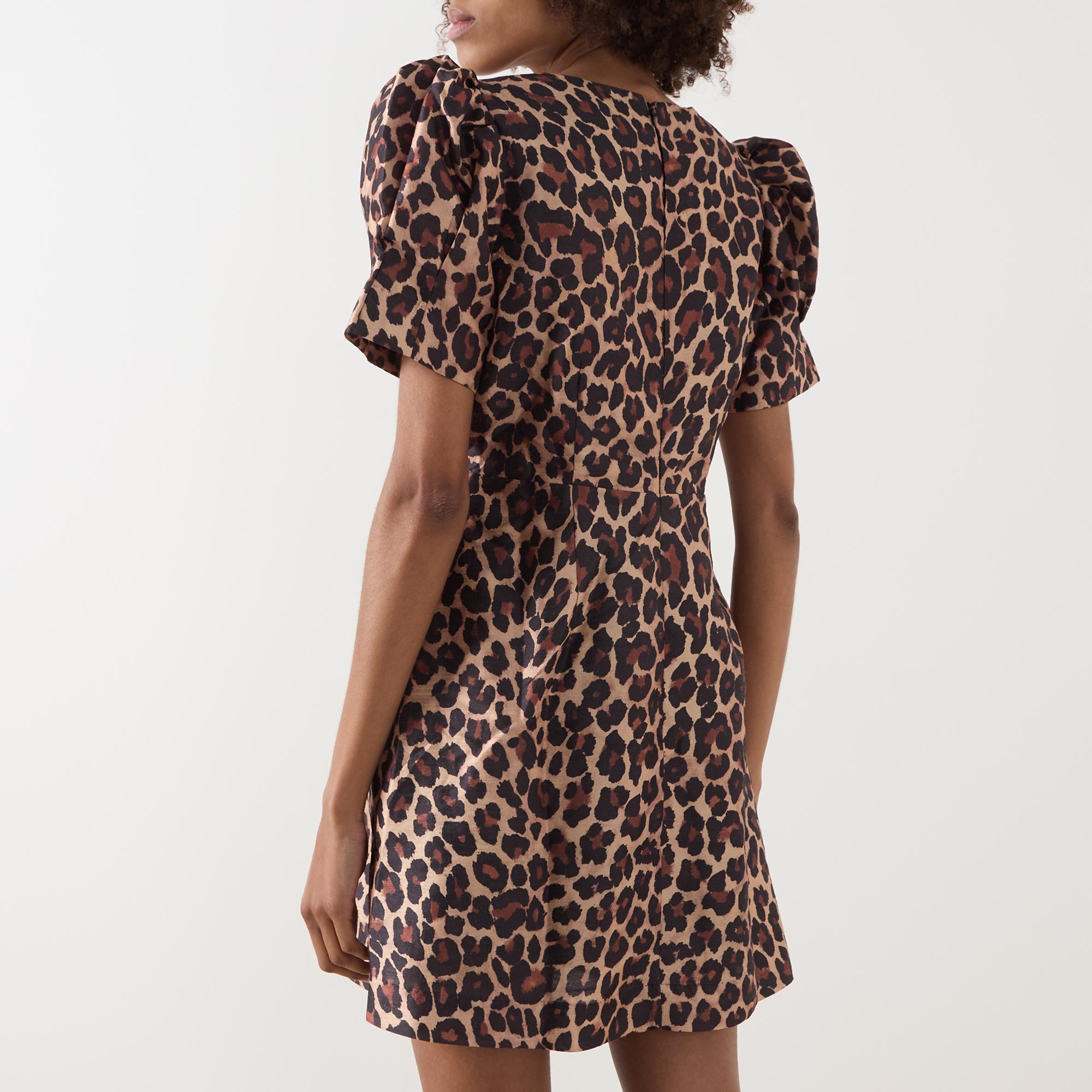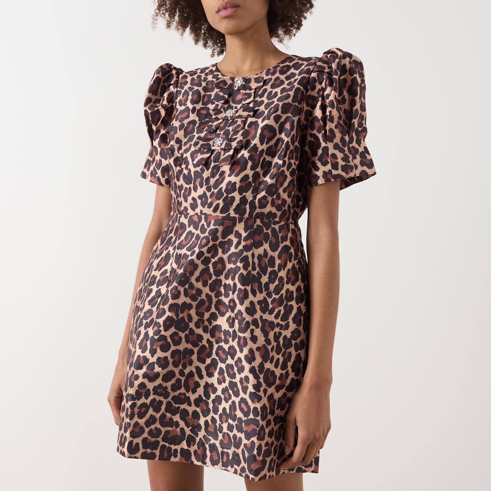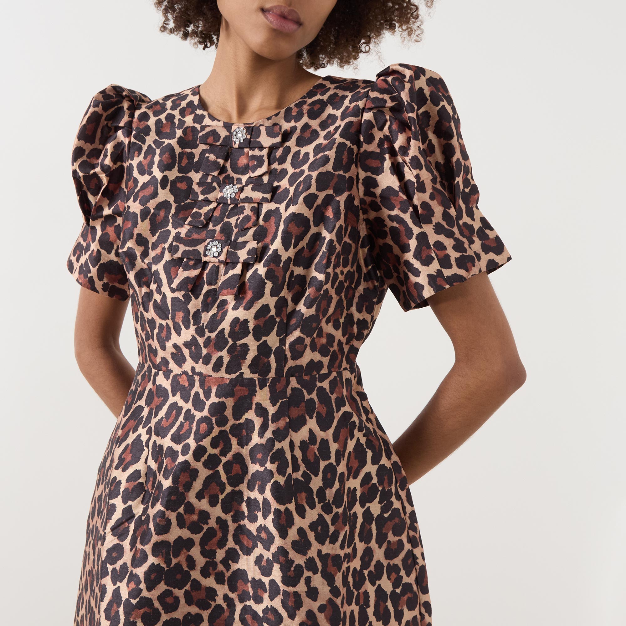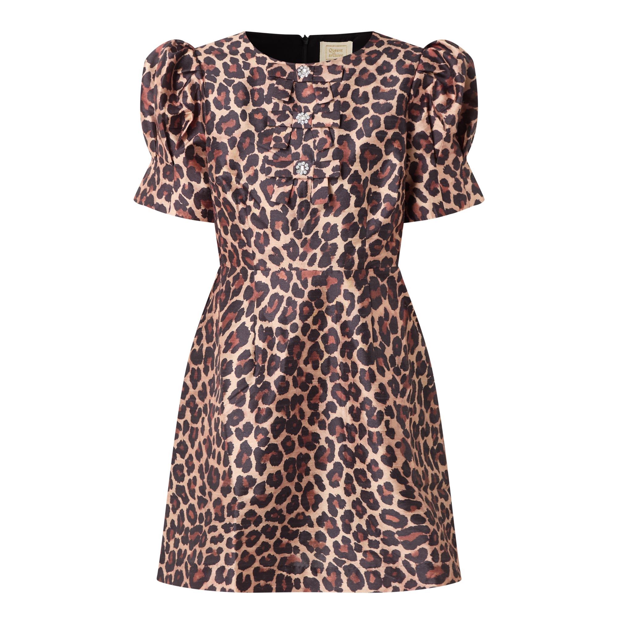 - Round neckline, short puff sleeves, three embellished bow details on the front, rear zip fastening, fitted through the waist, flared skirt, straight hem, leopard print pattern, mini length