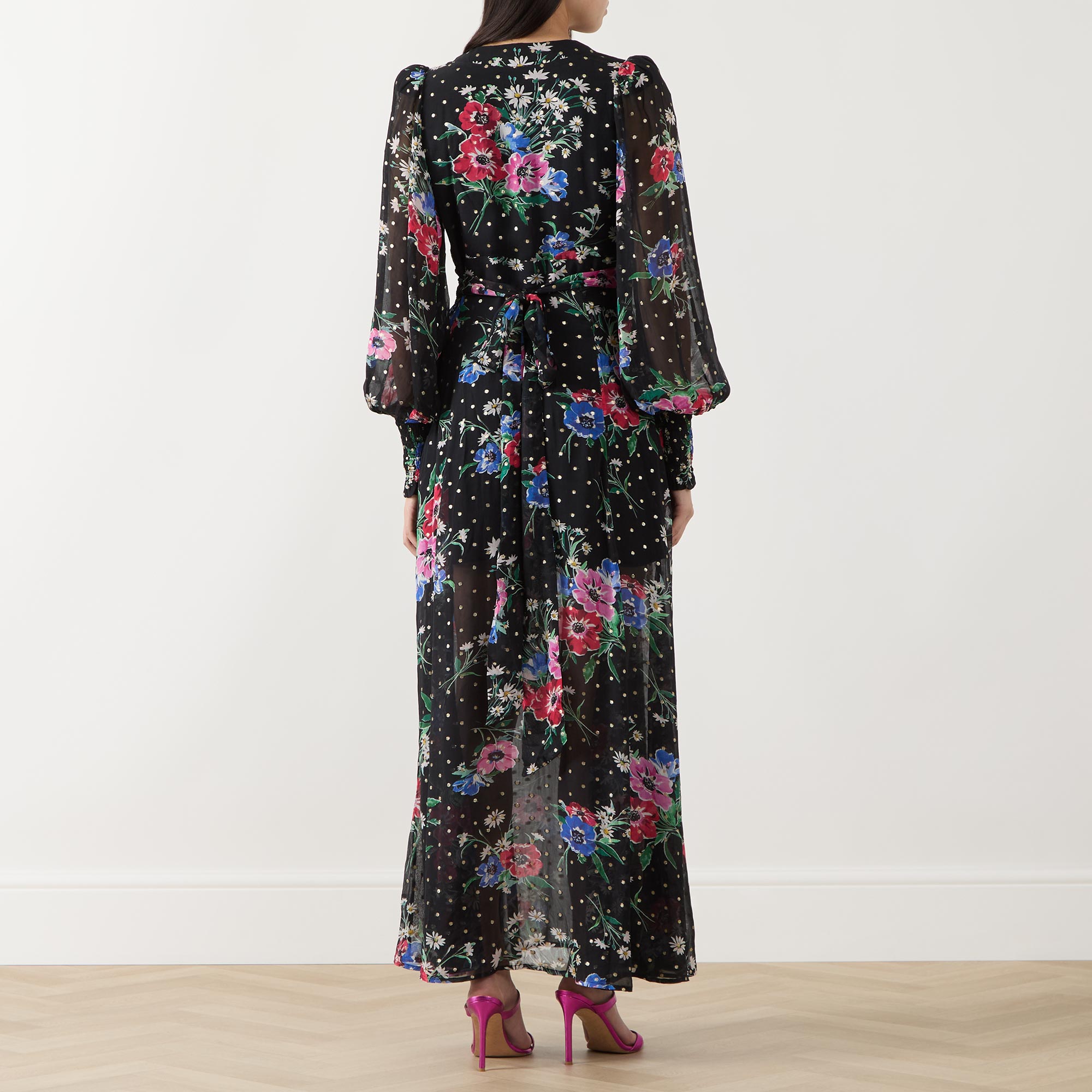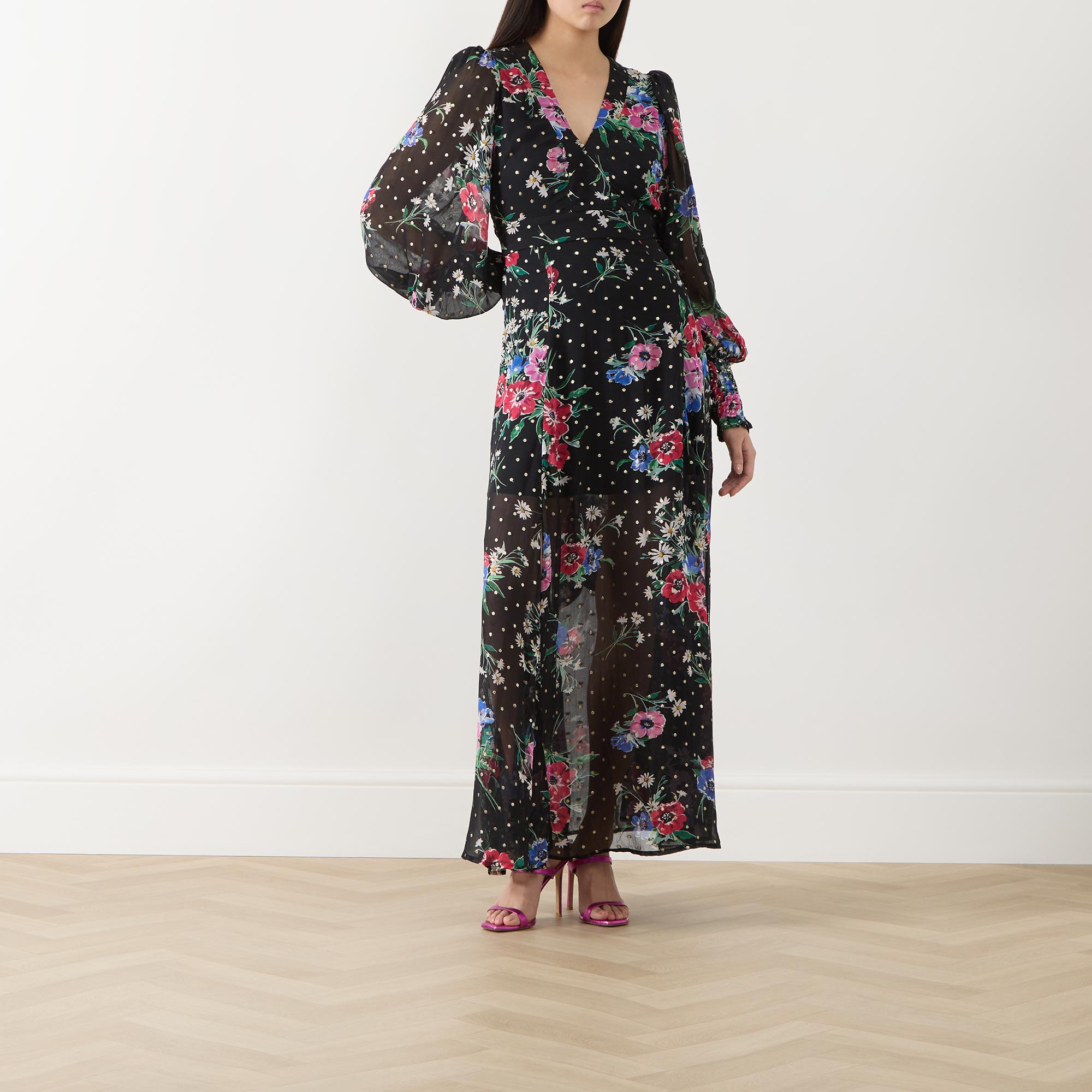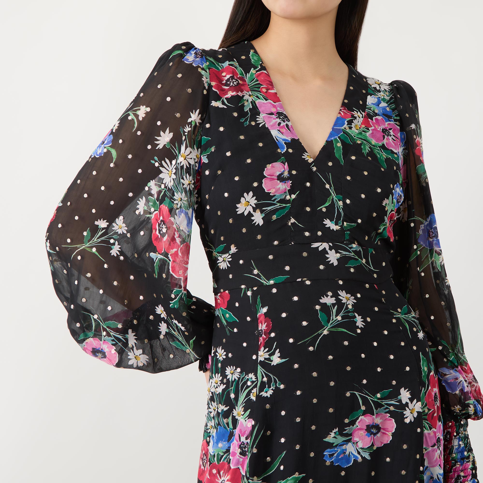 - Self-tying belt at side, puff sleeves, maxi length, V-neckline, florals and polka-dot pattern, semi-sheer panels