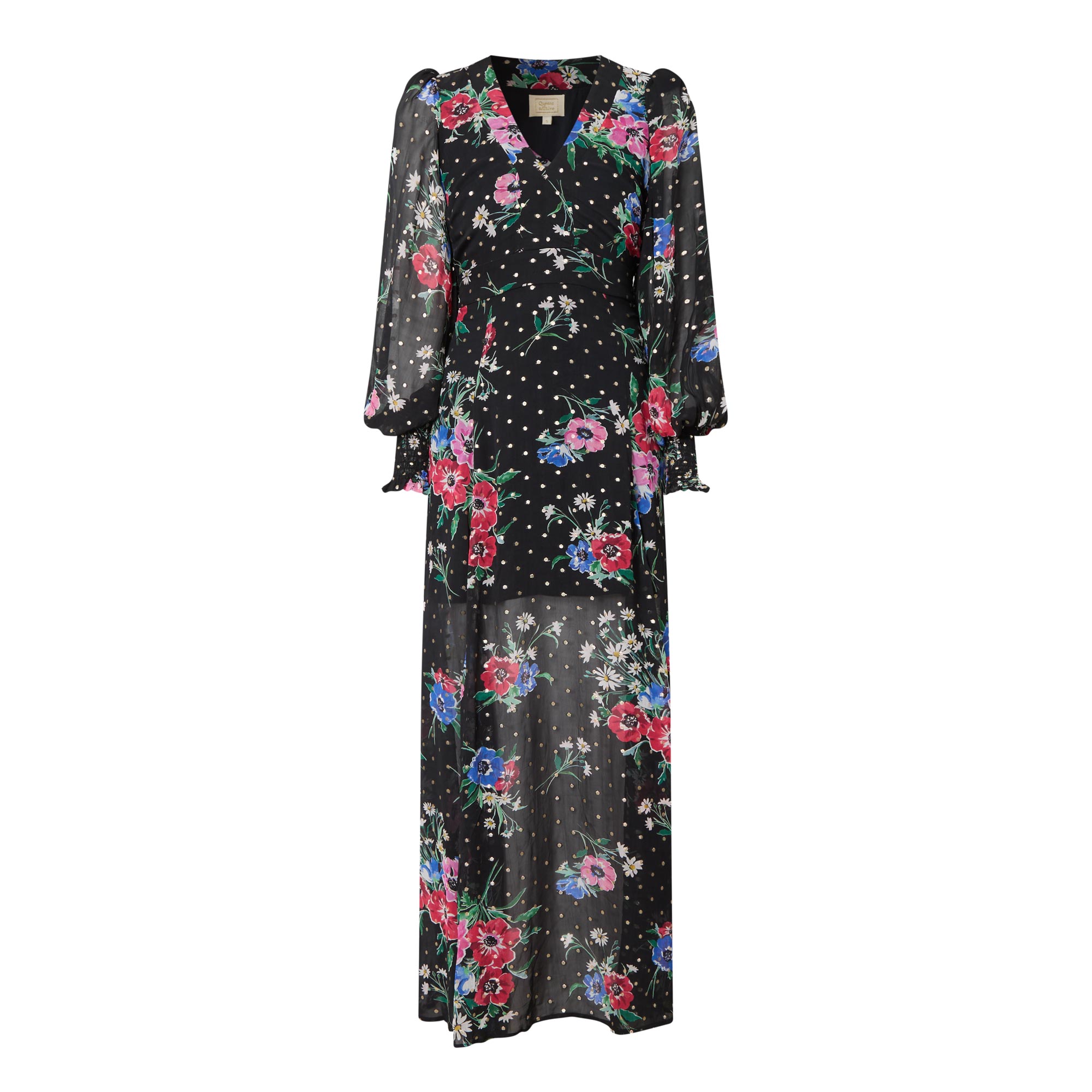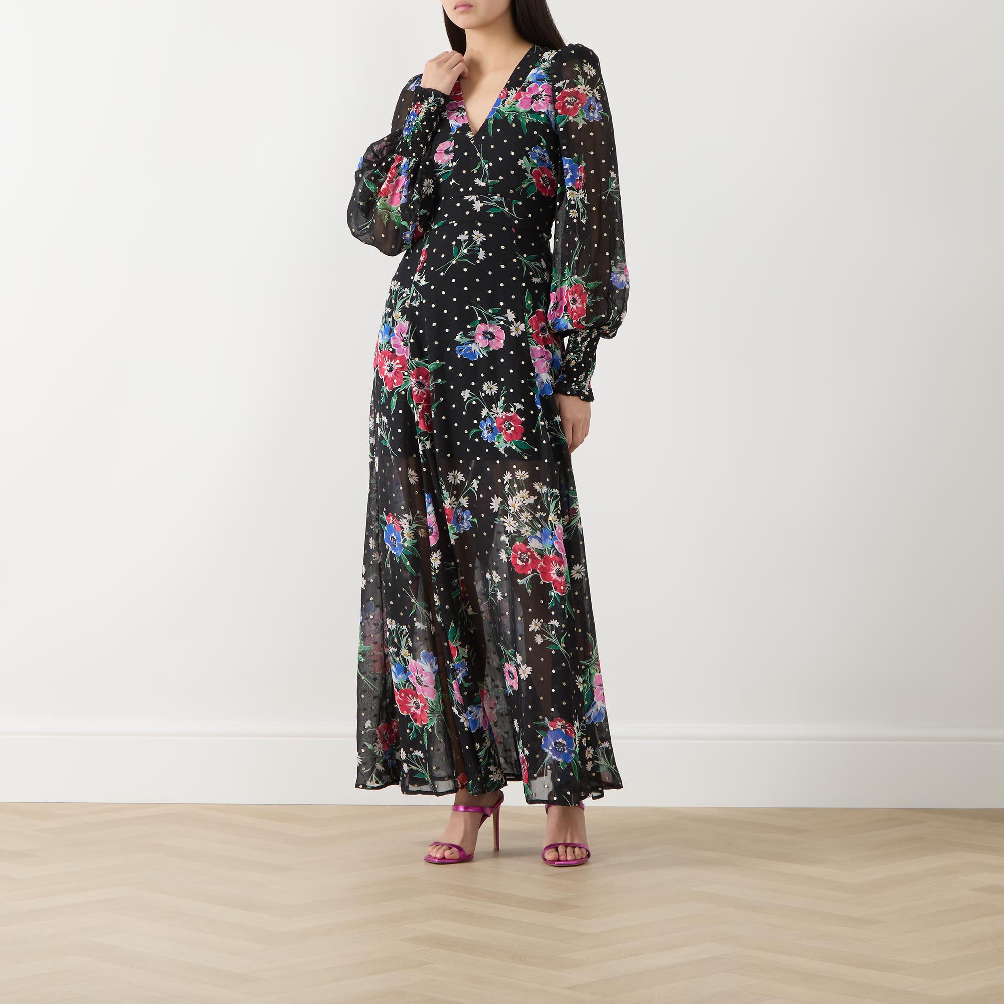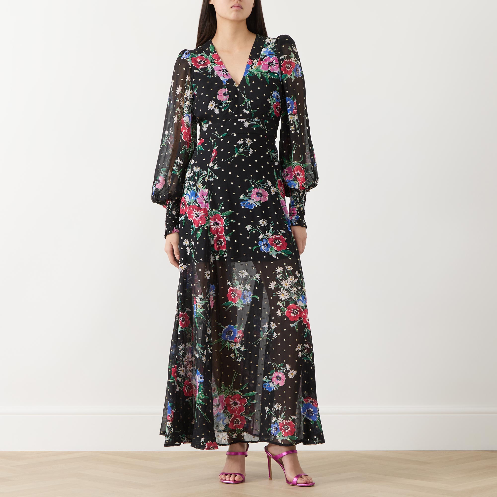 - Self-tying belt at side, puff sleeves, maxi length, V-neckline, florals and polka-dot pattern, semi-sheer panels