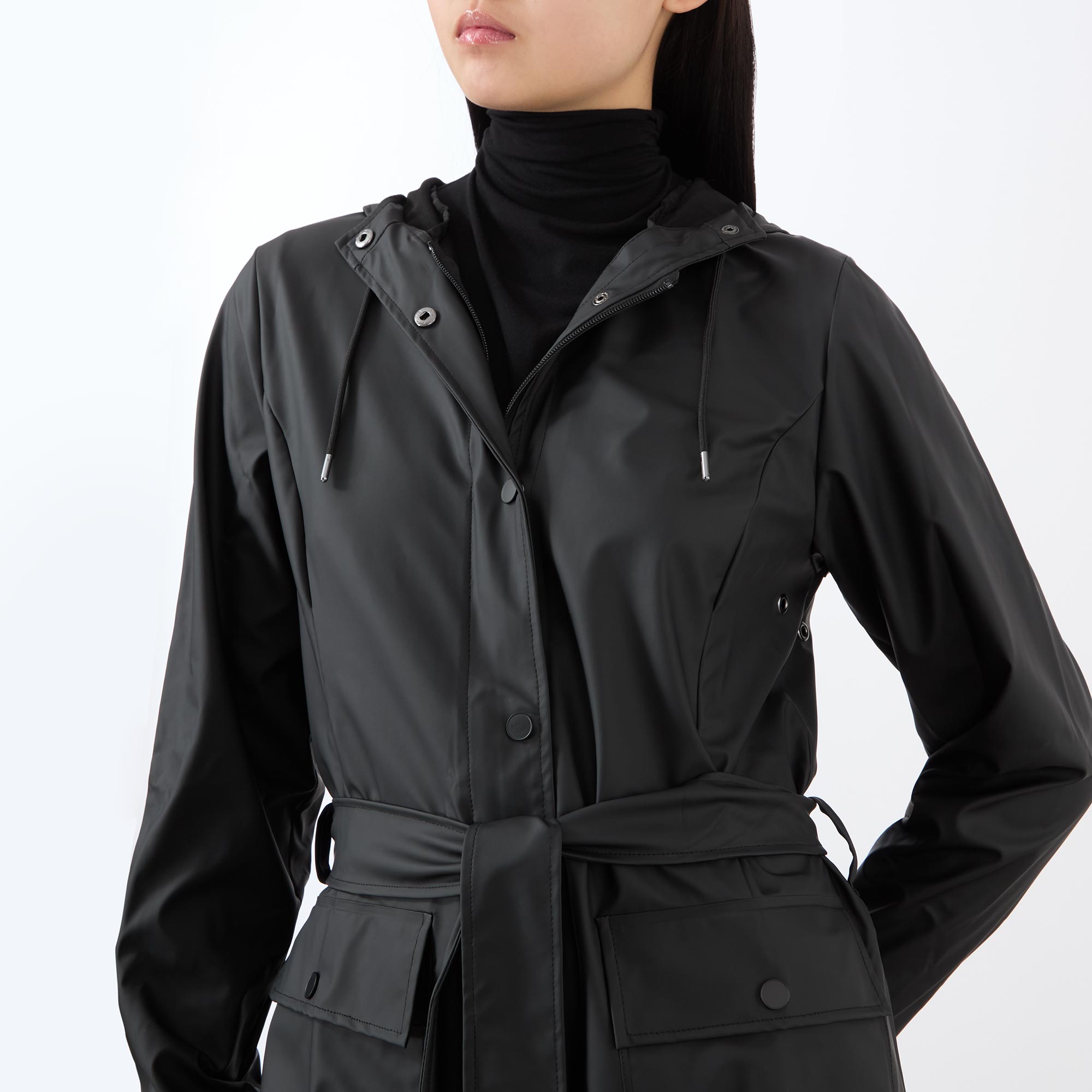 - Hood with built-in cap and drawstring fastening, long sleeves, adjustable snap button cuffs, under-arm ventilation eyelets, coated zip closure, concealed snap button placket, matching belt, two front flap pockets with snap fastenings, fishtail hem, welded seams, smooth finish