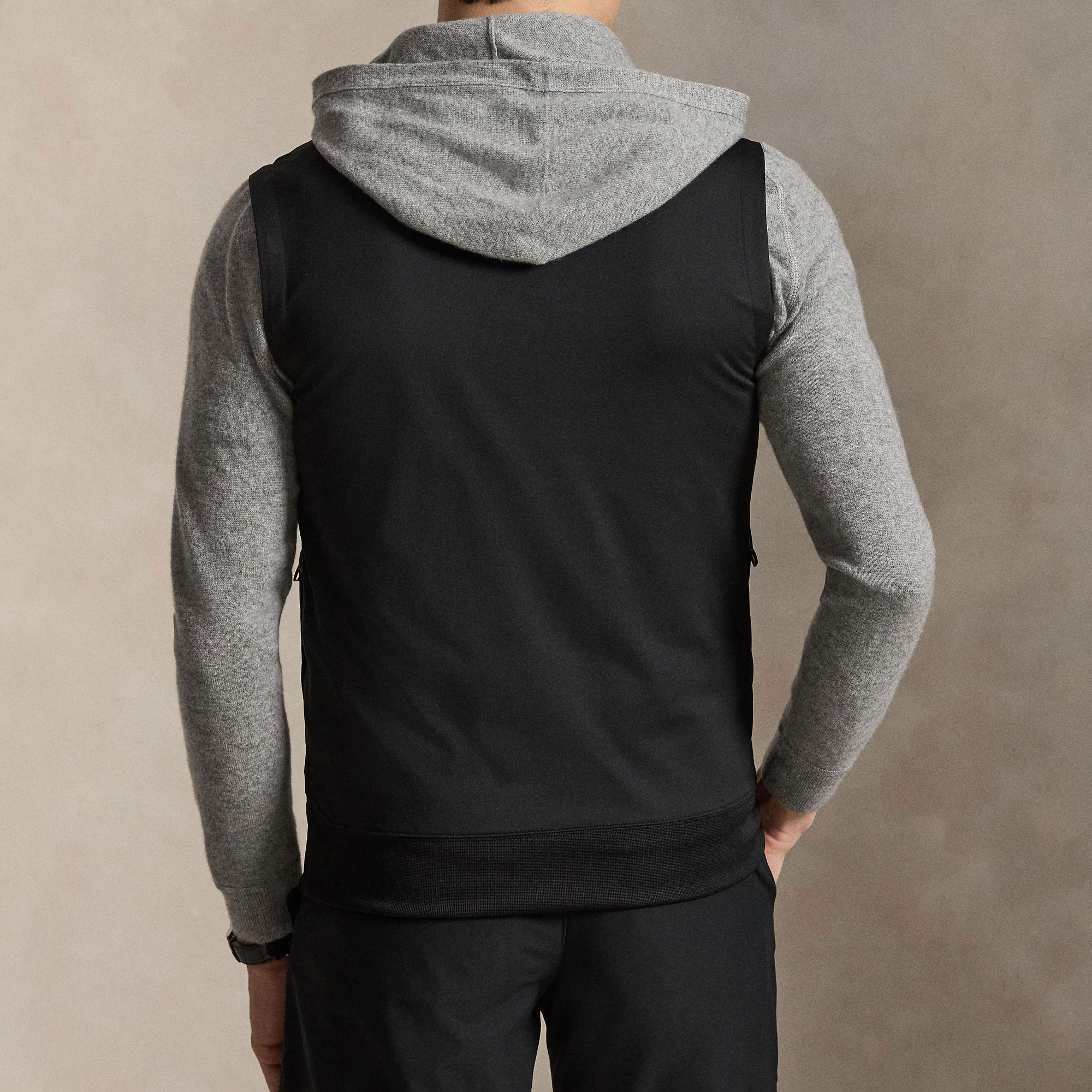 - Mock neckline, woven trim, quarter-zip placket, logo zip tabs, woven facing at the armholes, side on-seam zip pockets, silicone logo tab at nape, ribbed hem