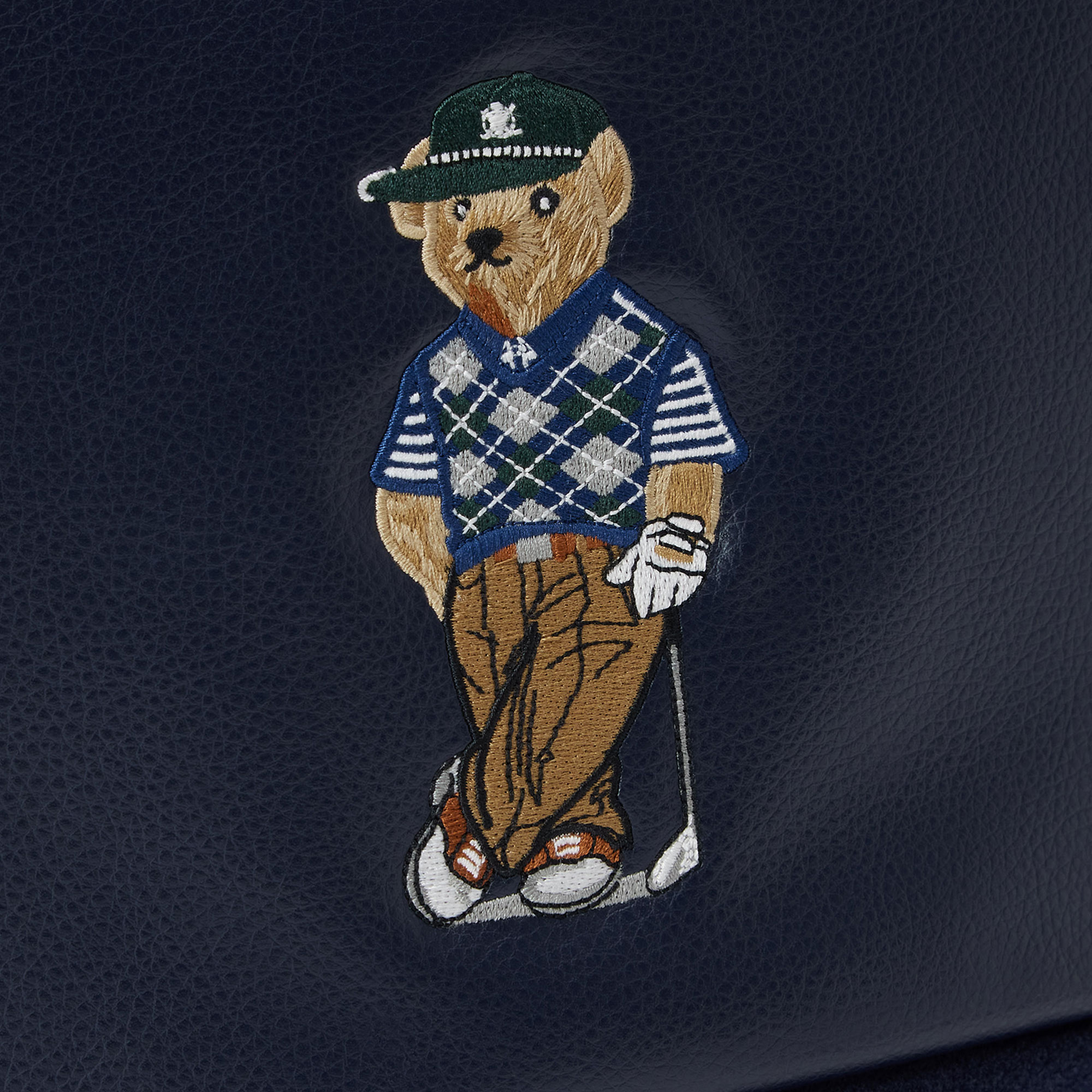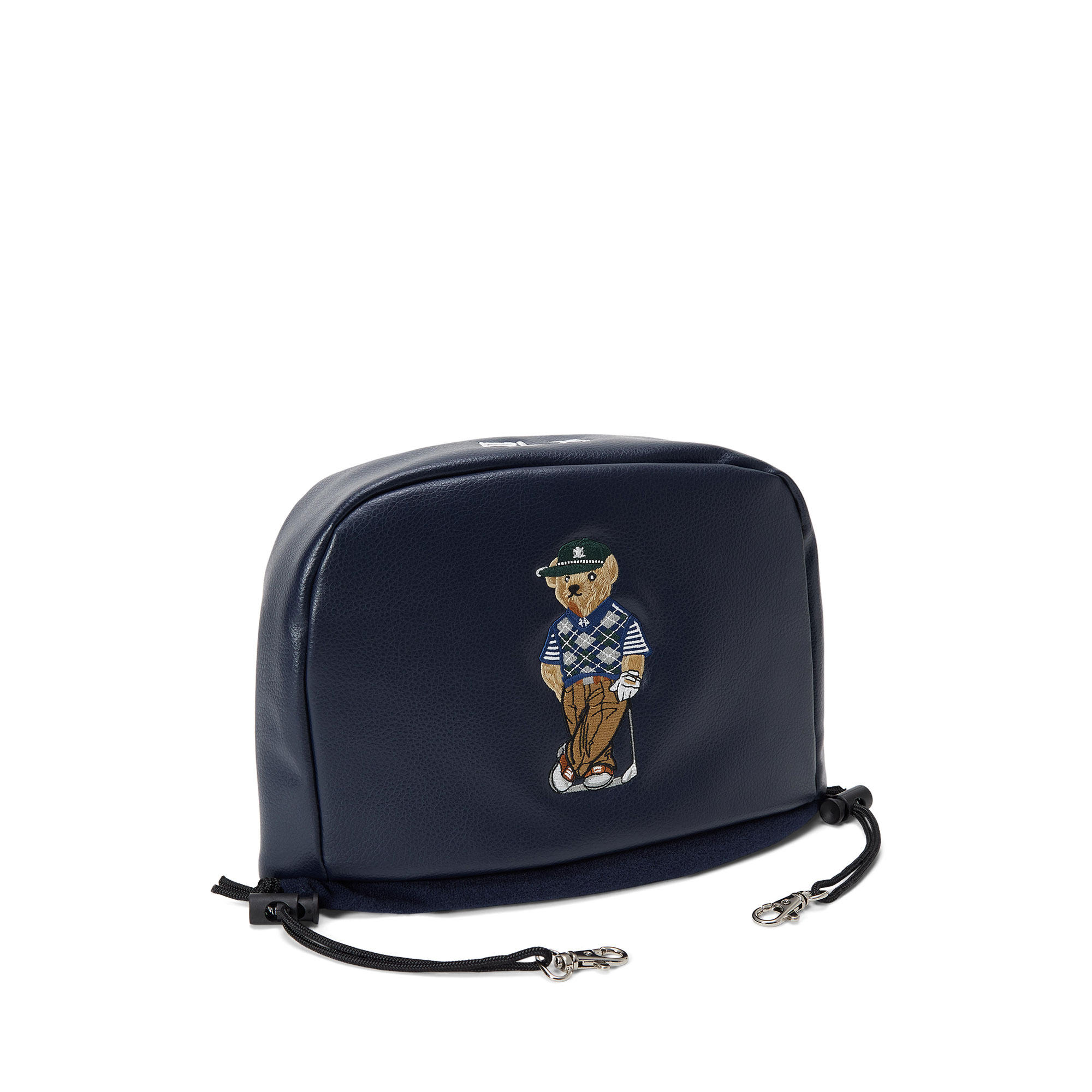 - Faux-leather exterior, full plush lining, drawstring closure with stopper, side clips, embroidered Polo Bear detail, protective golf iron cover