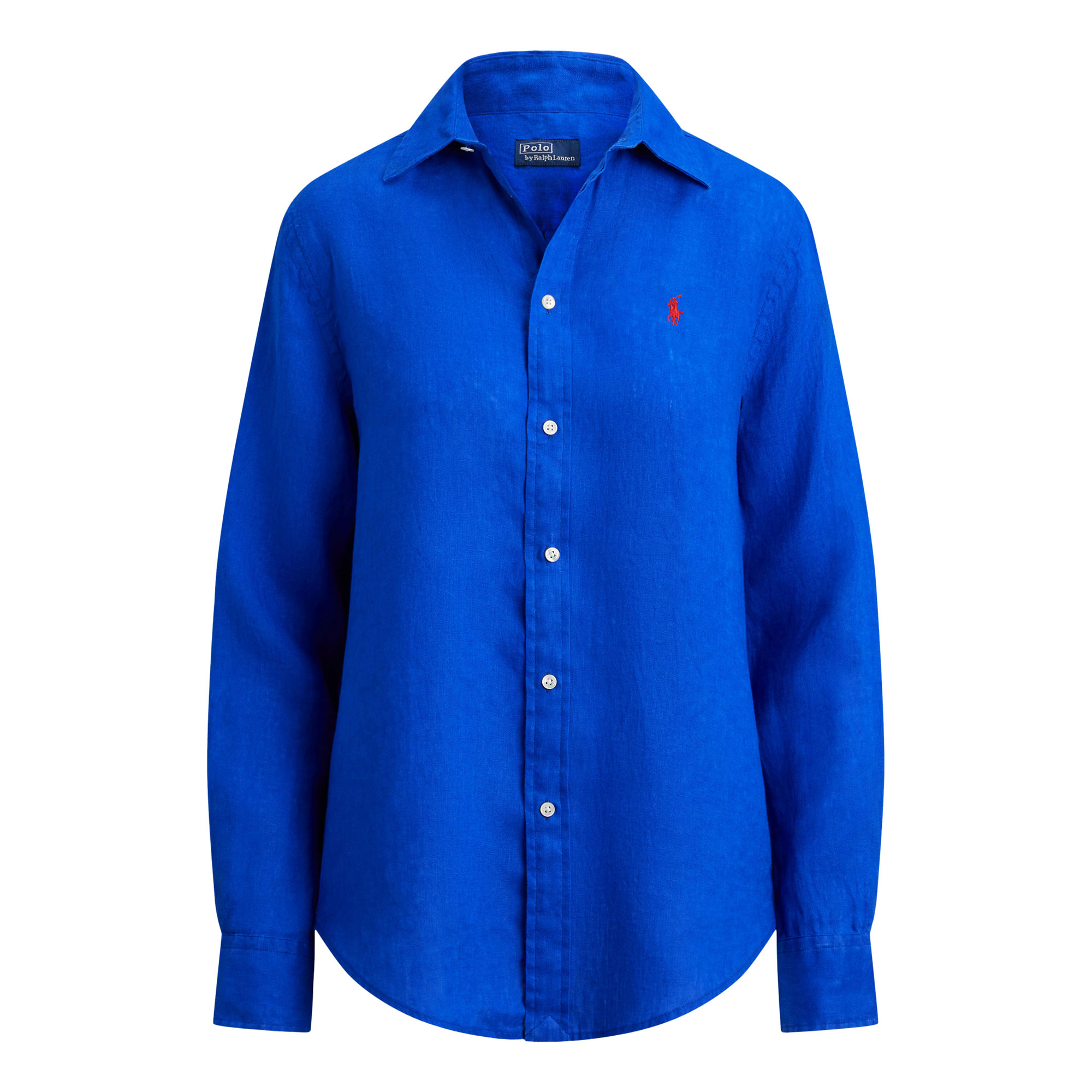 - Pointed collar, buttoned placket, shell buttons, long sleeves with buttoned barrel cuffs, box-pleated back yoke, shirttail hem, signature embroidered pony at the left chest